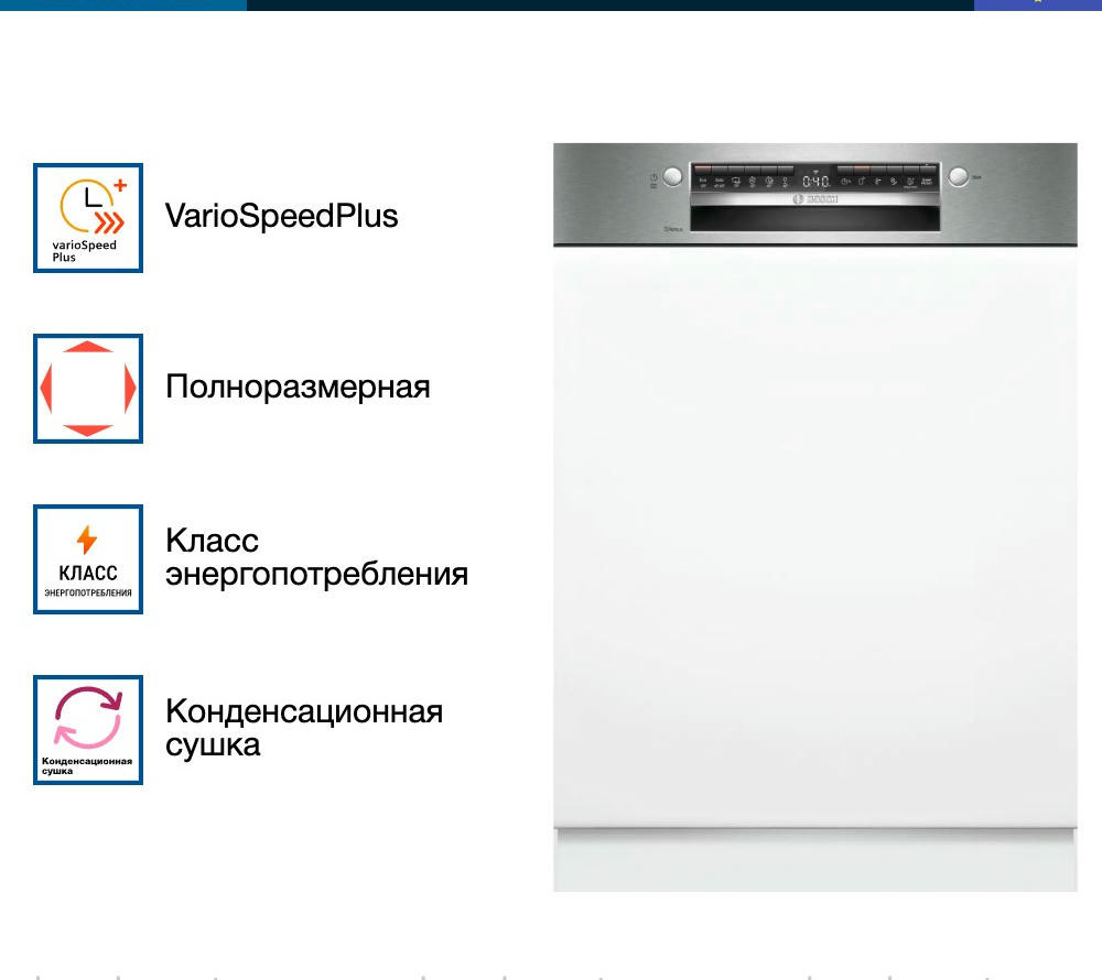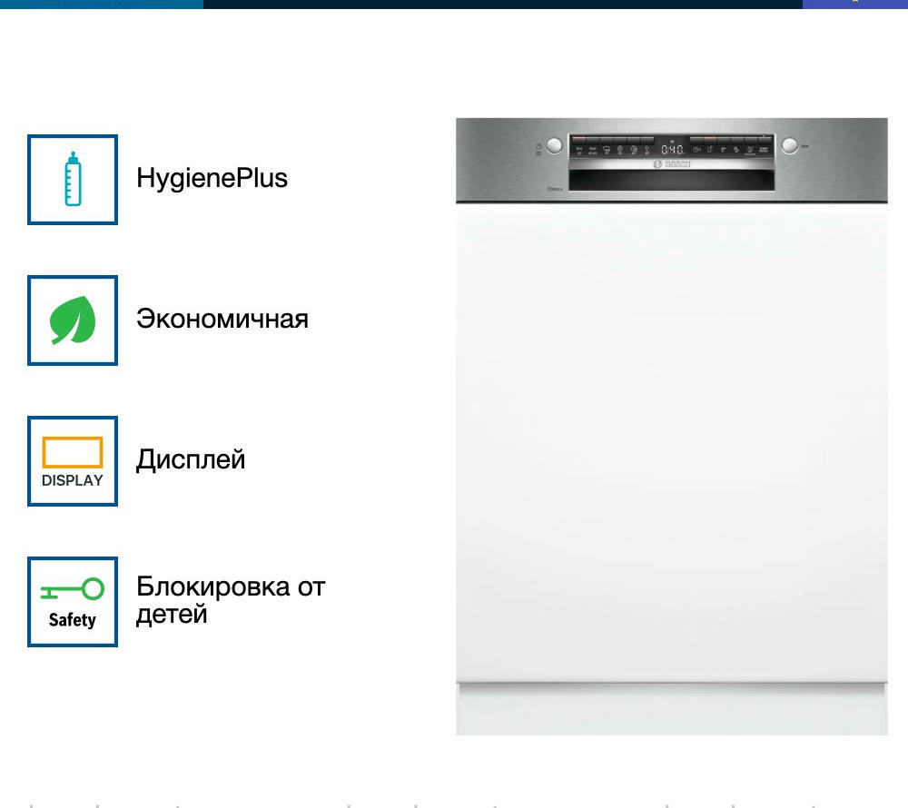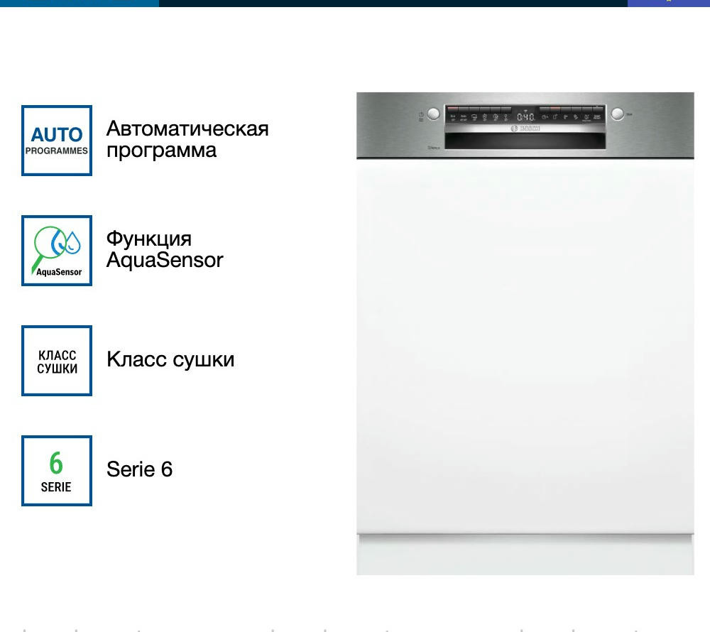 Также есть возможность удаленного запуска через приложение на смартфоне благодаря функции Home Connect. Индикаторы на панели информируют о наличии ополаскивателя и соли, а также о времени до окончания программы. Внутри машины три корзины для посуды, верхняя из которых переставляется по высоте для удобства размещения различных предметов. Блокировка от детей делают использование машины безопасным. Встроенный предохранительный клапан предотвращает возможные неполадки.