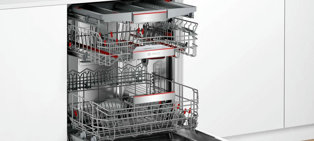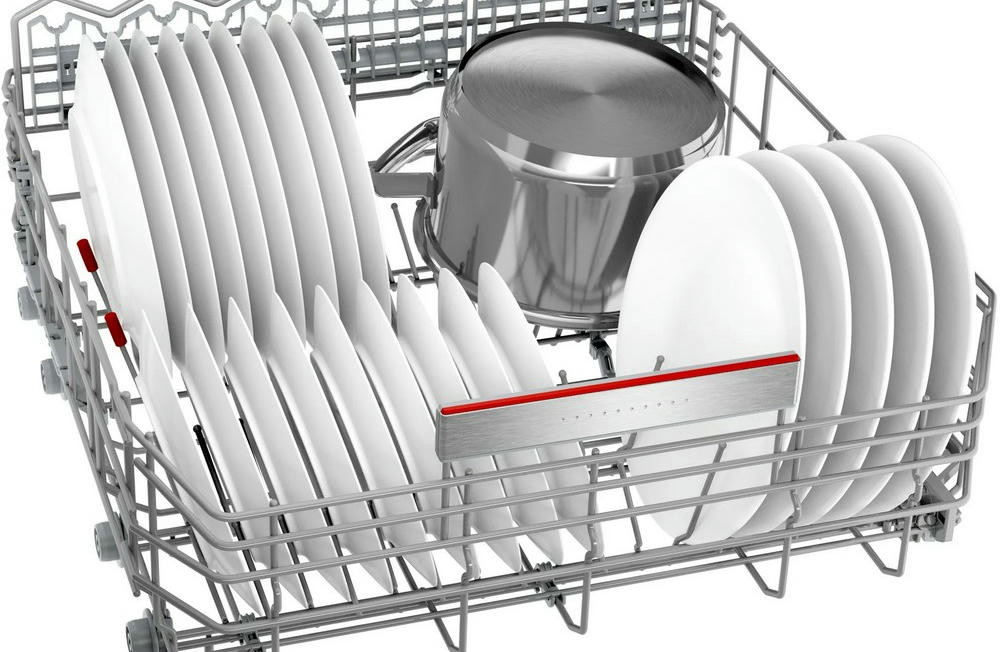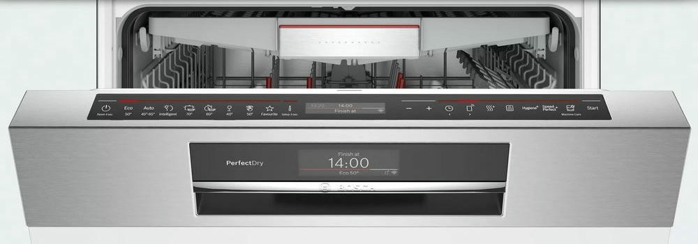 Встраиваемая посудомоечная машина Bosch SMI8YCS03E — премиальная модель шириной 59.8 см. Функция Home Connect позволяет удаленно управлять, диагностировать прибор и обновлять программное обеспечение. TimeLight проецирует на пол текущий этап программы, общую статусную строку и время до окончания программы. А также заменяет, скрытый на время работы, дисплей прибора. Фоновой подсветкой Emotion Light Pro можно управлять через приложение Home Connect, выбирая необходимый цвет.