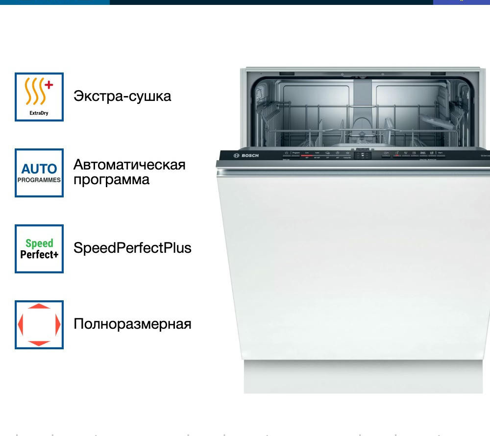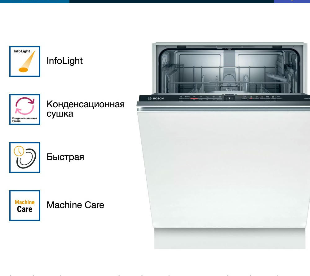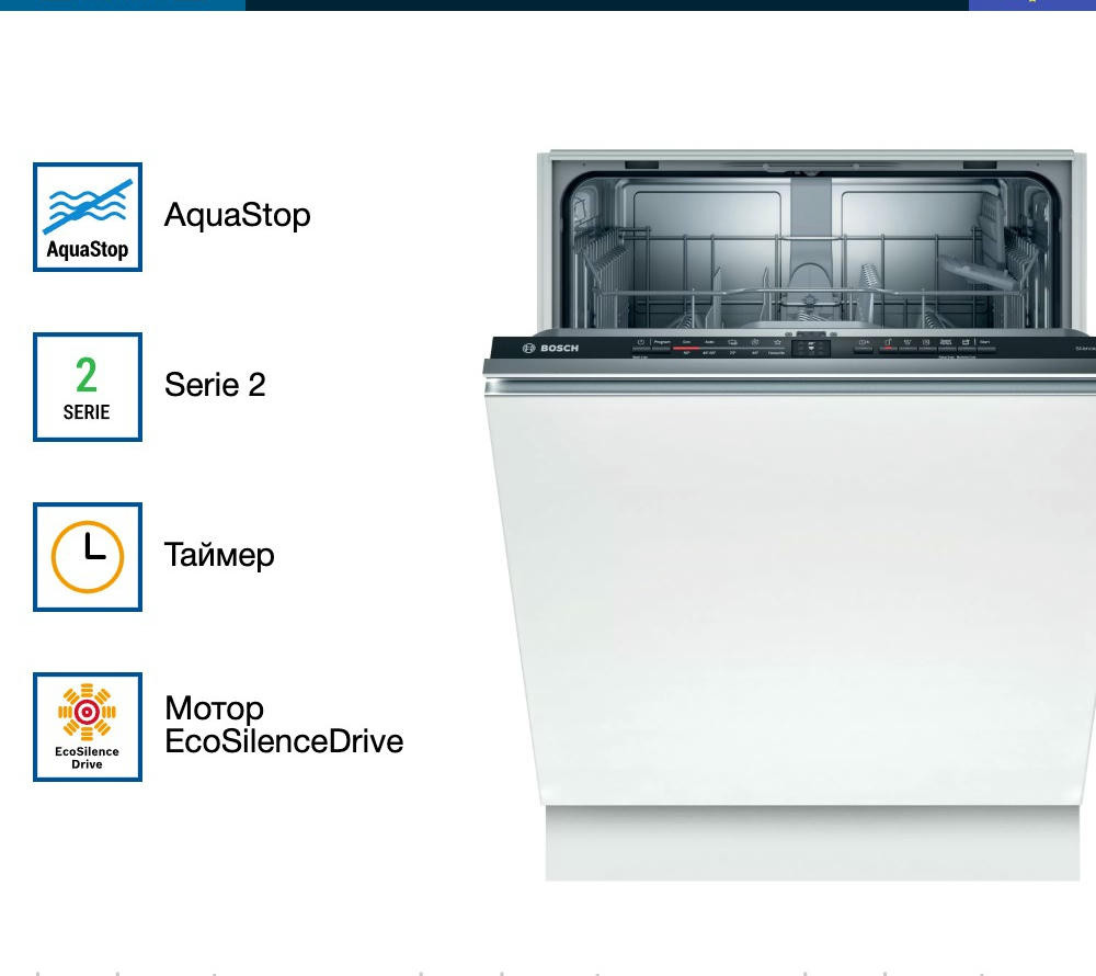 Встраиваемая посудомоечная машина Bosch SMV2ITX18E — это сочетание современного дизайна и инновационных технологий. Произведенная в Евросоюзе, эта модель оснащена полноразмерной вместительной камерой, в которую легко помещается до 12 комплектов посуды. Корпус машины выполнен из надежной нержавеющей стали и пластика, что гарантирует долгий срок службы устройства. Модель оснащена инверторным двигателем EcoSilence Drive, обеспечивающим тихую и эффективную работу. Это позволяет использовать посудомоечную машину в любое время, не беспокоясь о создании лишнего шума. Кроме того, встроенная система AquaStop обеспечивает полную защиту от протечек, автоматически блокируя подачу воды при обнаружении утечки. Благодаря пяти стандартным программам и пяти температурным режимам, Bosch SMV2ITX18E позволяет выбрать наиболее подходящий режим для каждого типа посуды. Быстрая программа идеально подойдет для ежедневного использования, экономичная поможет сэкономить воду и электроэнергию, а интенсивная справится даже с самыми стойкими загрязнениями. Также есть возможность выбрать режим половинной загрузки или использовать функцию SpeedPerfectPlus для ускорения процесса мытья. Дизайн панели управления выполнен в строгом черном цвете. Кнопки управления и дисплей делают использование машины простым и удобным. На дисплее отображается информация о выбранной программе, времени до окончания работы и наличии ополаскивателя и соли. Также на полу проецируется луч InfoLight, который показывает, работает ли машина в данный момент. Устройство оборудовано двумя корзинами для удобной загрузки посуды. Встраиваемая посудомоечная машина Bosch SMV2ITX18E обладает классом энергопотребления A++, что делает ее экономичной и экологичной.
