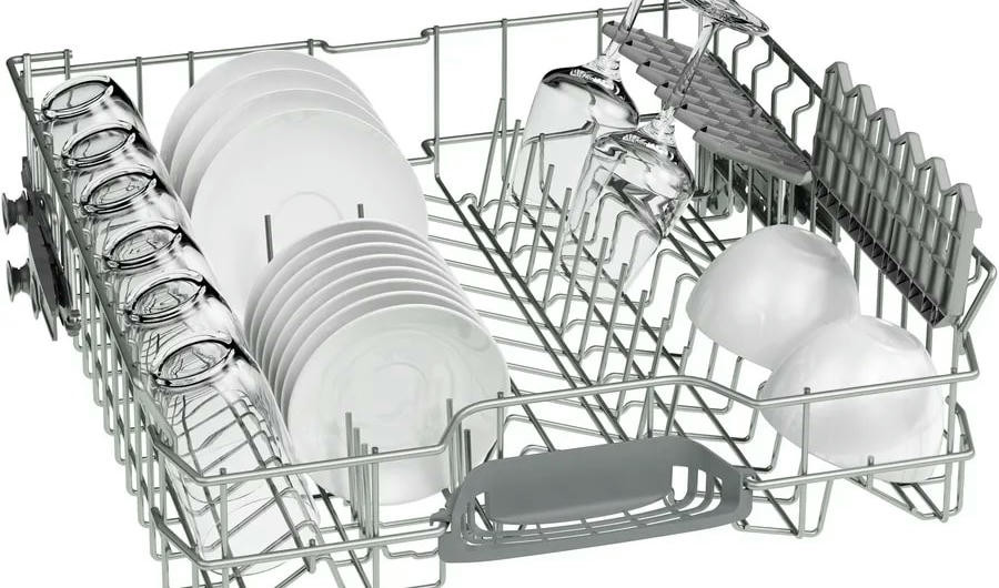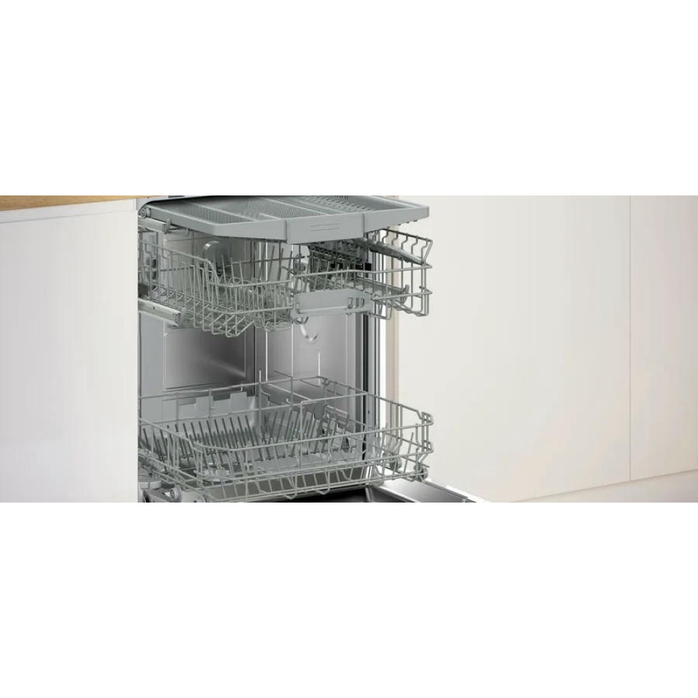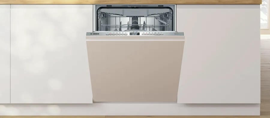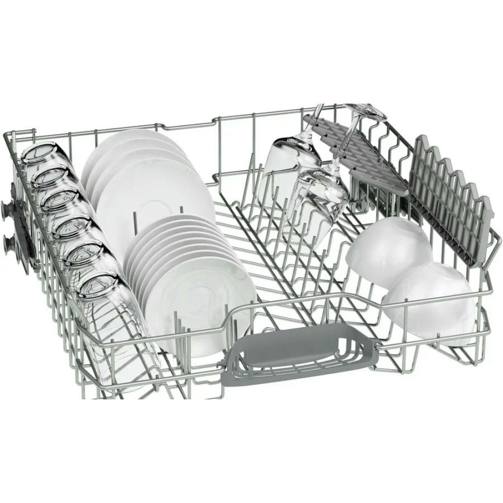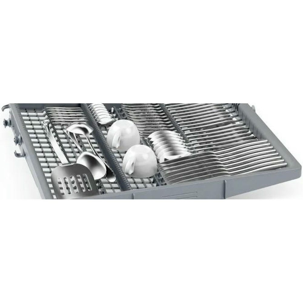 Встраиваемая посудомоечная машина Bosch SMV4EVX11E серии Serie 4 объединяет строгие линии и продуманную функциональность: фронтальная панель управления выполнена из нержавеющей стали, а закрытая панель скрывает органичную компоновку кнопок и информативный дисплей. Внутреннее пространство из нержавеющей стали обеспечивает гигиеничность и долговечность, при этом наличие трёх корзин и продуманная конфигурация полочек позволяют разместить до 14 комплектов посуды в одном цикле. Верхний короб регулируется по высоте с помощью системы Rackmatic-3, а две складные направляющие и дополнительные полочки для чашек дают гибкость при загрузке нестандартных предметов. Материал бака и эргономика внутренней компоновки рассчитаны на интенсивную эксплуатацию, при этом изделие весит всего 34.4 кг и вписывается в типовую нишу 81.5–87.5 х 60 х 55 см.