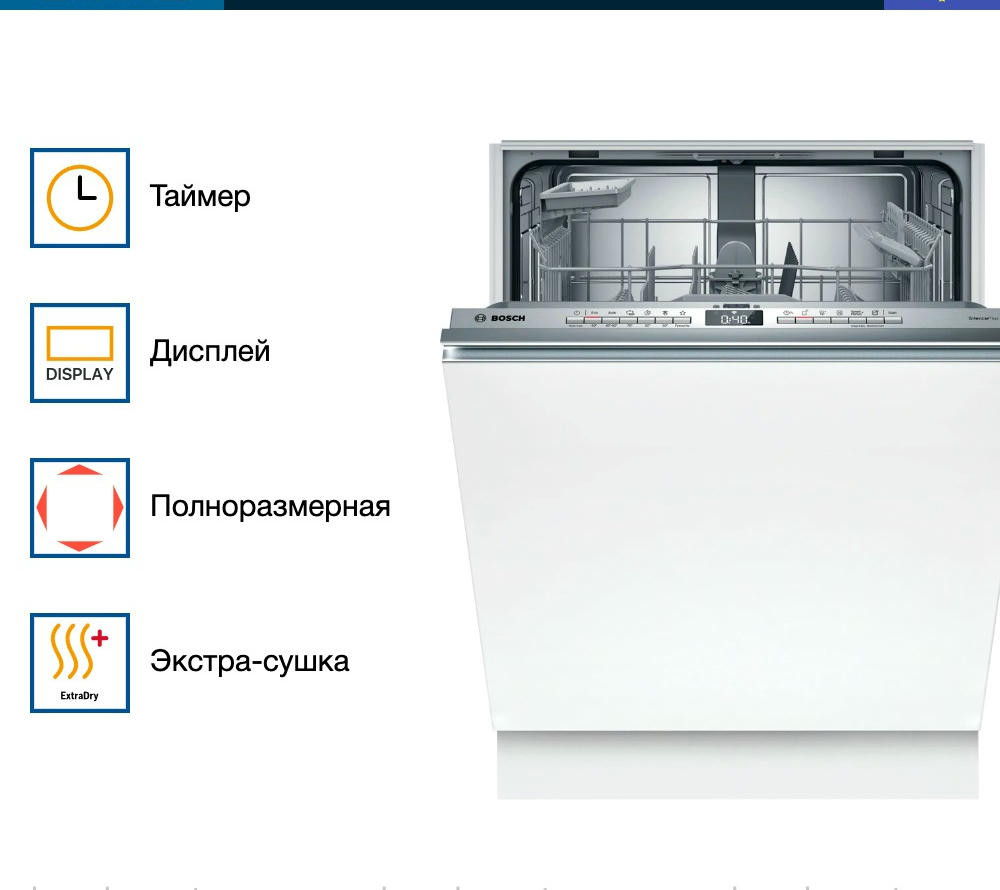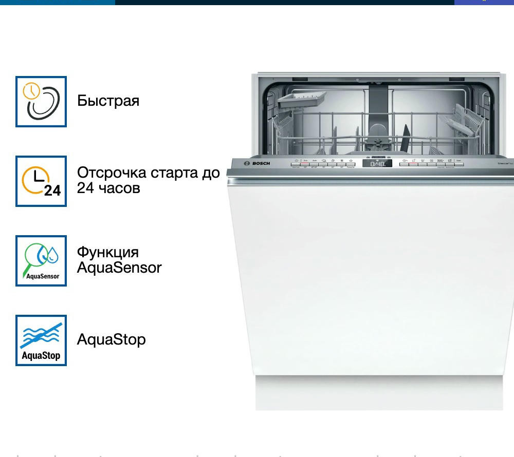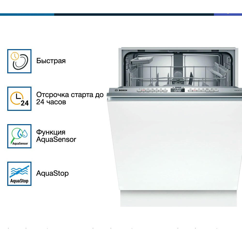 Встраиваемая посудомоечная машина Bosch SMV4HAX48E — современная модель с загрузкой в 13 комплектов. Прибор оснащен индикацией InfoLight на полу отображается красный луч, который показывает работает ли устройство или оно уже закончило работу. С помощью избранной программы вы можете легко настроить наиболее часто используемую конфигурацию. Home Connect позволяет управлять устройством прямо с вашего смартфона удаленно. Система Aqua Stop полностью защищает от любых протечек.