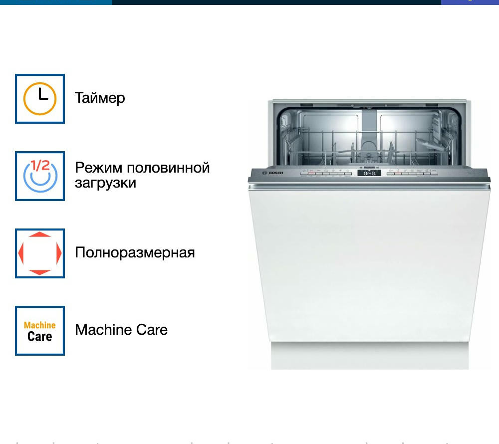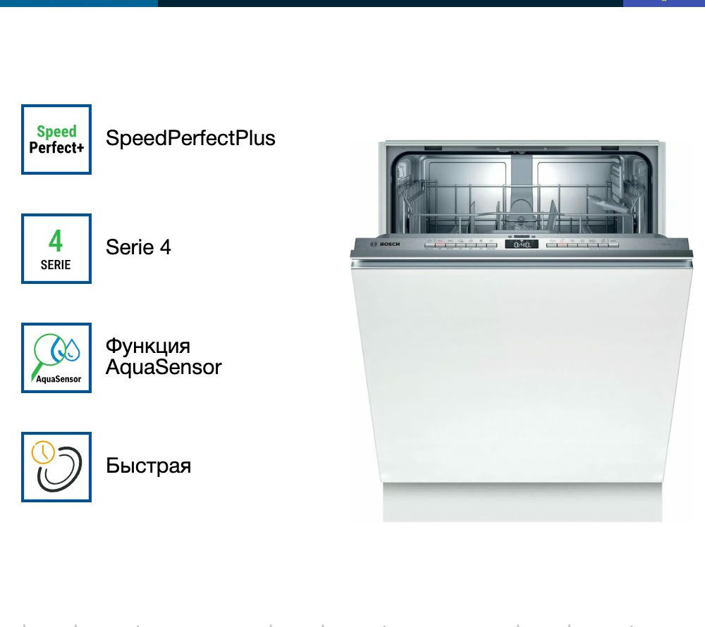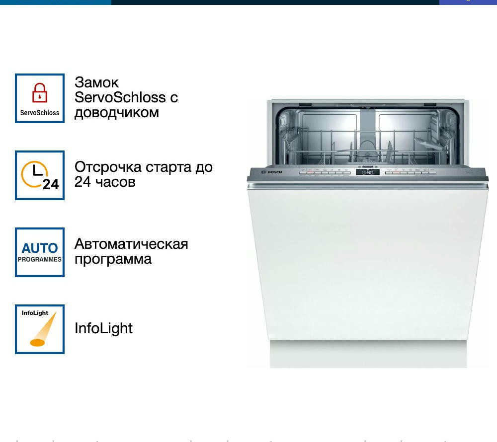К встраиваемой посудомоечной машине Bosch SMV4HTX24E можно подключаться через Home Connect и управлять устройством через смартфон, что очень удобно. Красный информационный индикатор на полу InfoLight покажет, включен ли ваш прибор. Таймер позволит отложить процесс мытья от 1 до 24 часов.