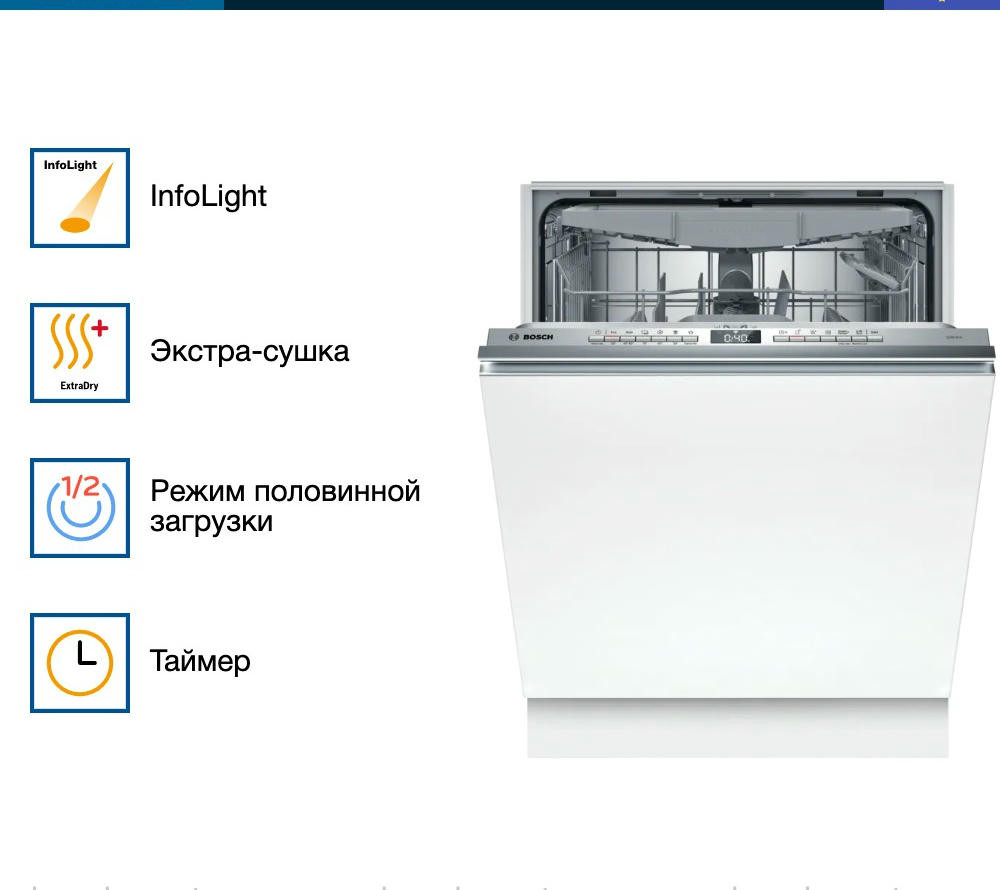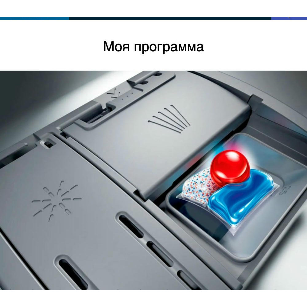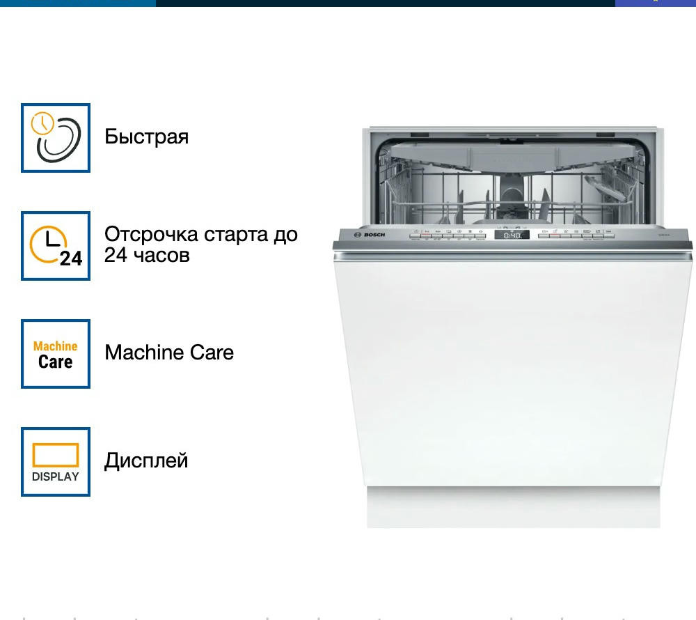 Модель оснащена тремя корзинами и переставляемым по высоте верхним коробом, что позволяет загружать до 14 комплектов посуды. Верхний короб оборудован полочкой для чашек, а направляющие для тарелок предусмотрены как в верхнем, так и в нижнем коробе. Система AquaStop и полная защита от протечек обеспечивают безопасность использования. Внутренний резервуар выполнен из нержавеющей стали и пластика, что гарантирует его долговечность и надежность. Техника Bosch поддерживает функцию Home Connect, позволяя управлять устройством через приложение на смартфоне. Также есть возможность отсрочки запуска от 1 до 24 часов. Индикаторы наличия ополаскивателя и соли, а также луч на полу InfoLight делают использование устройства еще более удобным.