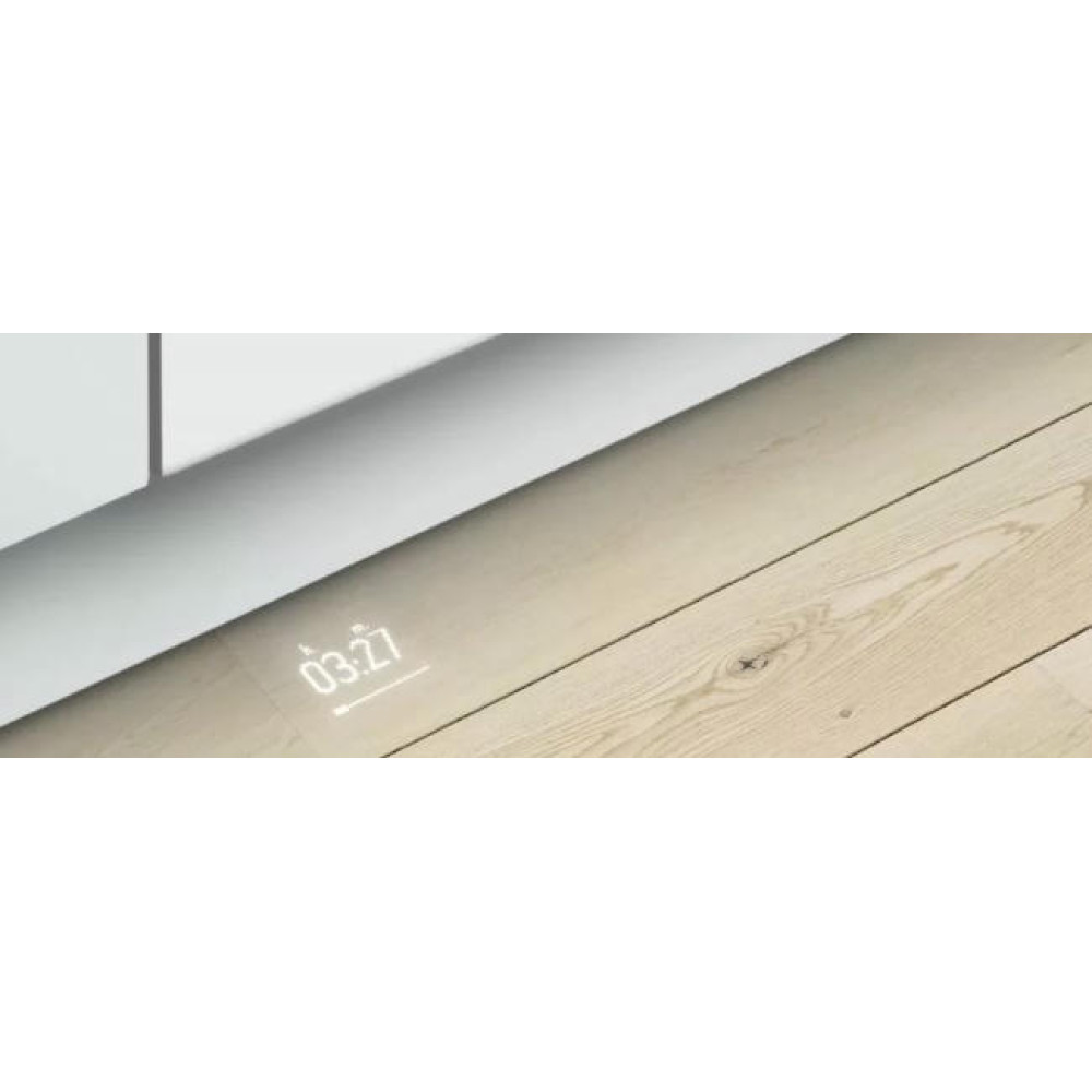 Управление осуществляется через закрытую панель с сенсорными кнопками и дисплеем. Также доступен удаленный запуск через приложение на смартфоне благодаря функции Home Connect. Индикаторы наличия ополаскивателя и соли, а также времени до окончания программы помогают контролировать процесс мойки. Луч на полу TimeLight отображает оставшееся время до окончания программы. Посудомоечная машина оснащена системой AquaStop, которая предотвращает протечки, и частичной защитой от протечек. Внутренний резервуар выполнен из нержавеющей стали, что гарантирует долговечность и надежность машины.