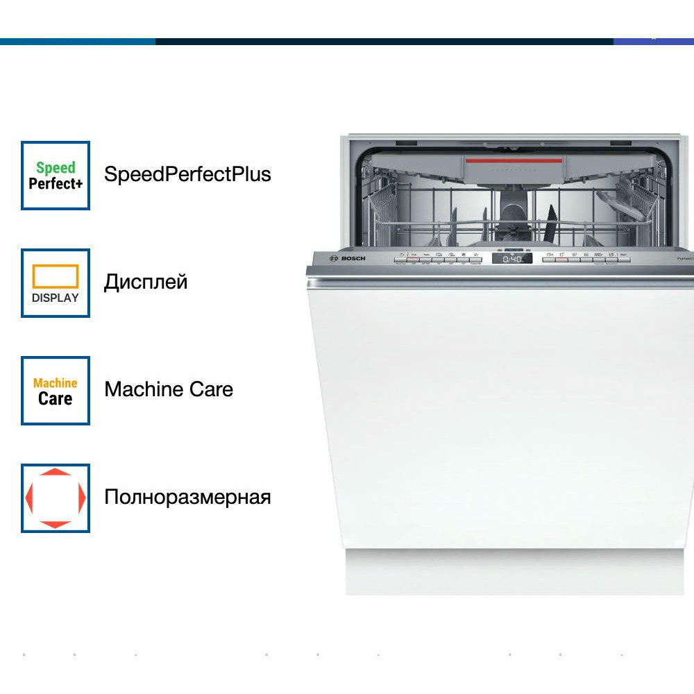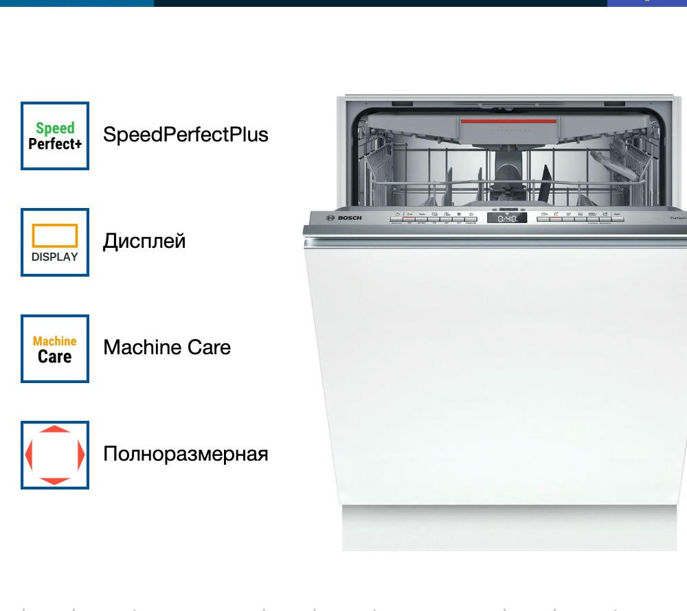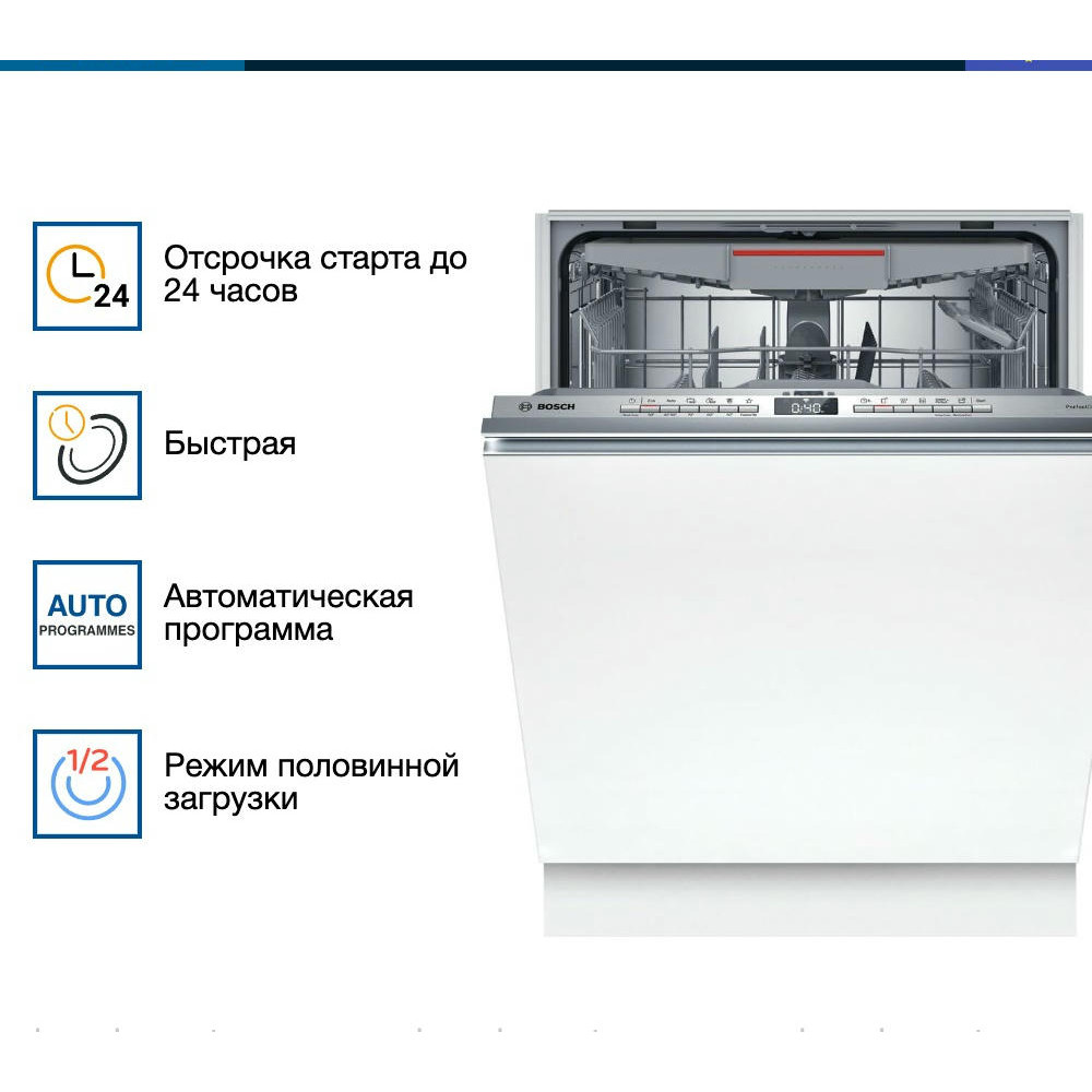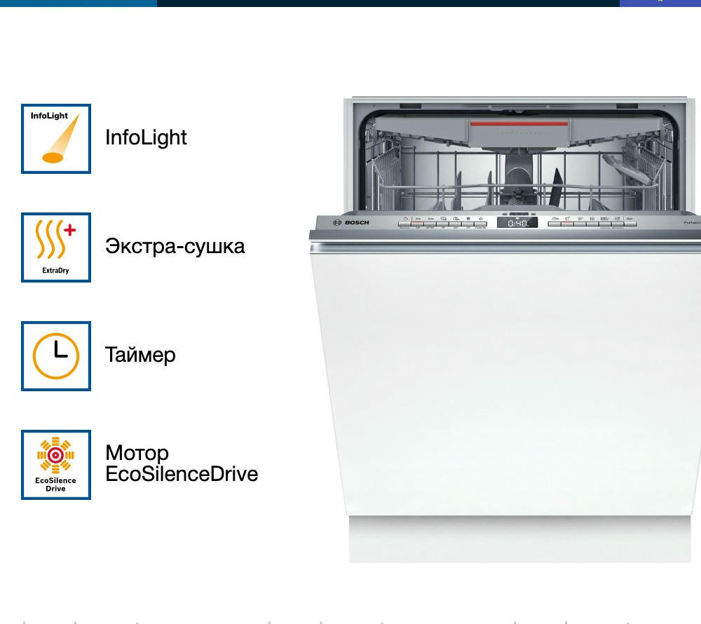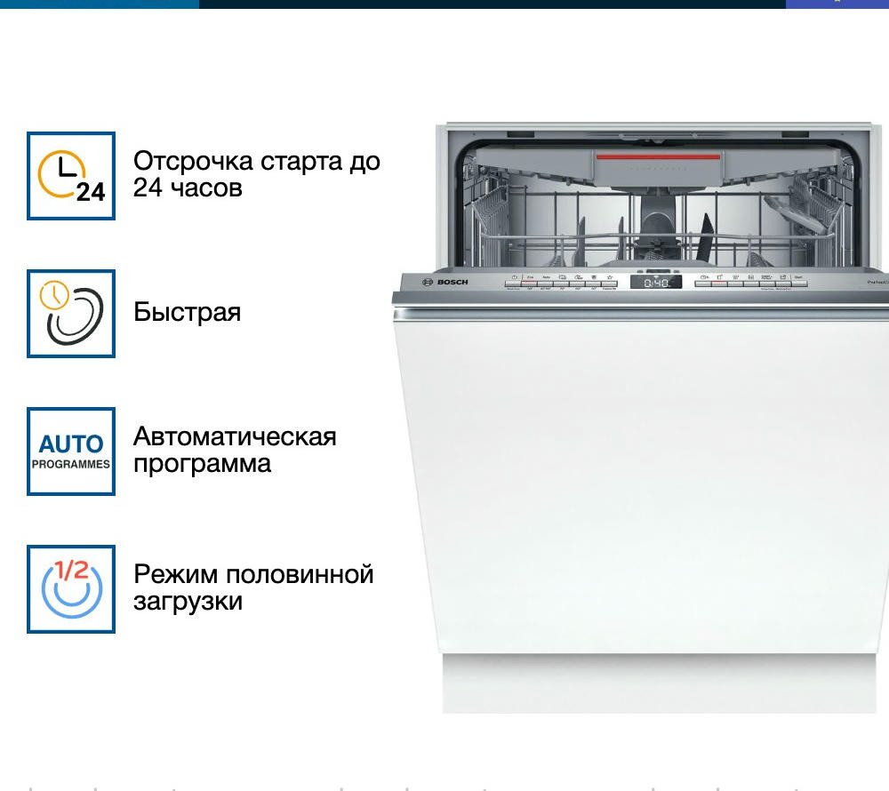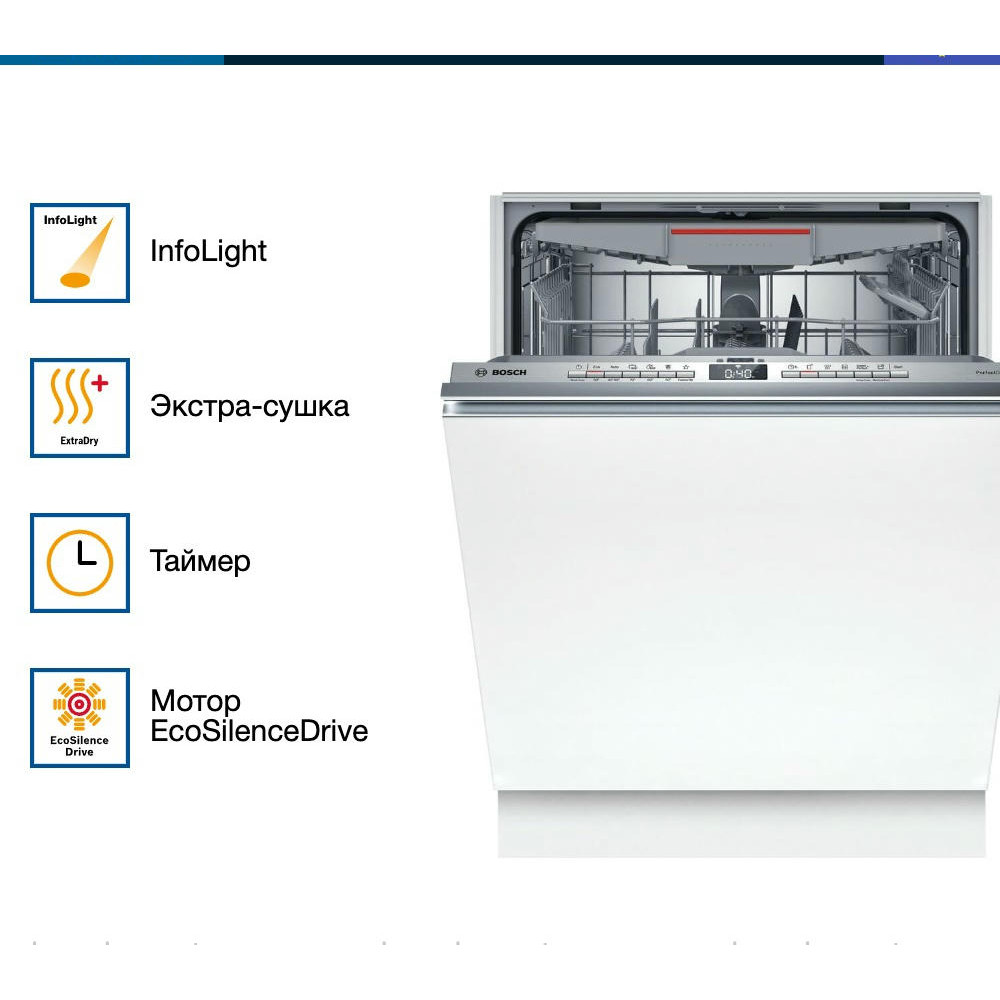 Встраиваемая посудомоечная машина Bosch SMV6ZCX00E оснащена тихим мотором EcoSilence Drive, он отличается долговечным сроком службы с гарантией в 10 лет. Технология Home Connect позволяет управлять устройством отдаленно с помощью вашего смартфона. DosageAssist — это специальный отсек на верхнем коробе, в который попадает таблетка моющего средства в процессе мытья.