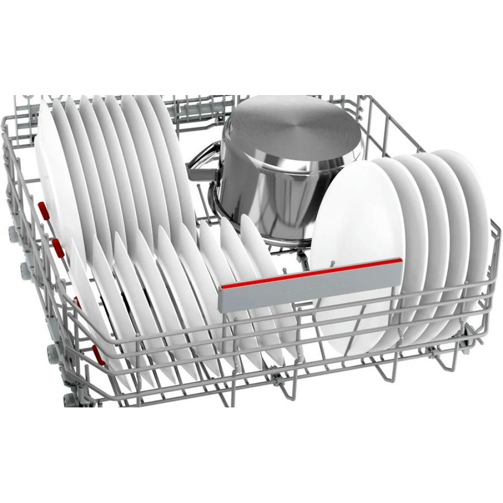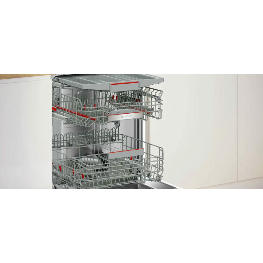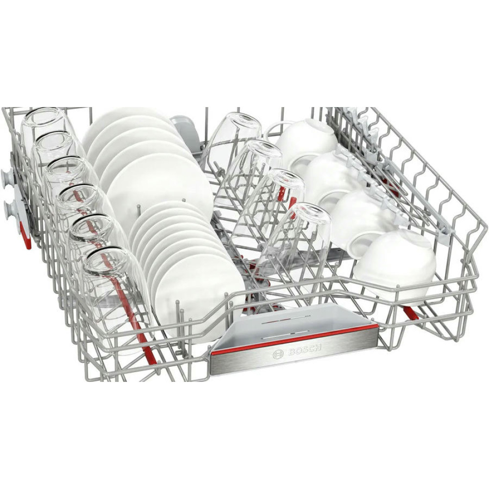 Модель оснащена тремя корзинами, верхний короб которых можно регулировать по высоте с помощью системы Rackmatic-3. В каждом коробе предусмотрены складные направляющие для тарелок и полки для чашек, что позволяет оптимизировать пространство и разместить максимальное количество посуды. Посудомоечная машина Bosch SMV6ZCX16E оборудована системой AquaStop и имеет полную защиту от протечек. В случае обнаружения утечки воды, система автоматически перекрывает подачу воды, предотвращая возможные затопления. Внутренний резервуар выполнен из нержавеющей сталь, что обеспечивает долговечность и надежность работы машины. При этом модель имеет класс энергопотребления B, класс мытья A и класс сушки A, что делает ее эффективной и экономичной в использовании.