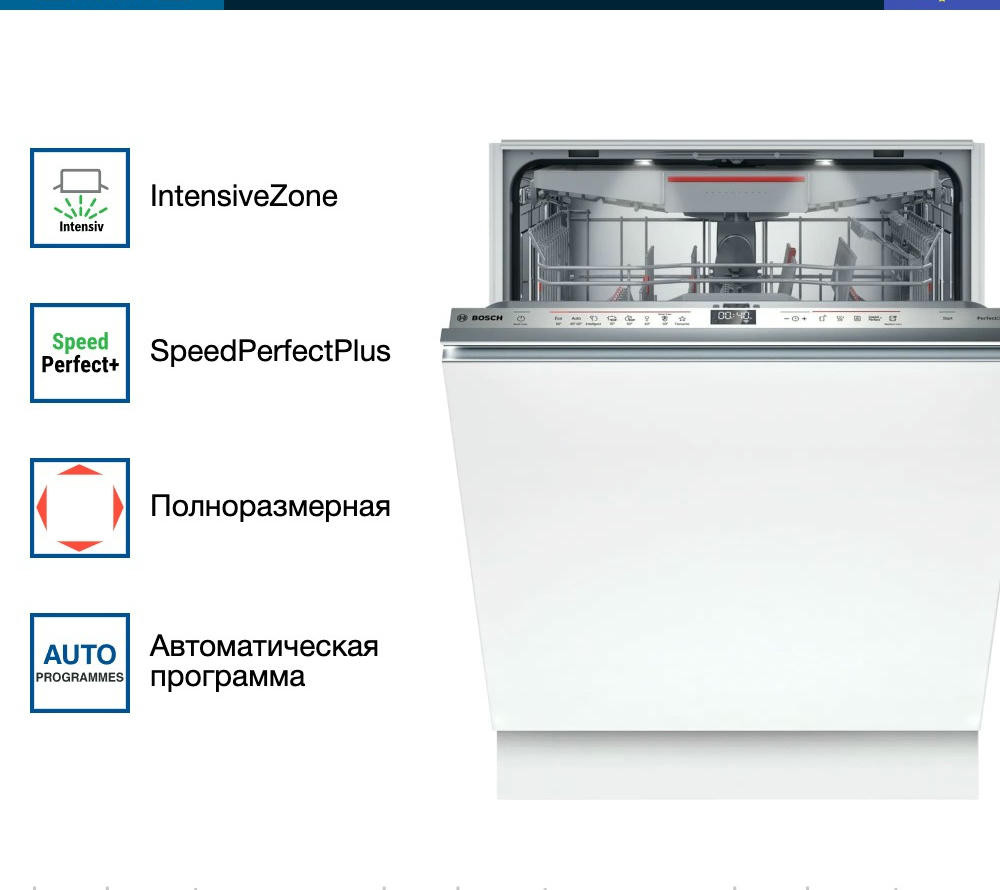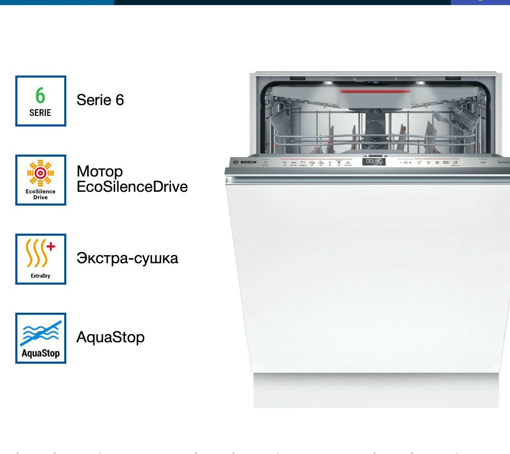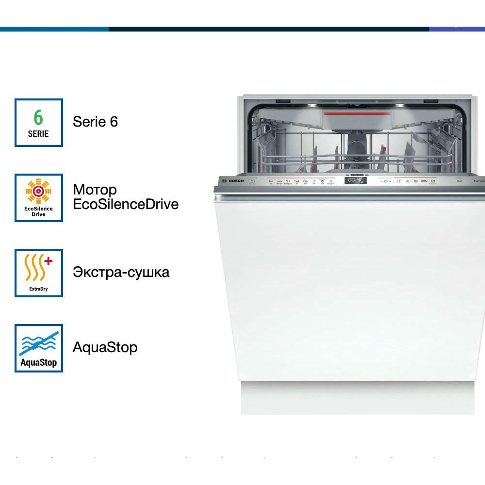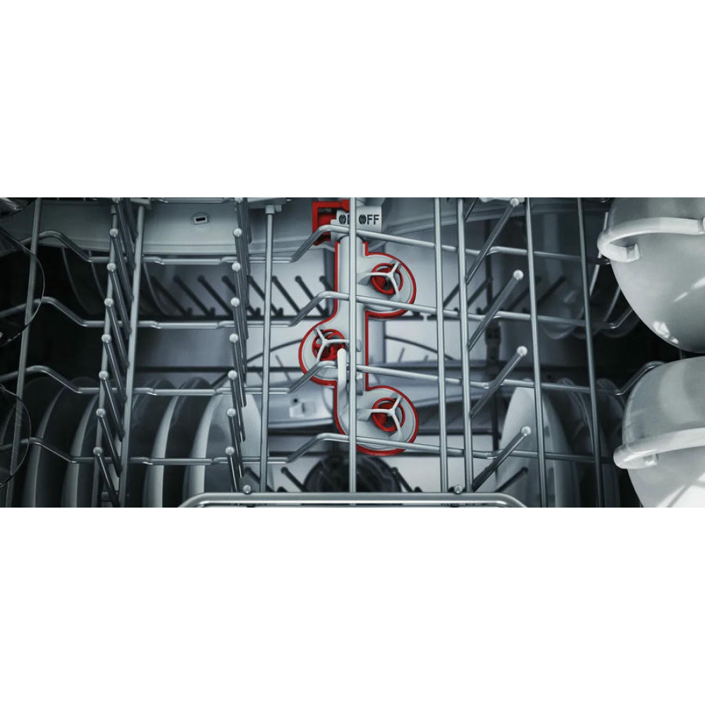 Модель оснащена тремя корзинами, верхний короб которых можно регулировать по высоте с помощью системы Rackmatic-3. В каждом коробе предусмотрены складные направляющие для тарелок и полки для чашек, что позволяет оптимизировать пространство и разместить максимальное количество посуды. Посудомоечная машина Bosch SMV6ZCX16E оборудована системой AquaStop и имеет полную защиту от протечек. В случае обнаружения утечки воды, система автоматически перекрывает подачу воды, предотвращая возможные затопления. Внутренний резервуар выполнен из нержавеющей сталь, что обеспечивает долговечность и надежность работы машины. При этом модель имеет класс энергопотребления B, класс мытья A и класс сушки A, что делает ее эффективной и экономичной в использовании.