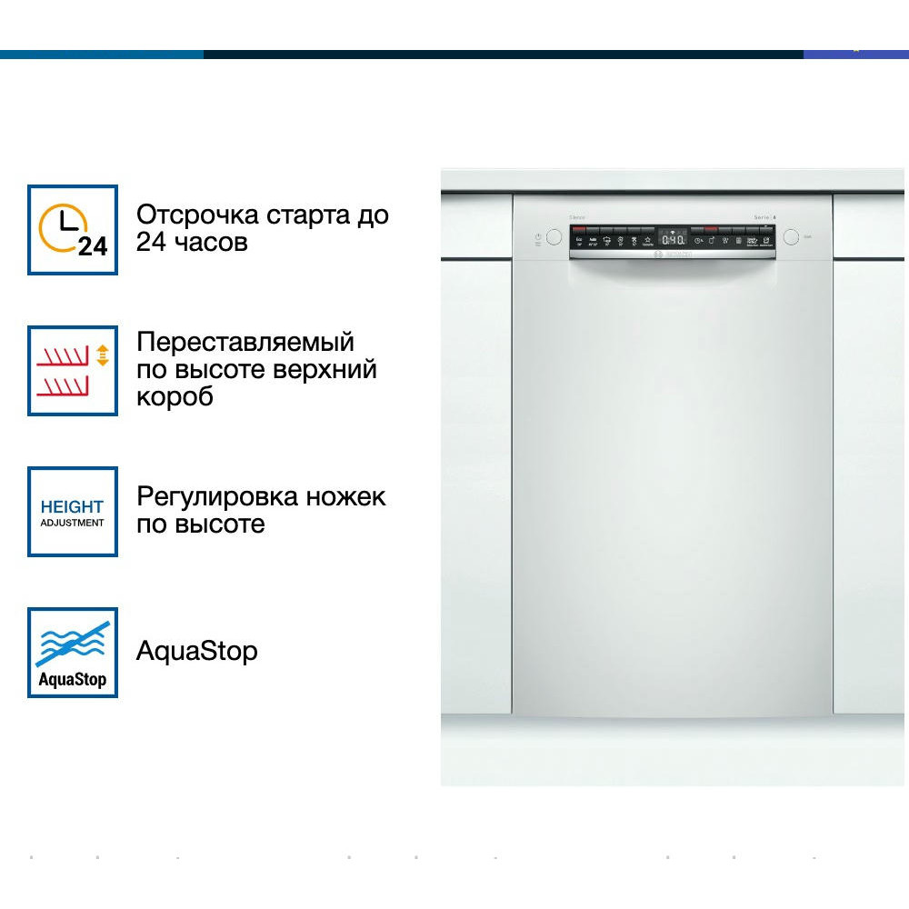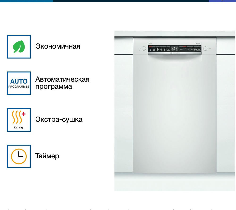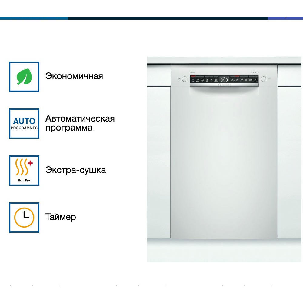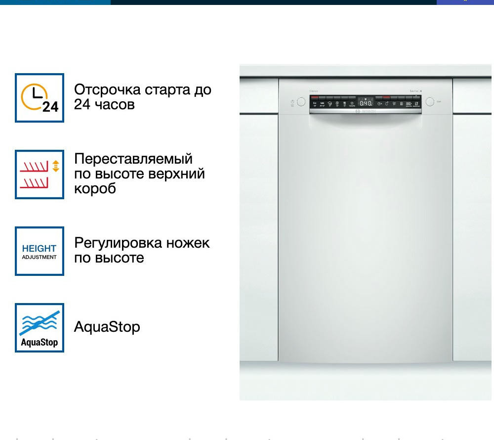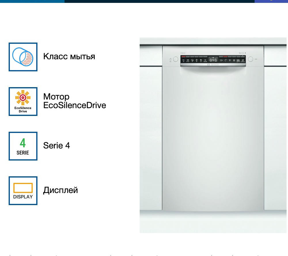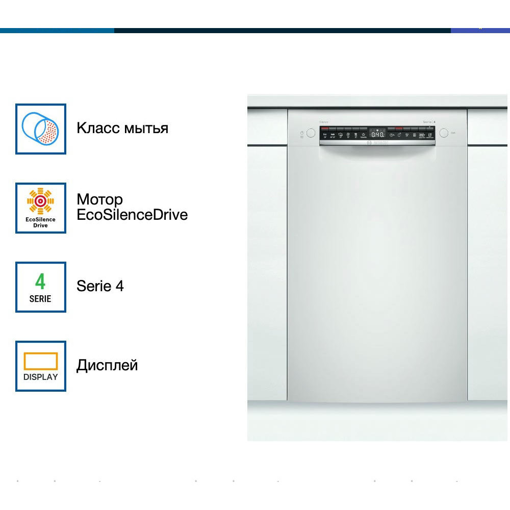 Встраиваемая посудомоечная машина Bosch SPU4HMW53S — это надежное и эффективное решение для современной кухни. Произведенная в Евросоюзе, эта модель предлагает высокое качество и долговечность, подтвержденные гарантией на 12 месяцев. Машина частично встраивается, что позволяет ей гармонично вписаться в любой интерьер, сохраняя при этом доступ к панели управления. Дизайн этой модели отличается простотой и функциональностью. Белый цвет панели управления придает ей современный и стильный вид. Управление осуществляется с помощью кнопок, а на дисплее отображается вся необходимая информация о текущем режиме работы.
