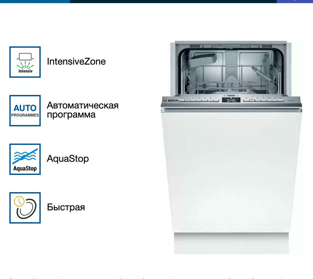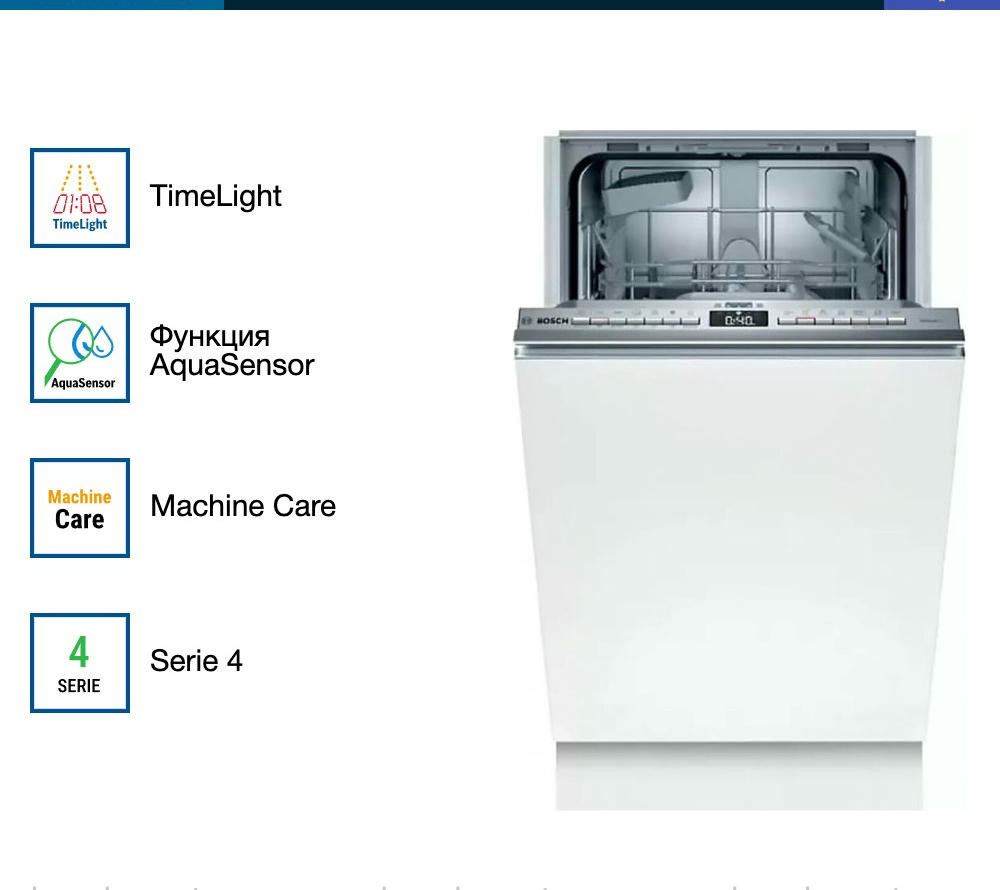 Посудомоечная машина Bosch SPV 4 EKX29E оборудована индикатором TimeLight он отображается на полу во время работы устройства и показывает время до окончании программы. Устройство способно загрузить 9 комплектов посуды. 6 программ мойки помогут разобраться с любыми загрязнениями.