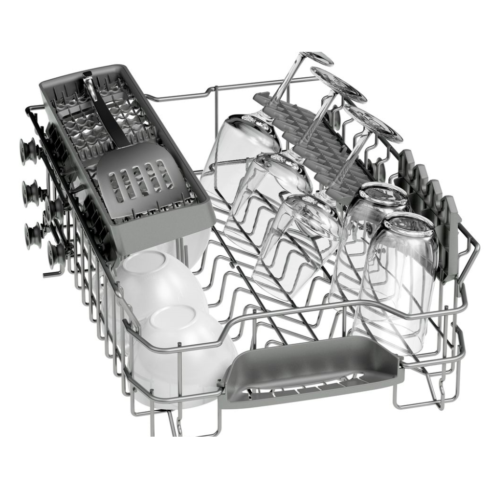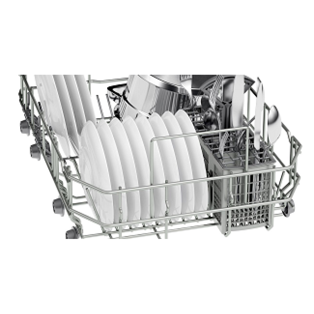 Посудомоечная машина Bosch SPV25CX00E оснащена системой защиты от протечек AquaStop, которая обеспечивает безопасность использования прибора. Индикатор InfoLight поможет вам определить работает ли в данный момент модель. Верхний короб можно отрегулировать по высоте в зависимости от размера посуды.
