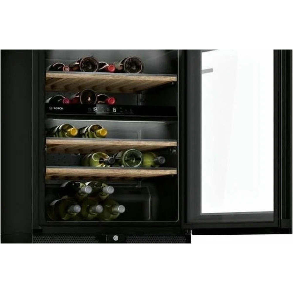 Винный шкаф Bosch KWK16ABGA выполнен в черном цвете и прекрасно дополнит собой любой интерьер. Он не займет много пространства, поскольку имеет следующие габариты: высота — 81,8 см, ширина — 60 см, глубина — 59,3 см. Для удобства в эксплуатации товара используются выдвижные деревянные полки на телескопических полозьях. Одна камера в технике такого типа встречается чаще всего, потому что в ней просто расположить все функциональные детали, и в итоге прибор действительно похож на обычный шкаф.