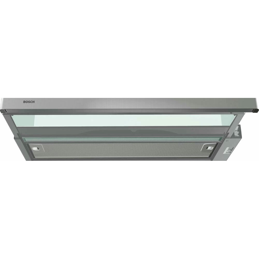 Вытяжка Bosch DFT63CA50Q — это модель, отличающаяся современным дизайном и эстетичностью. Она выполнена в красивом цвете «Серебристый металлик». Ее особенностью является возможность монтажа в подвесном шкафу, благодаря чему весь корпус устройства скрывается, оставляя на виду только панель управления, подсветку и фильтр-жироуловитель. Размеры вытяжки составляют: