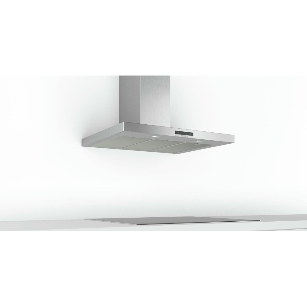 Вытяжка Bosch DWB96DM50 изготовлена из нержавеющей стали. На передней части расположены сенсорные элементы управления, которые увеличивают удобство в использовании. Три стандартных ступени и ступень интенсив помогут избавиться от дыма, продуктов сгорания, испарений и др.