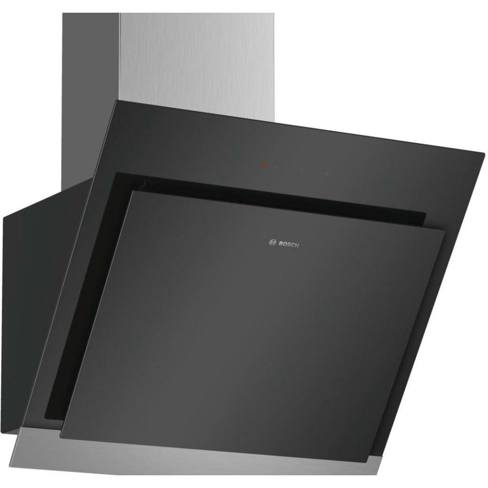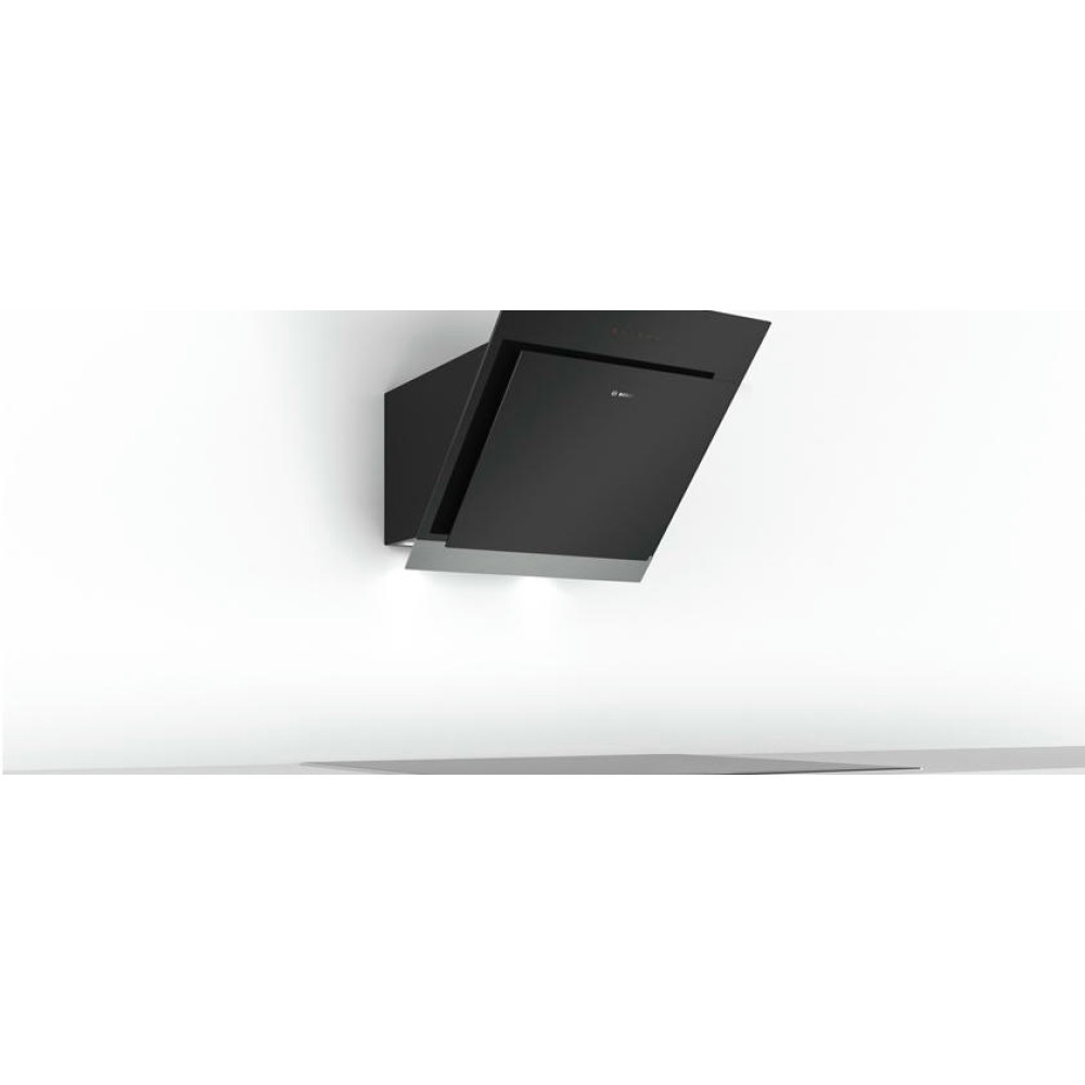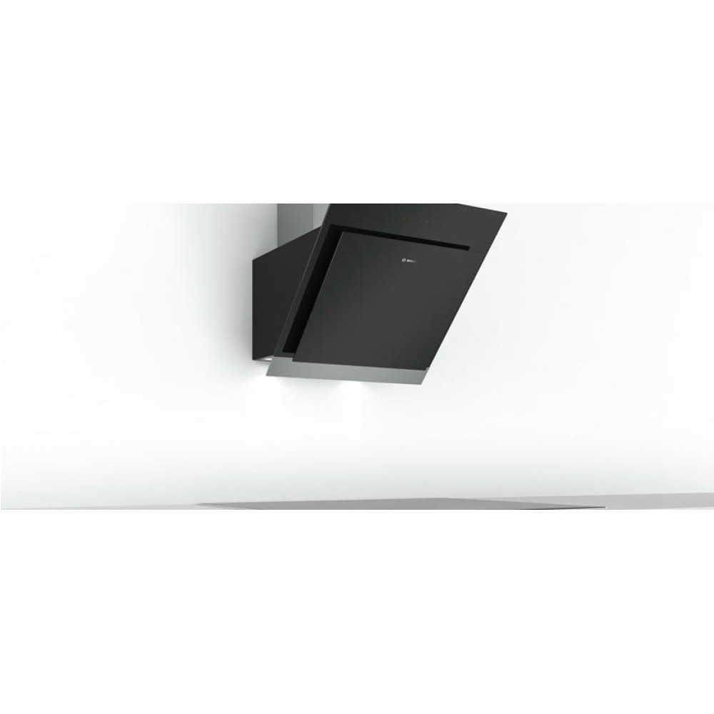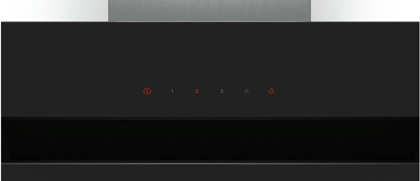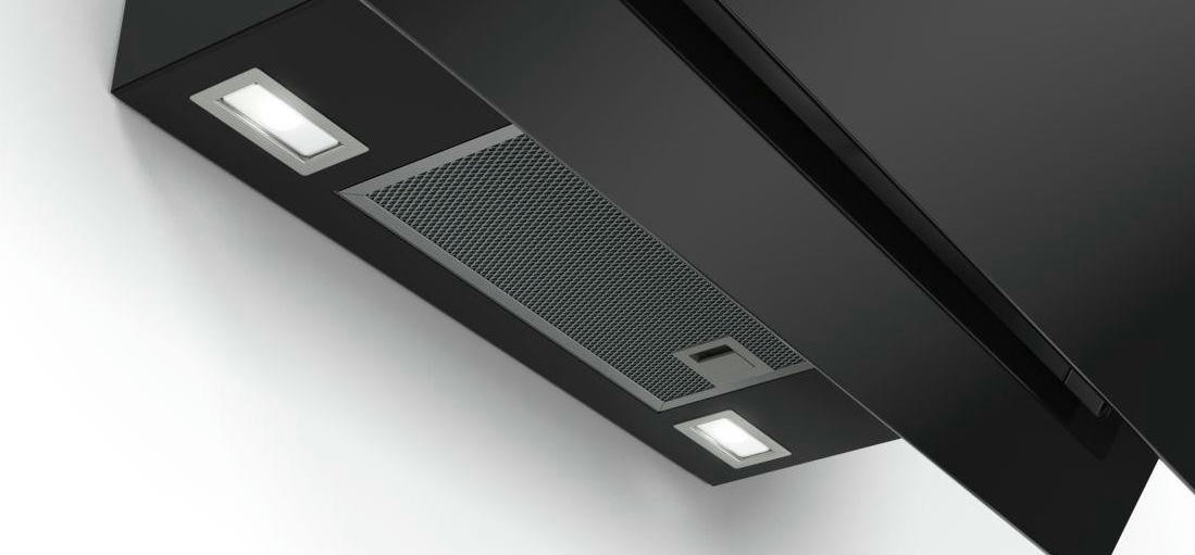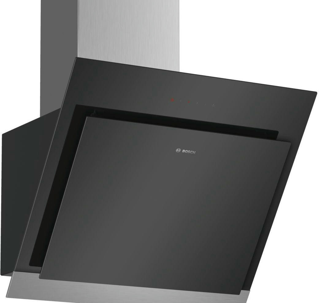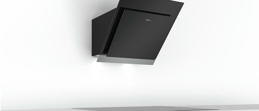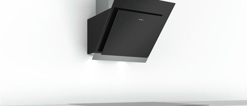 Наклонная вытяжка Bosch DWK 67HM60 эффектно смотрится в интерьере и удобна в использовании благодаря конструкции — передний край не перекрывает обзор. Забор воздуха производится по периметру прибора, что уменьшает уровень шума. Жировой фильтр закрыт стеклянным экраном. Сенсорное управление Touch Select расположено на передней панели, переключение скоростей и включение света производится легким касанием.