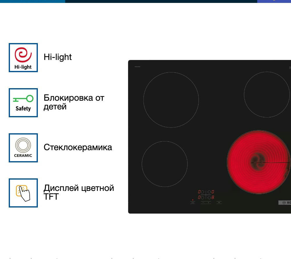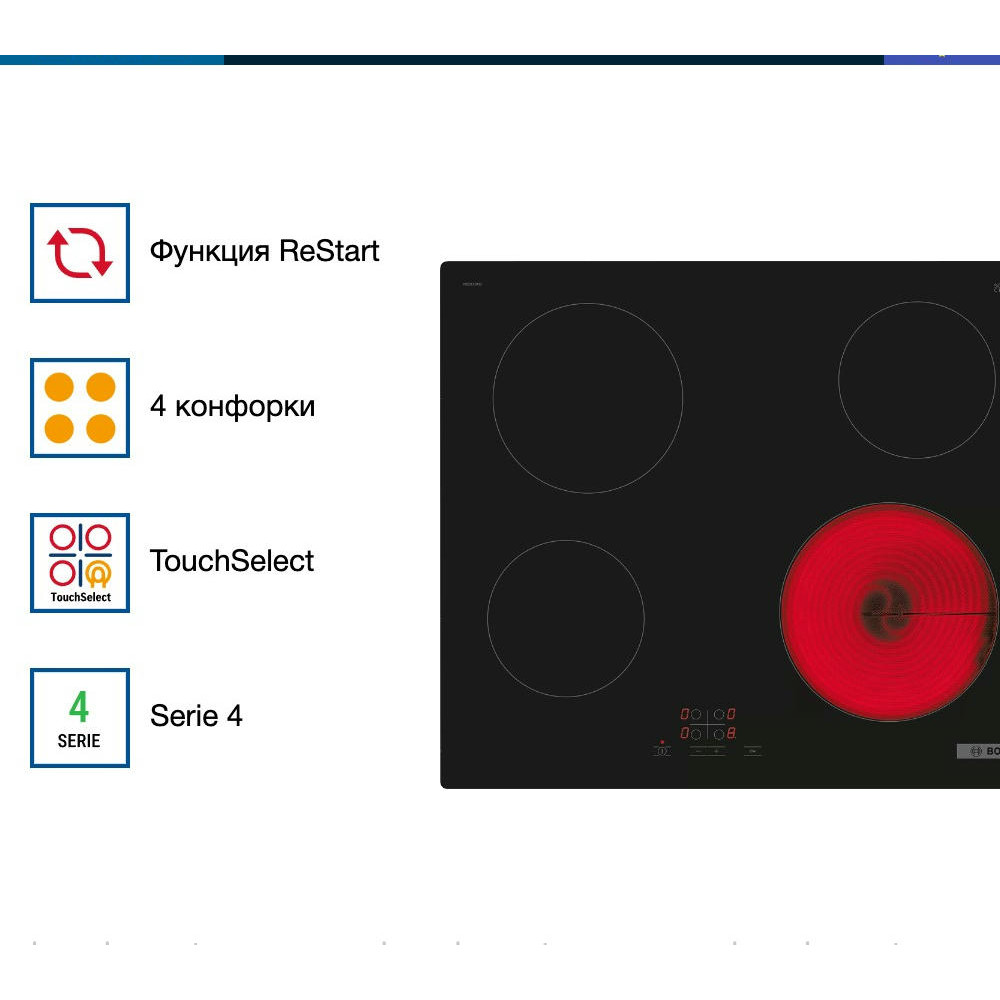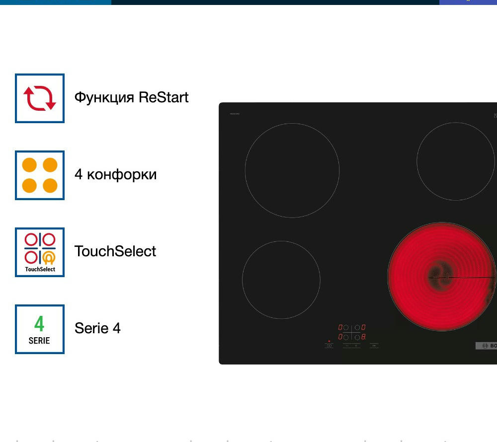 Данная модель оснащена 4 конфорками разного диаметра и мощности, что обеспечивает комфортное одновременное приготовление нескольких блюд. Управление осуществляется при помощи удобной и интуитивно понятной сенсорной панели TouchSelect. Для безопасной эксплуатации предусмотрены: функция блокировки от детей, автоматическое отключение устройства при бездействии и индикация остаточного тепла для каждой зоны нагрева.