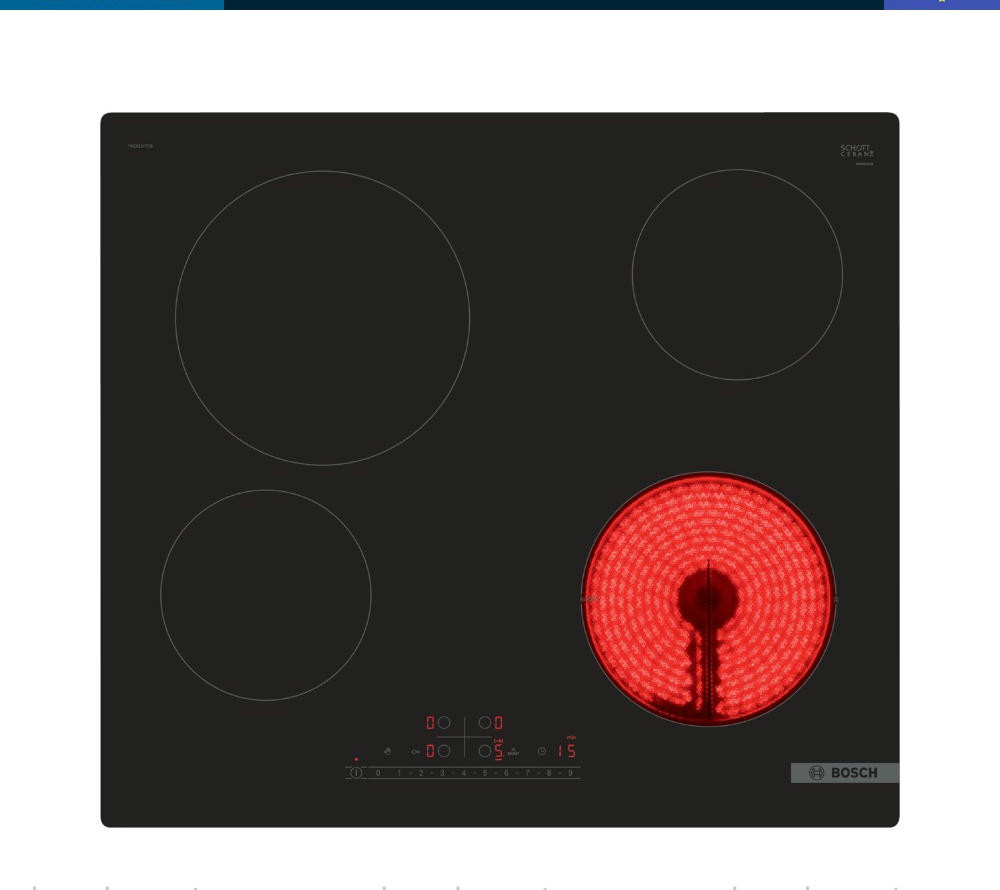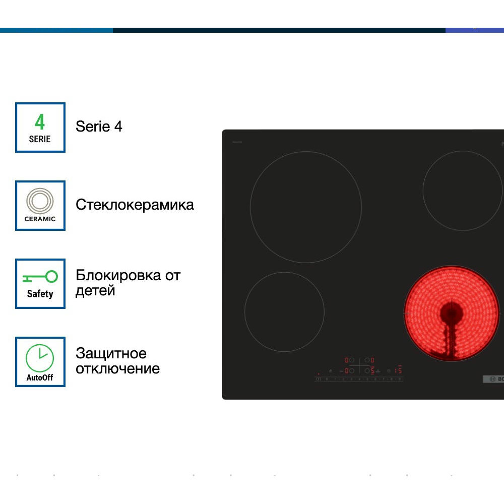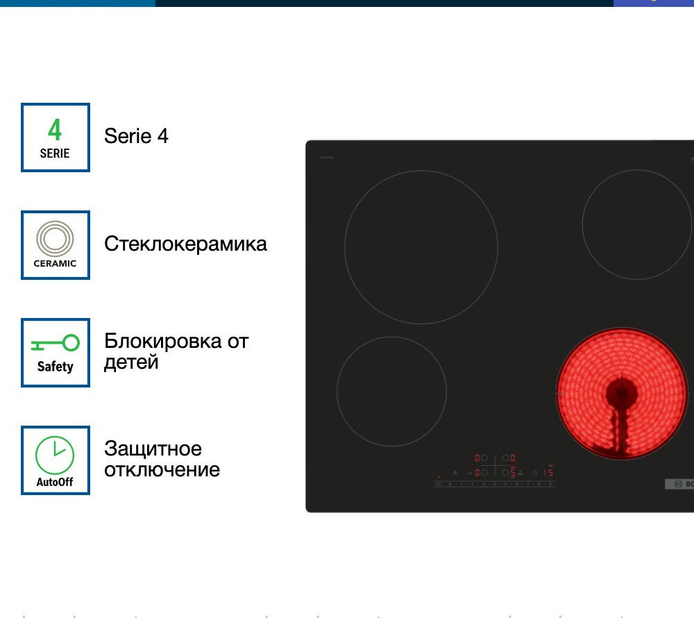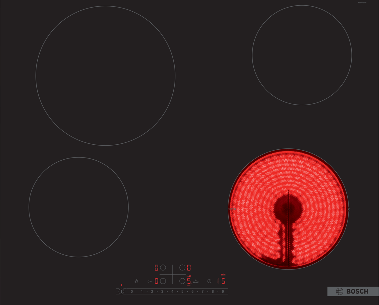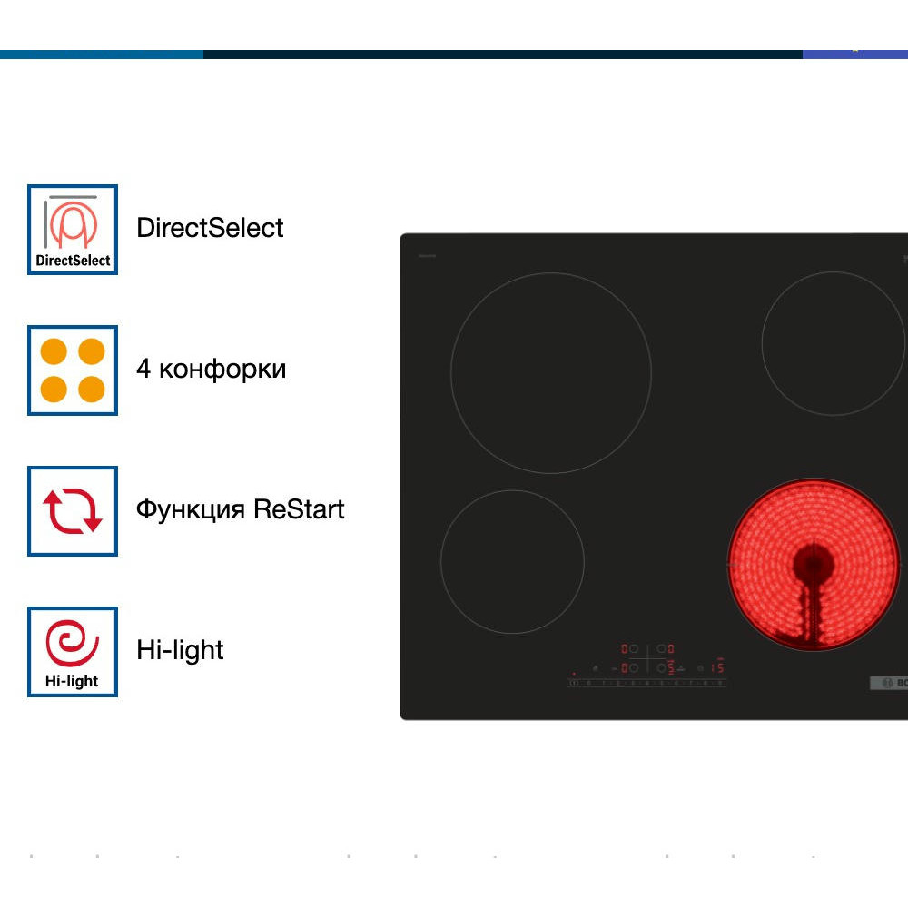 Электрическая варочная поверхность Bosch PKE611FP2E имеет интуитивное понятное управление DirectSelect, которое позволяет одним нажатием задать мощность работы конфорки или активировать дополнительные функции. PowerBoost поможет быстро разогреть блюдо или вскипятить воду. А индикатор остаточного тепла обезопасит вас от случайных ожогов.