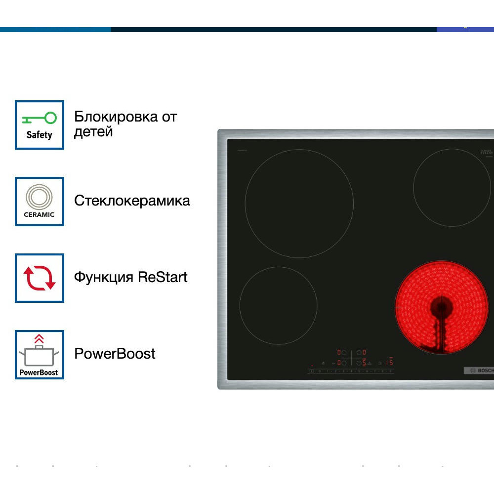Материал поверхности варочной панели - стеклокерамика, что обеспечивает ее долговечность и устойчивость к повреждениям. Черный цвет и рамка из нержавеющей стали добавляют элегантности и современного стиля. Эта модель также обладает функциями ReStart и PowerBoost, которые увеличивают ее функциональность и удобство использования.