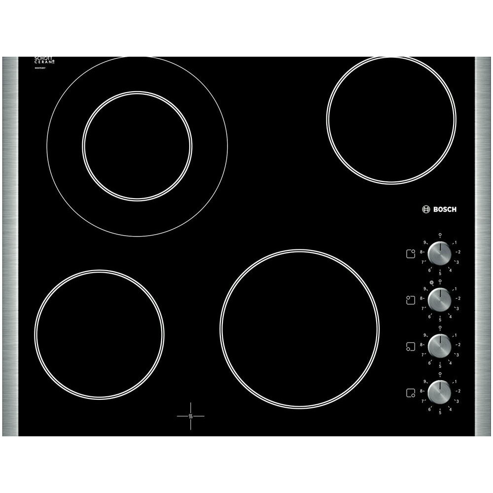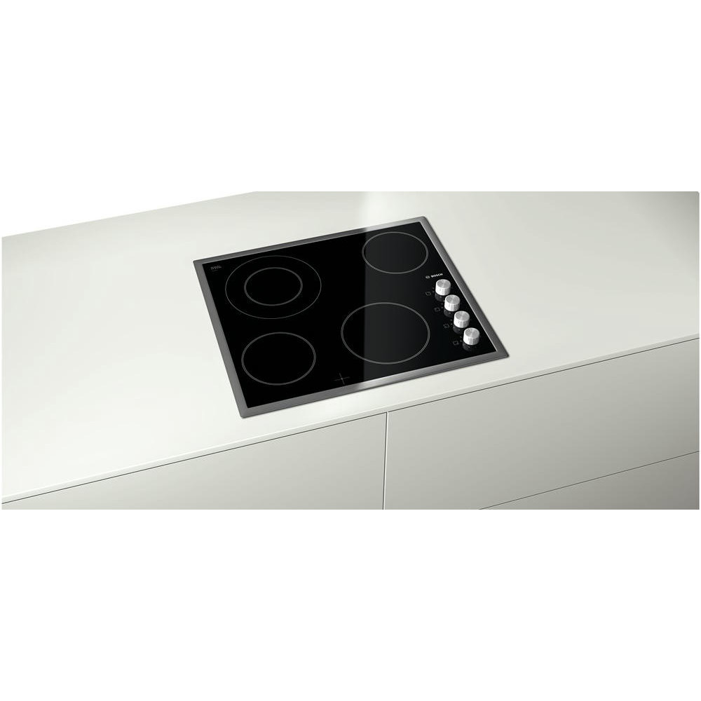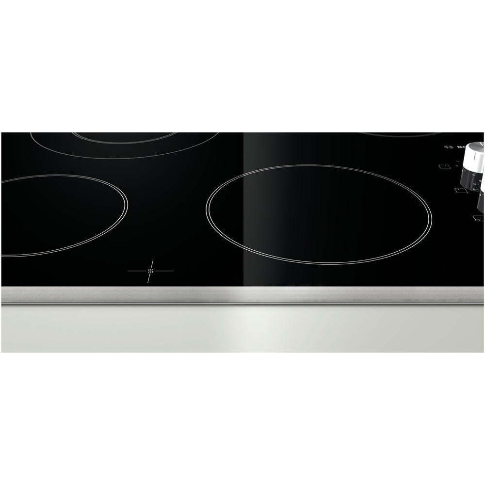 Независимая электрическая панель PKF645C17 дополнена рамкой из нержавеющей стали. На стеклокерамической поверхности располагаются четыре конфорки разного диаметра, одна из которых с двойным расширением. Управление осуществляется при помощи поворотных регуляторов, которые не нагреваются во время работы прибора. Индикатор остаточного тепла повышает уровень безопасности и предупреждает о том, что конфорка еще горячая и прикосновение к ней будет опасным.