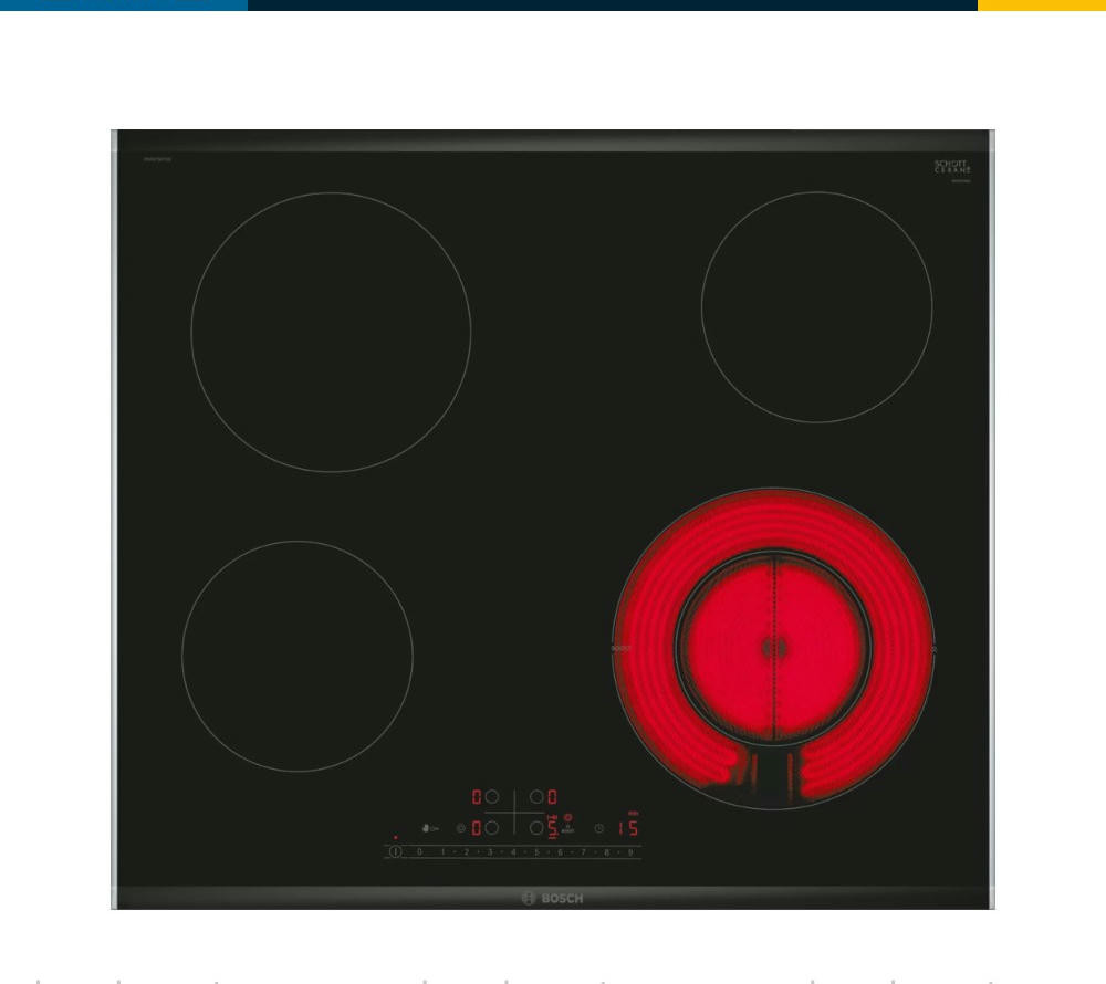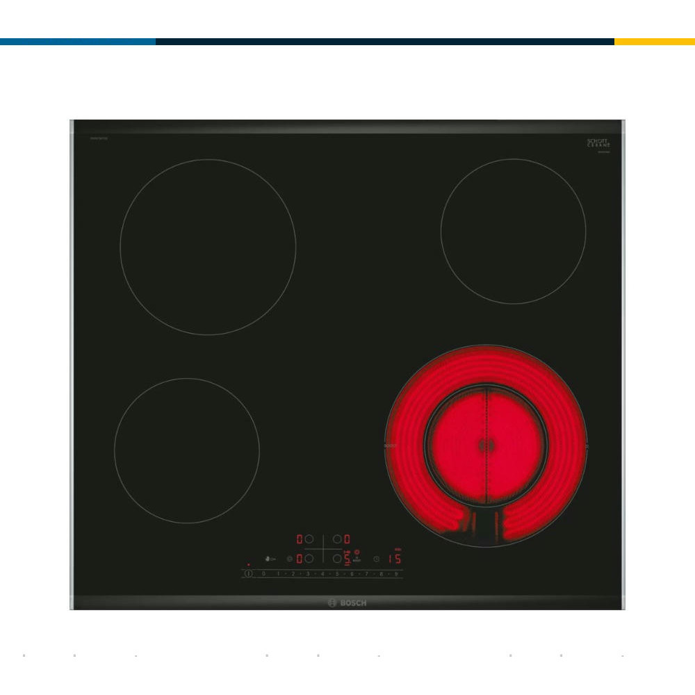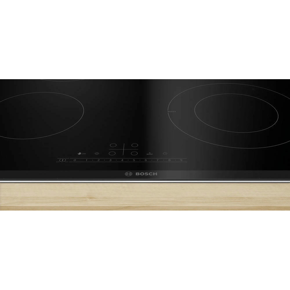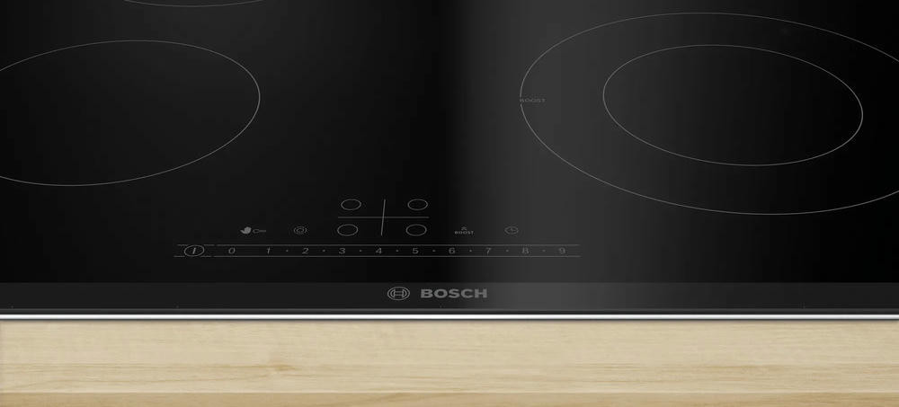 Варочная панель Bosch PKF675FP2E выполнена из стеклокерамики черного цвета, что придает ей элегантный и стильный вид. Металлический профиль по бокам придаёт дополнительную прочность и устойчивость к повреждениям.