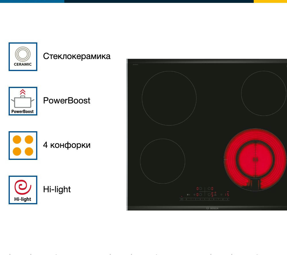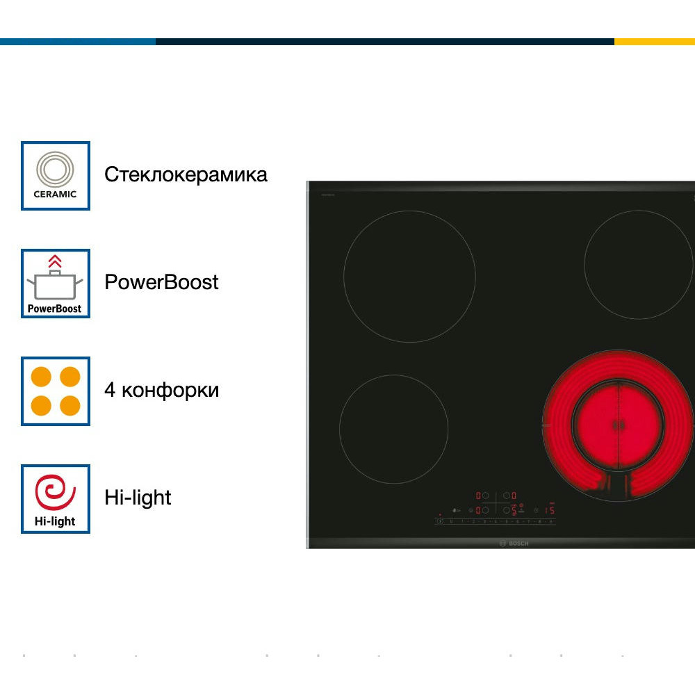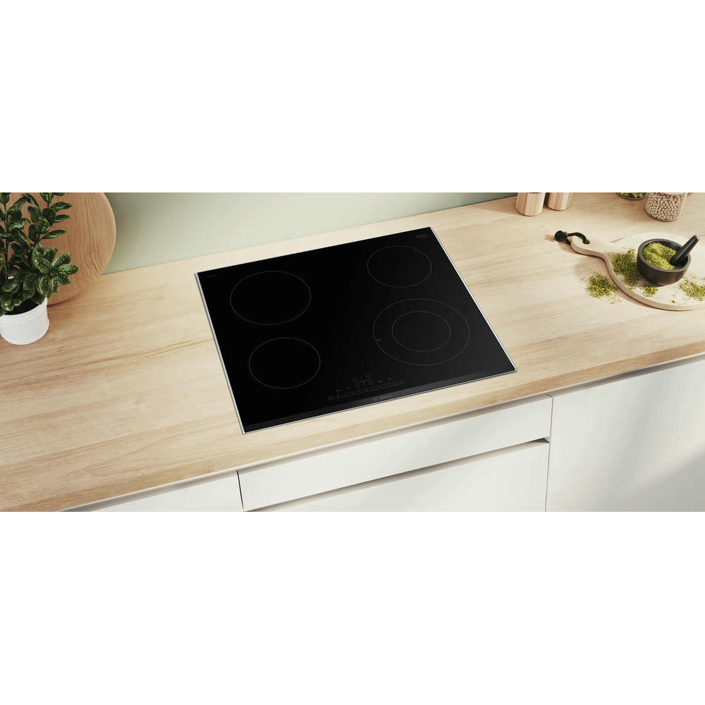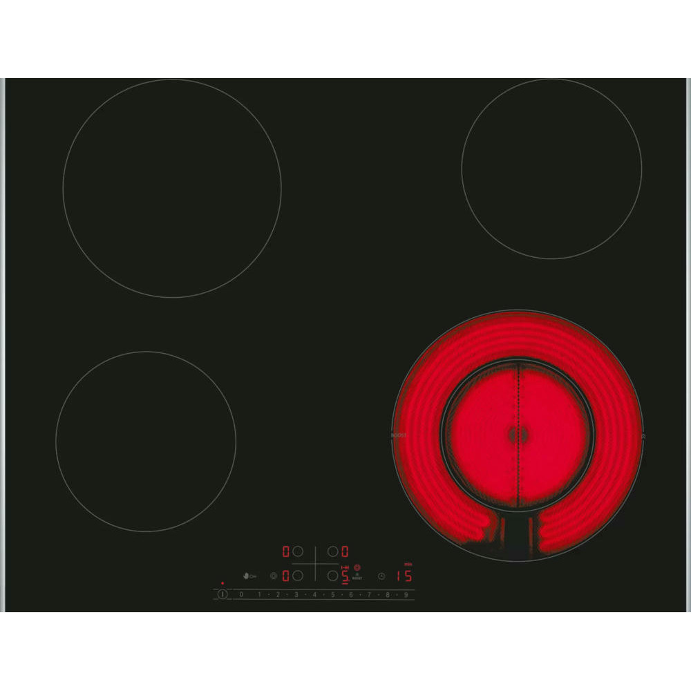 Варочная панель Bosch PKF675FP2E выполнена из стеклокерамики черного цвета, что придает ей элегантный и стильный вид. Металлический профиль по бокам придаёт дополнительную прочность и устойчивость к повреждениям.