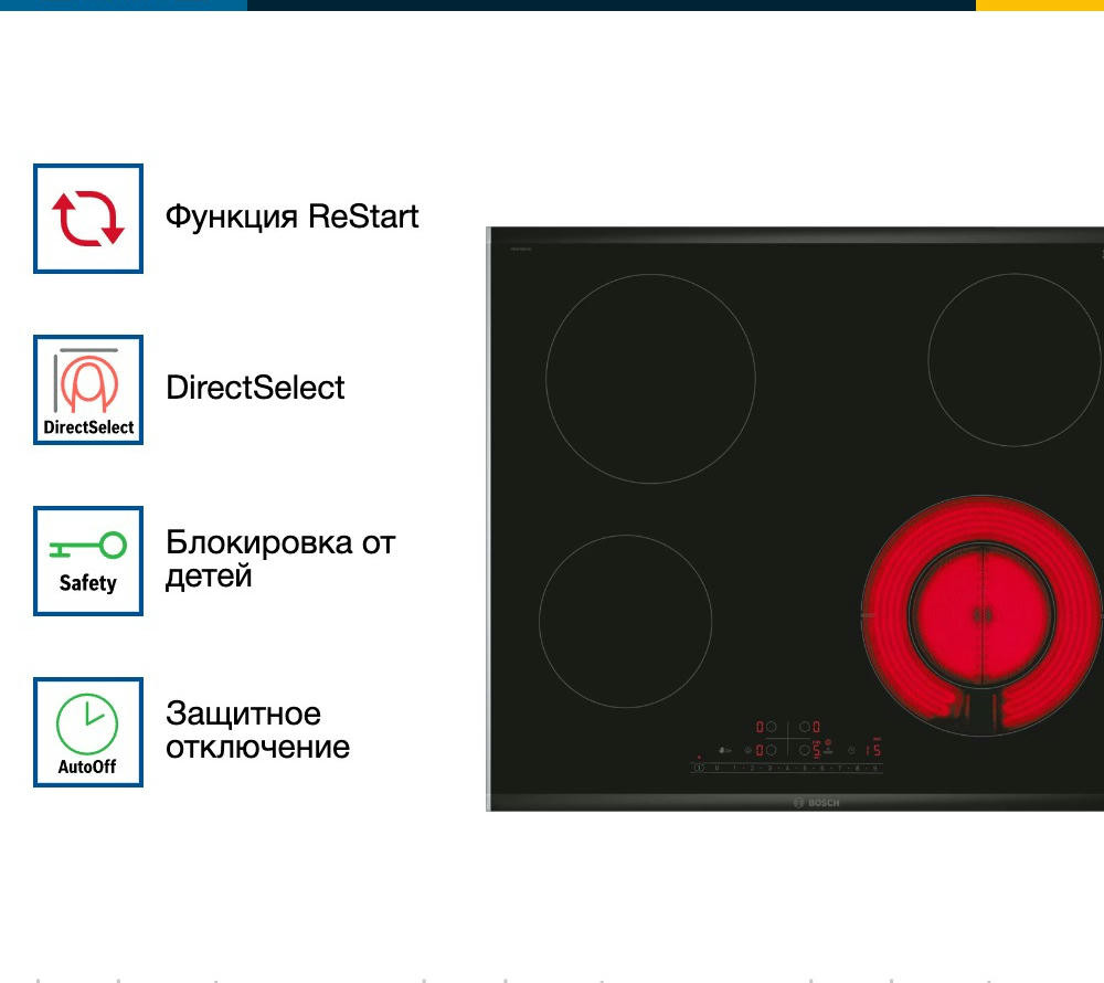 Функция ReStart позволяет быстро возобновить работу панели после внезапного отключения питания, сохраняя выбранные ранее настройки. Функция PowerBoost значительно увеличивает мощность конфорки, что позволяет сократить время приготовления блюд.
