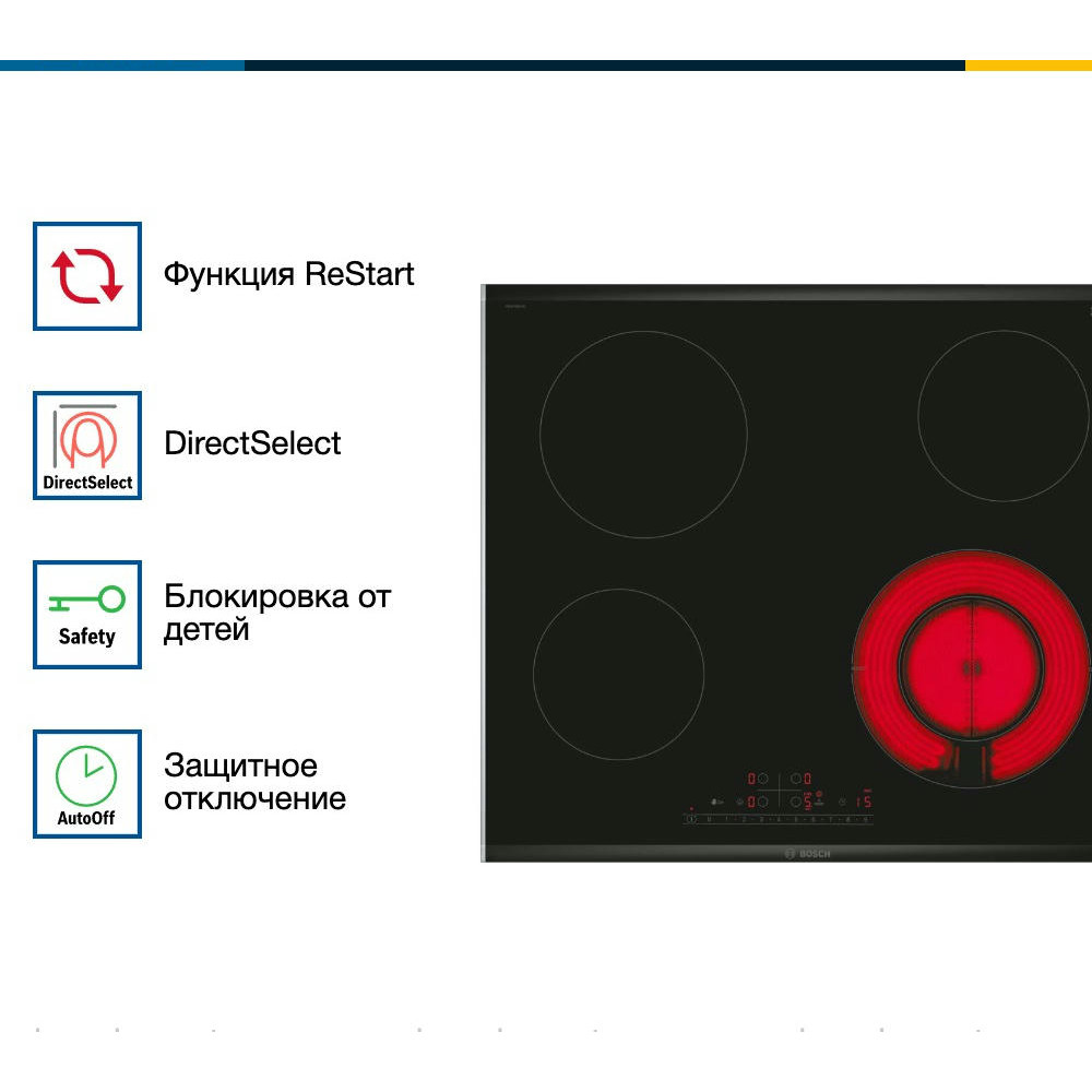 Техника оснащена главным выключателем, защитным отключением и блокировкой от детей, что обеспечивает безопасность её использования. Индикатор остаточного тепла предупреждает о том, что поверхность еще горячая.
