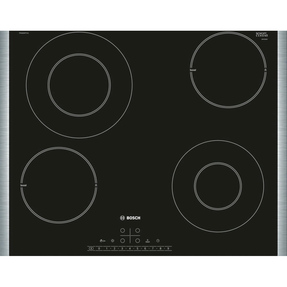 Важным преимуществом нагревательных элементов типа Hi-Light является низкая инерционность — конфорка будет практически без промедления реагировать на регулировку мощности. Для нагрева требуется в среднем не более 5-6 секунд, что значительно экономит время приготовления. Кроме этого, панель Бош PKG645FP1G оснащена функцией PowerBoost, позволяющая существенно увеличить подачу мощности на одну из конфорок за счёт других. Такой режим доступен лишь на короткое время, но он очень удобен в экстренных случаях.
