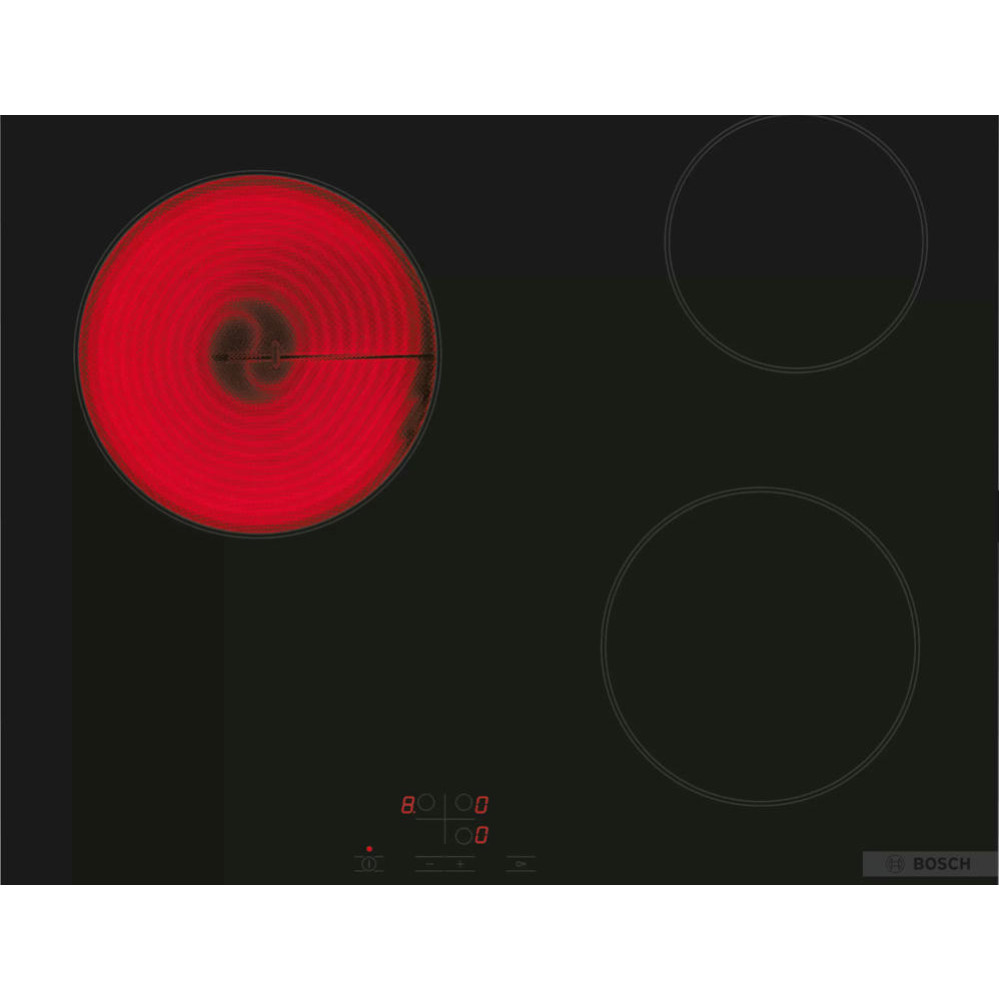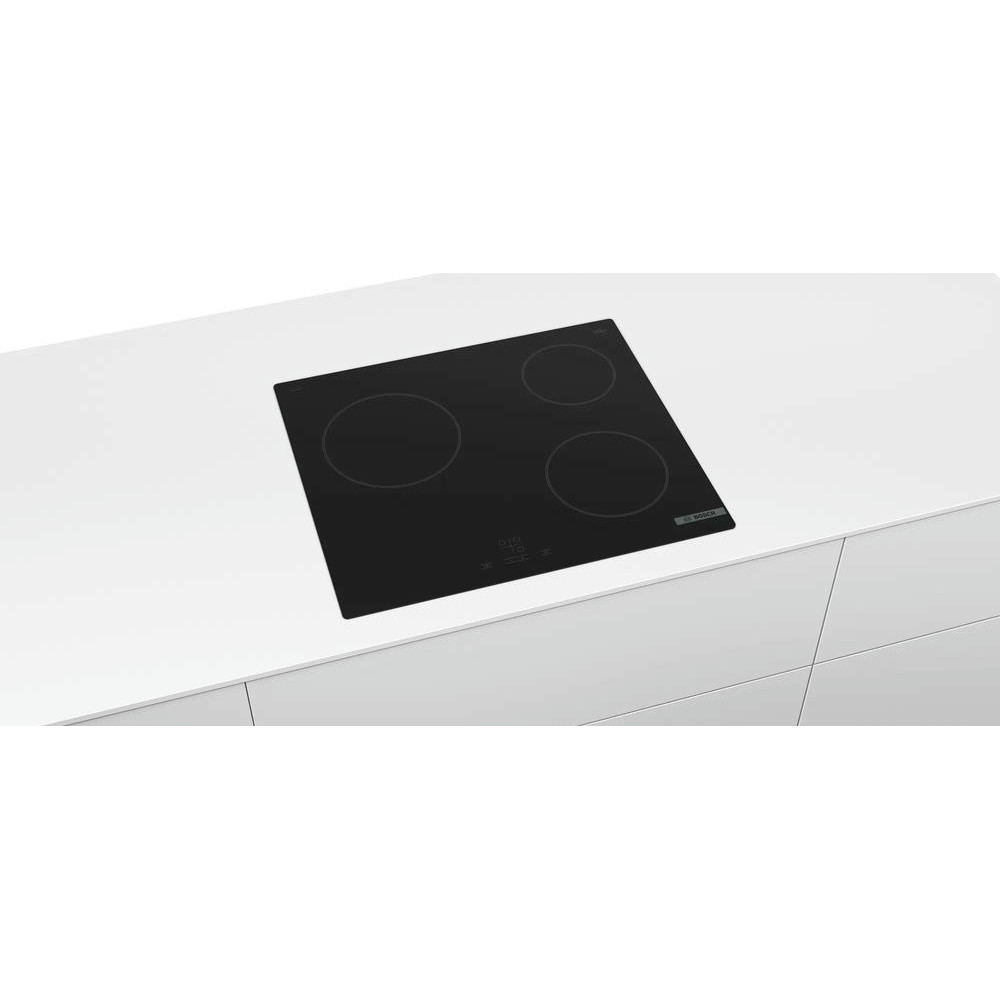 Варочная панель BOSCH PKM611BA2R выполнена в черном цвете. Важная особенность — возможность монтажа вровень со столешницей, можно добиться идеально гладкой поверхности. Модель представлена в прочном корпусе из стеклокерамики, за счет чего выглядит благородно и подойдет к абсолютно любому дизайну, а также наиболее проста в уходе.