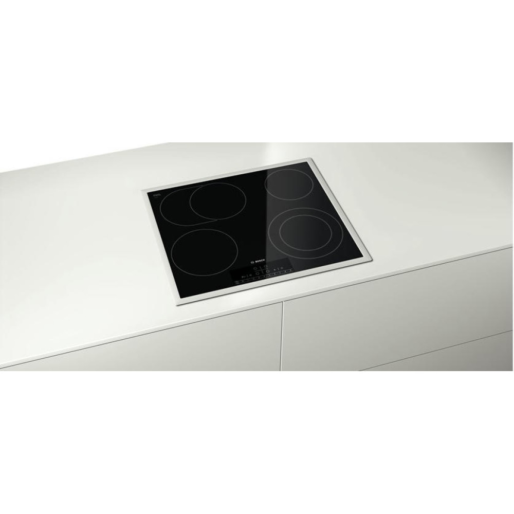 Стеклокерамическая варочная панель PKN 642F17R дополнена белой рамкой по периметру. Двойная круглая зона расширения позволяет готовить в посуде разного диаметра, уменьшая при этом потребление электроэнергии. Автоматика закипания действует за счет увеличения температуры, быстрого разогрева посуды вначале и дальнейшего переключения на заданную ступень нагрева. Такой режим помогает экономить время и электроэнергию. Таймер с функцией отключения для каждой конфорки и Cleaning-пауза расширяют возможности модели.