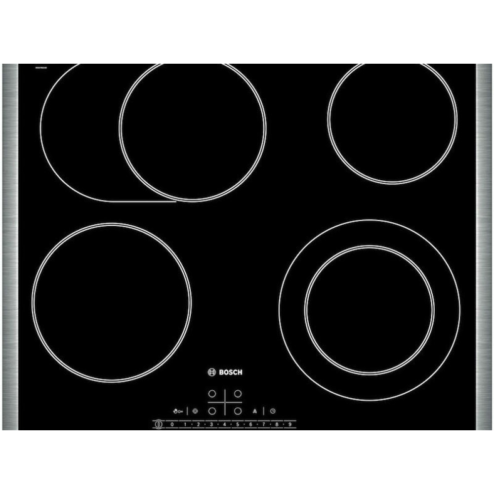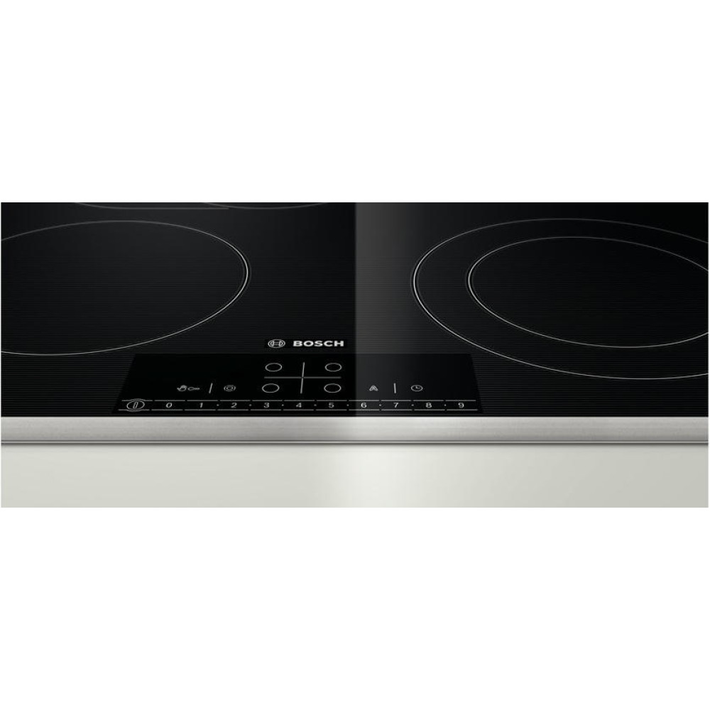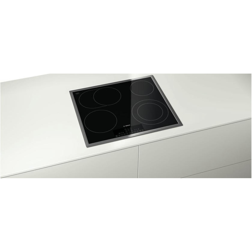 Электрическая варочная панель Bosch PKN 645F17R — независимая встраиваемая модель из стеклокерамики в рамке из нержавеющей стали. Размер ниши для встраивания 56x49-50 см, глубина 4.9 см. Минимальное расстояние от края панели до кухонного фартука 50-60 мм. Кнопки управления — сенсорные.