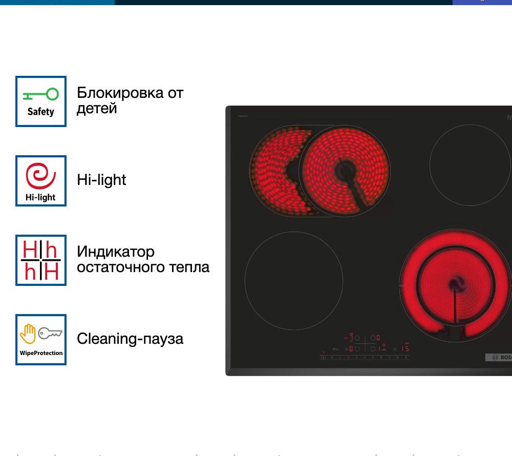 Наличие главного выключателя и функции защитного отключения обеспечивает дополнительный уровень безопасности, а блокировка от детей предотвращает случайное включение, что особенно важно в семьях с маленькими детьми. Индикатор остаточного тепла в двух позициях для каждой конфорки информирует об уровне нагрева, помогая избежать ожогов и оптимизировать использование тепла для поддержания блюд тёпыми.