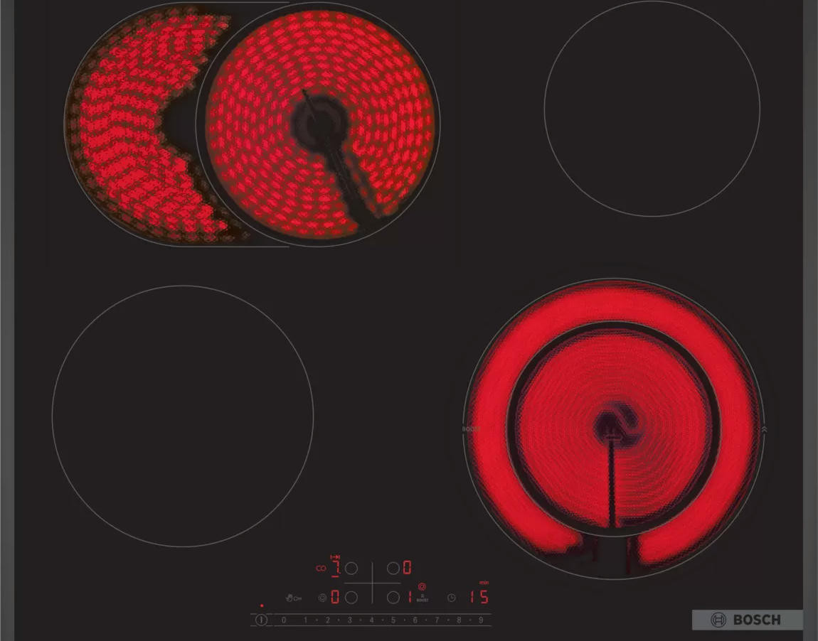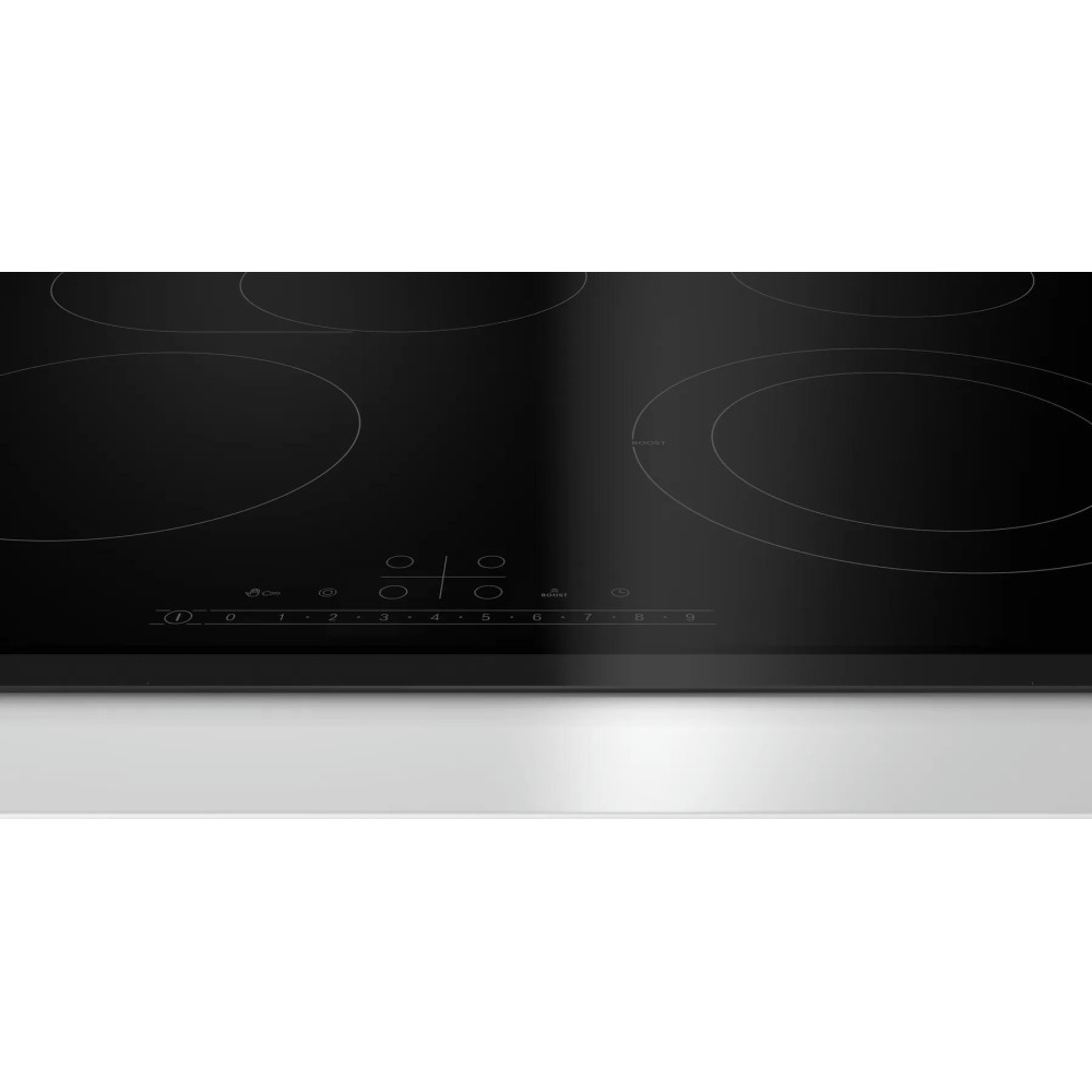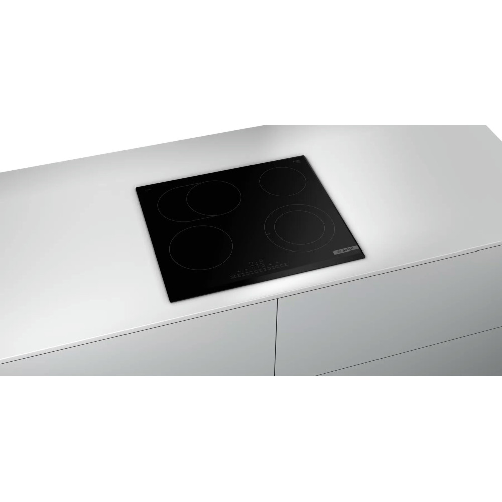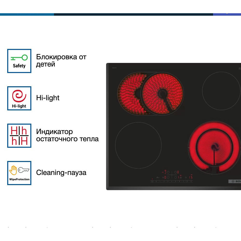 Варочная панель Bosch PKN651FP2E Эта современная стеклокерамическая поверхность сочетает элегантность и продуманную функциональность, создавая выразительный акцент на вашей кухне. Черное стекло придает строгий, но уютный вид, а скошенный край делает монтаж визуально лёгким и аккуратным — панель выглядит как естественное продолжение столешницы. Низкий профиль высотой всего 4.5 см обеспечивает минималистичный силуэт и удобную интеграцию в интерьер, а отделка без лишних деталей подчёркивает стиль Serie | 6: ясно читаемая геометрия, качественные материалы и сдержанная элегантность. Материал поверхности — стойкая к царапинам и термическим воздействиям стеклокерамика, которую легко поддерживать в чистоте; режим Cleaning-пауза даёт время для аккуратного удаления загрязнений без риска случайного включения. Цвет «черный» универсален — он гармонирует с любыми кухонными фасадами и бытовой техникой, одновременно создавая контраст с более светлой столешницей.