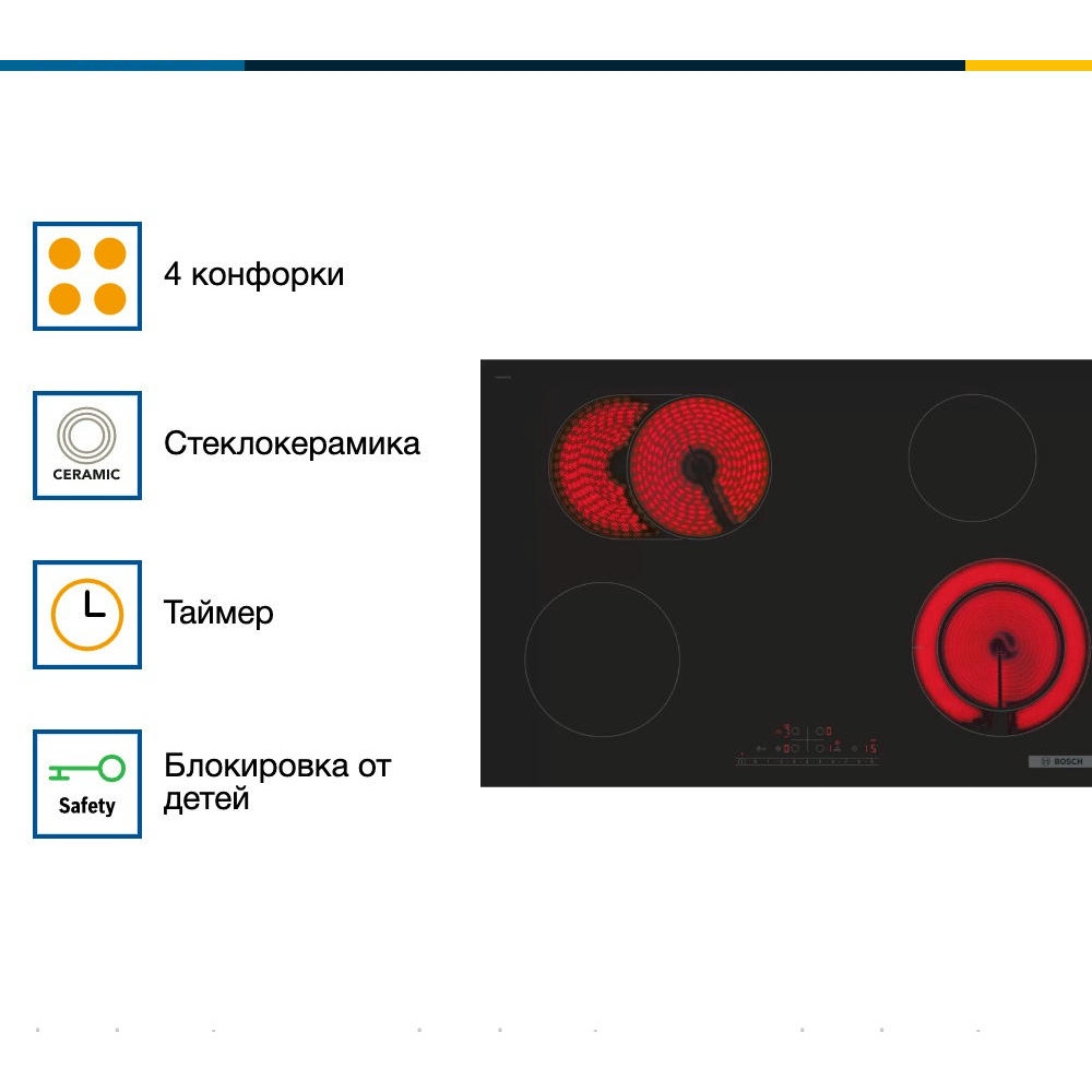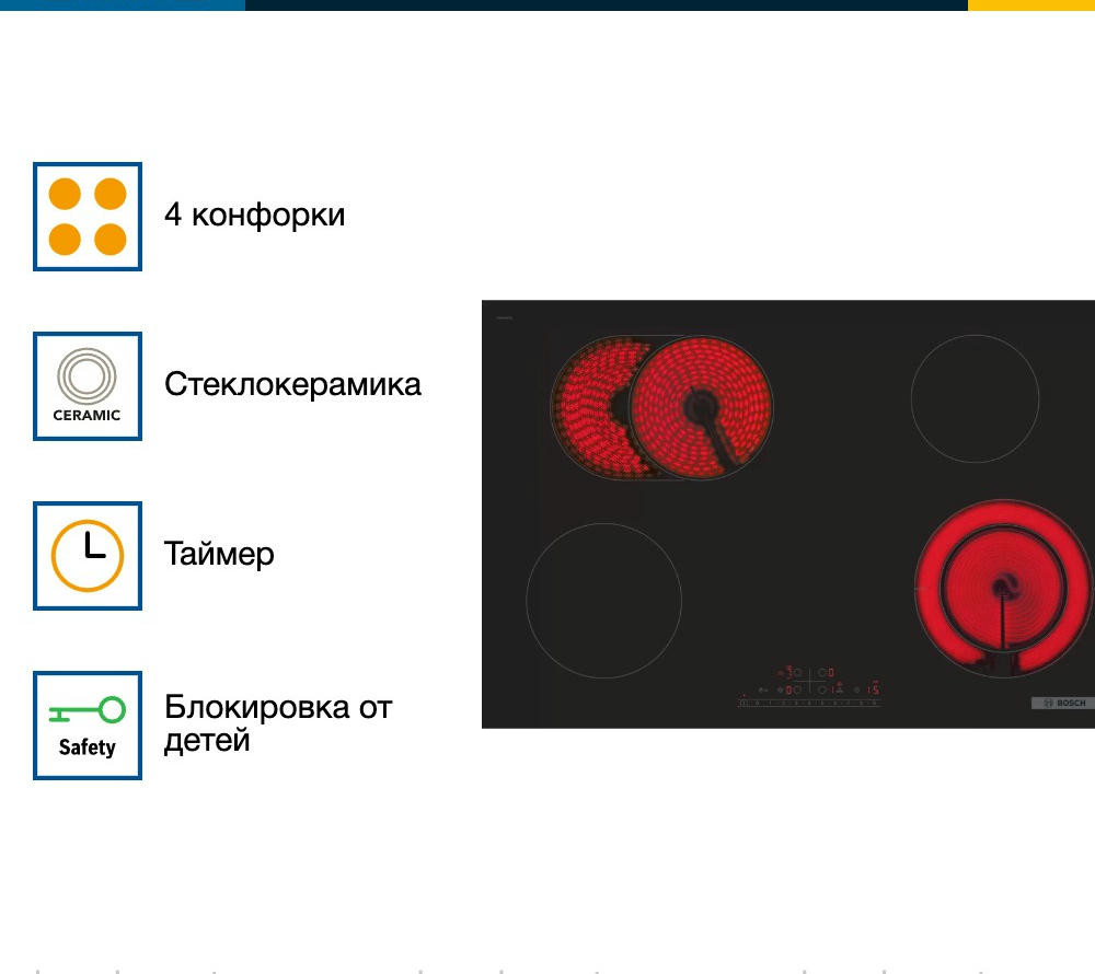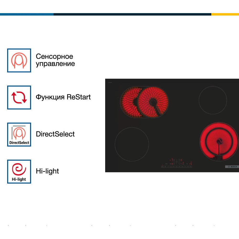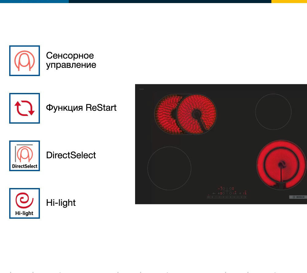 Варочная панель Bosch PKN811FP2E оснащена функцией Restart при незапланированном отключении устройства, ваши настройки восстановятся при следующем включении. Таймер отключает выбранную вами конфорку по истечению времени. Блокировка от детей защитит от случайного нажатия.