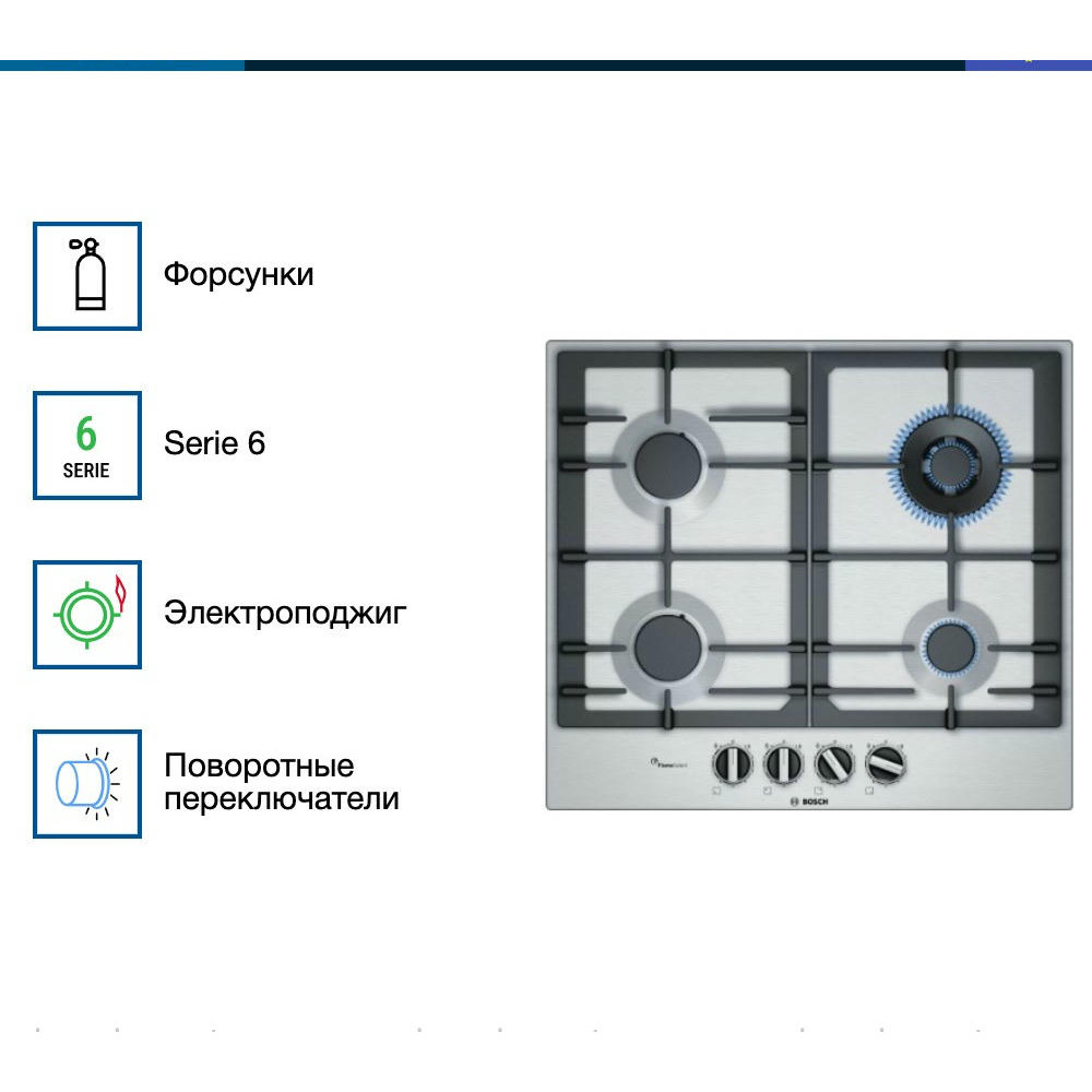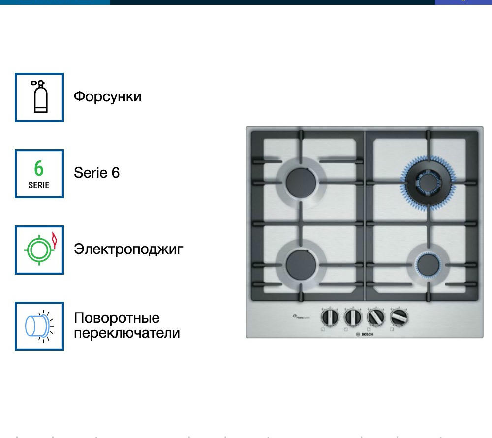 Гарантии безопасности и комфортной эксплуатации обеспечивает электроподжиг. Благодаря его наличию пламя загорается простым поворотом переключателя, без использования спичек и зажигалок. Варочная панель Бош PСH6А5B90R — залог безопасности.