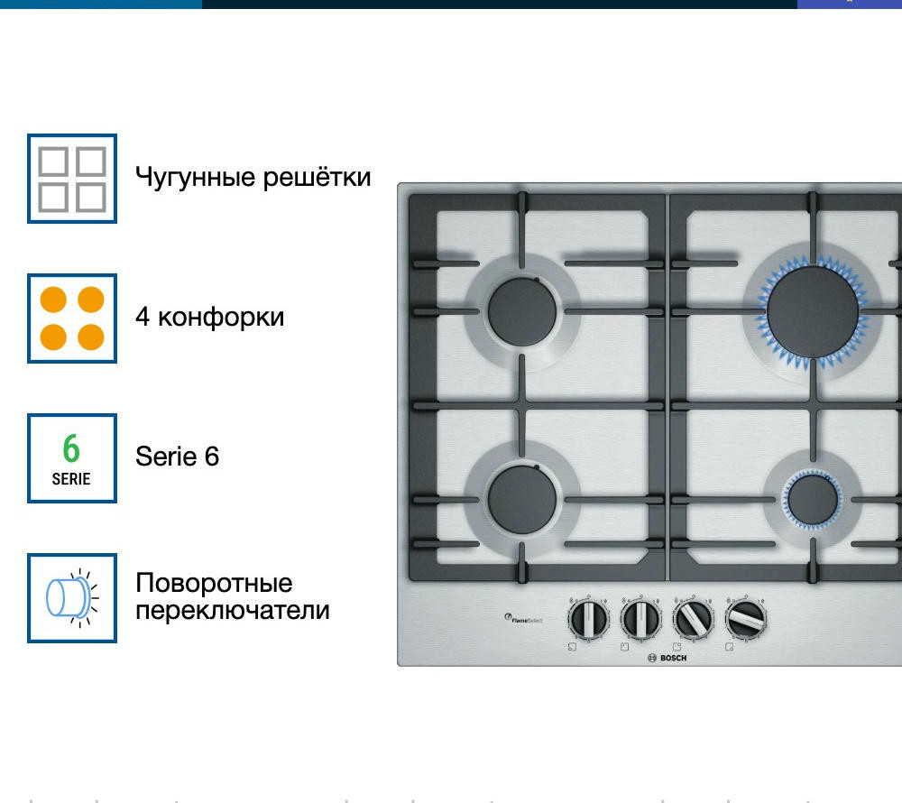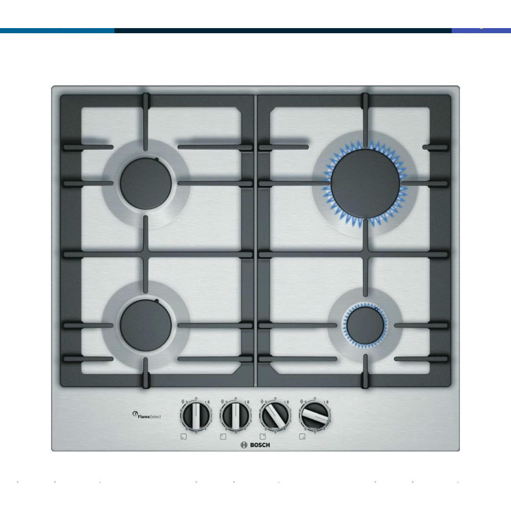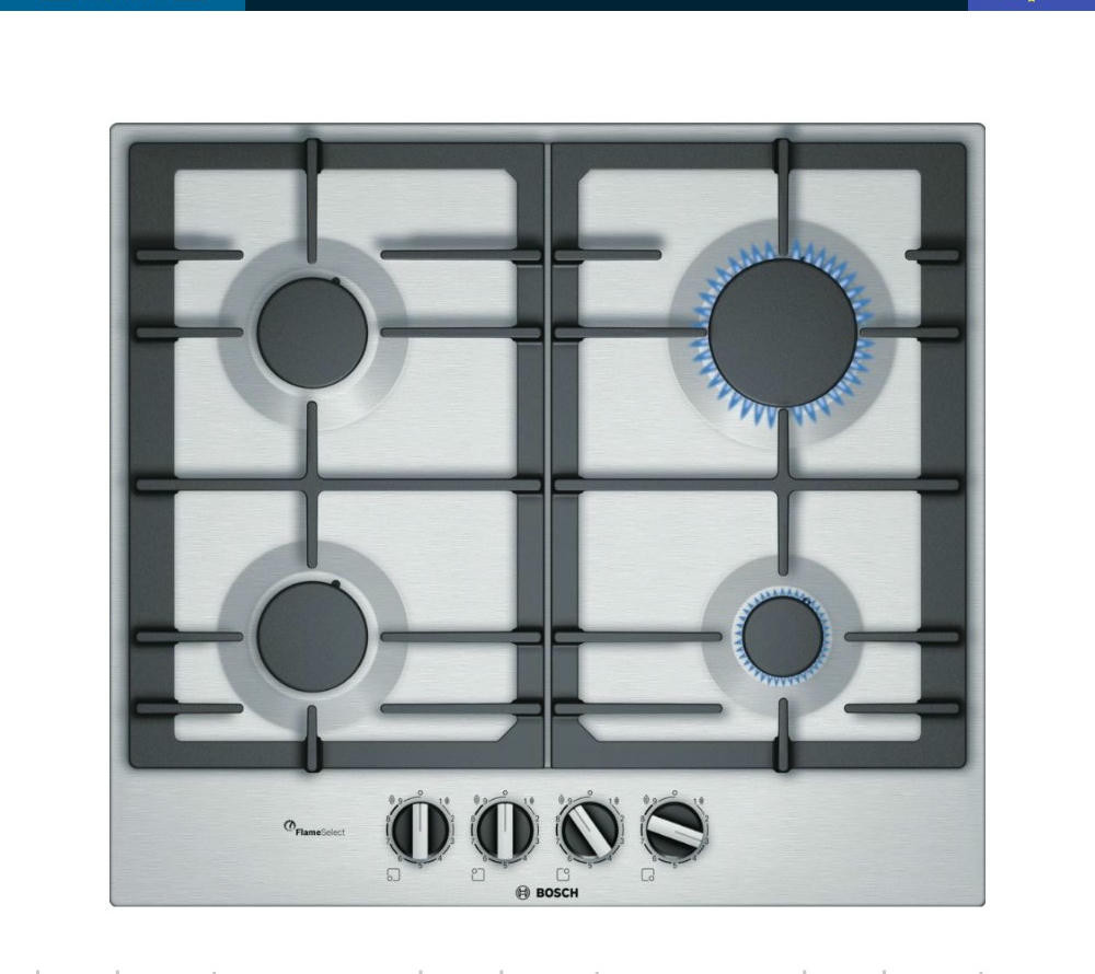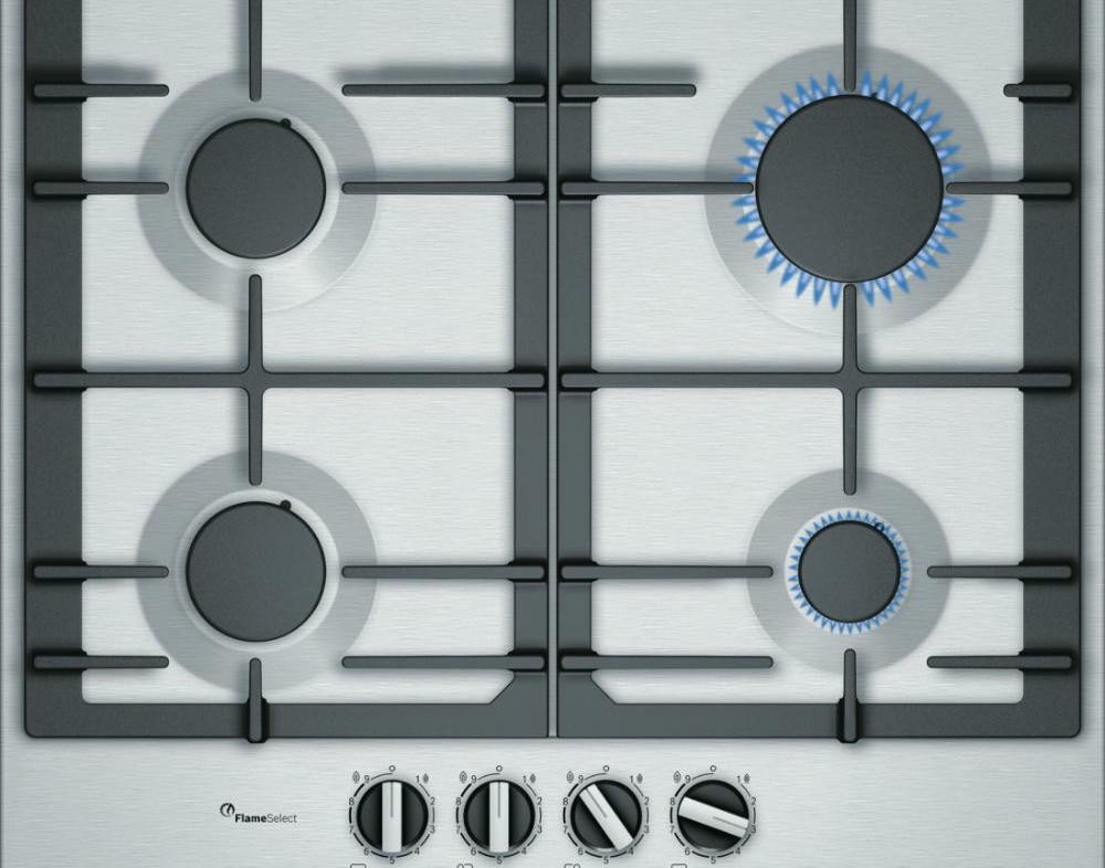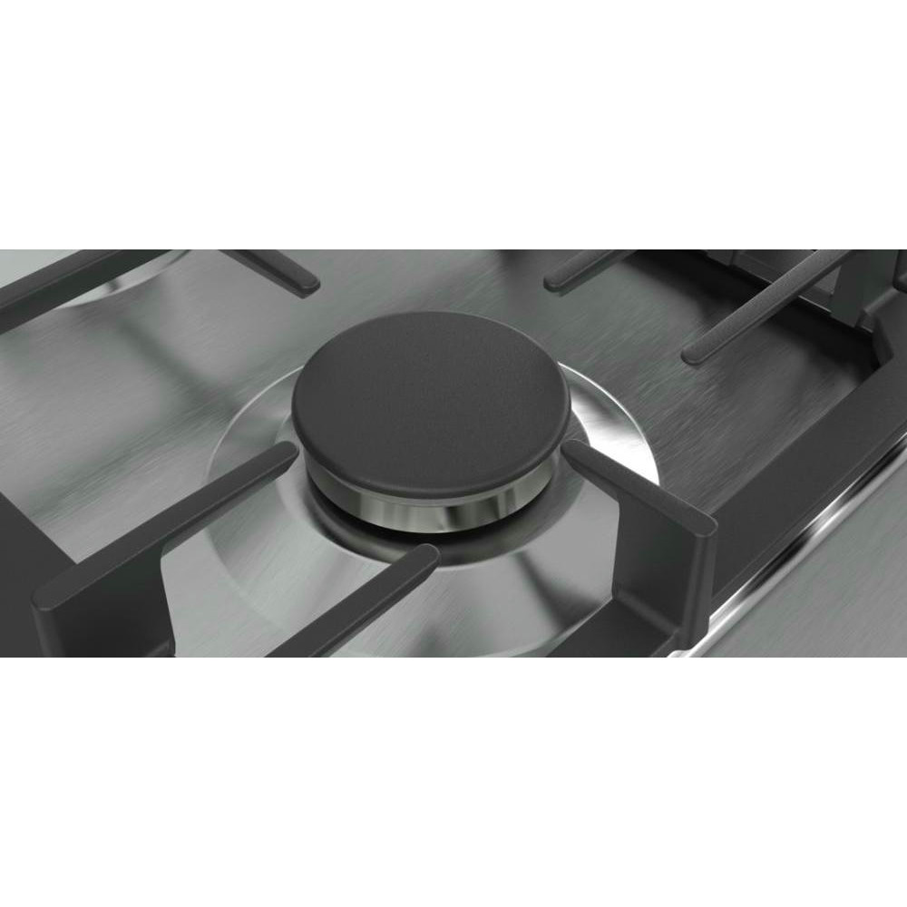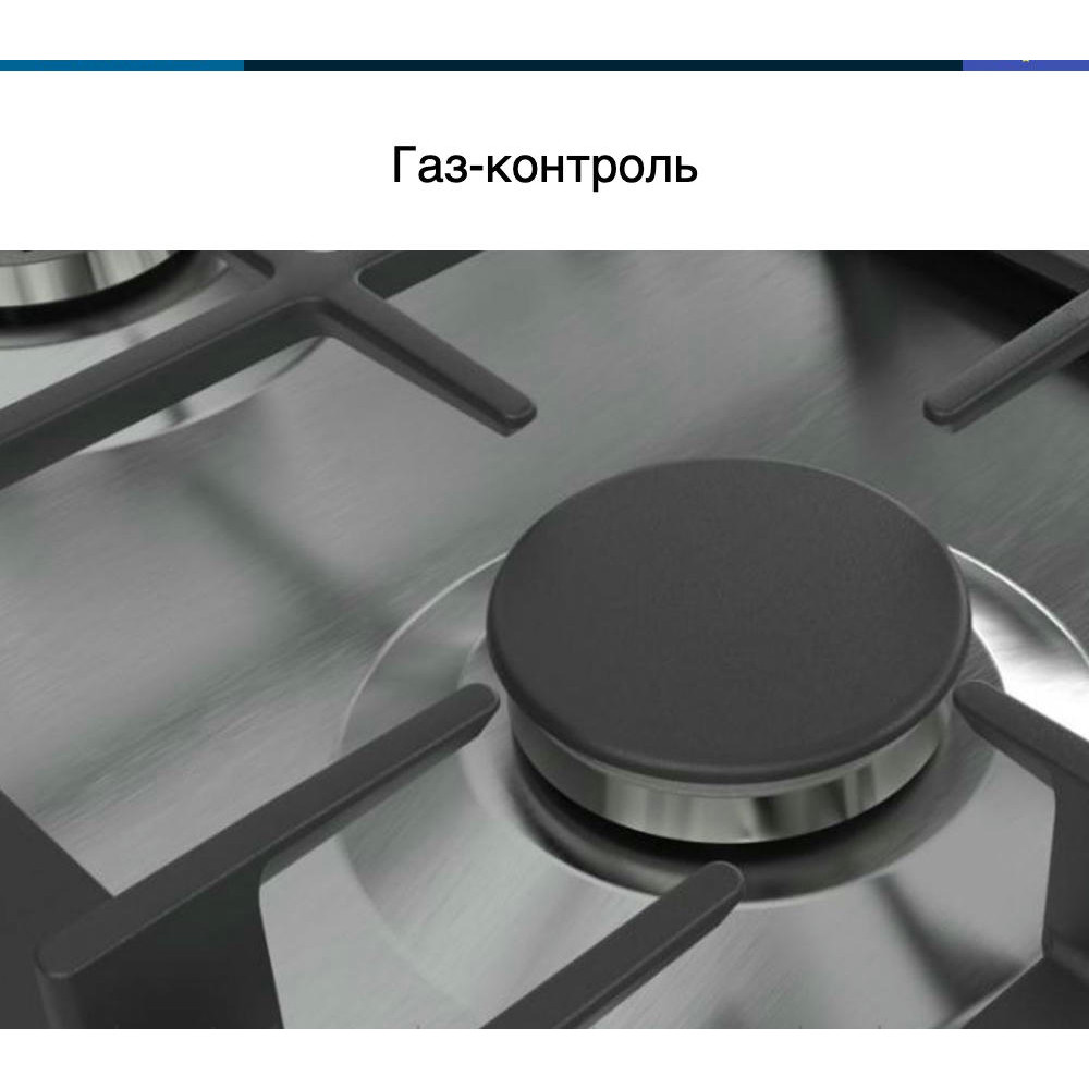 Безопасную эксплуатацию газовой варочной панели Бош PСP6А5B90R осуществляет система газ-контроль, которая подразумевает, что благодаря специальным датчику и клапану при случайном угасании огня газ мгновенно блокируется и перестает поступать — утечка предотвращена. Также важно заметить, что оборудование обладает удобными габаритами для встраивания, и оно не займет много места на вашей кухни: высота — 4,5 см, ширина — 58,2 см, глубина — 52 см.