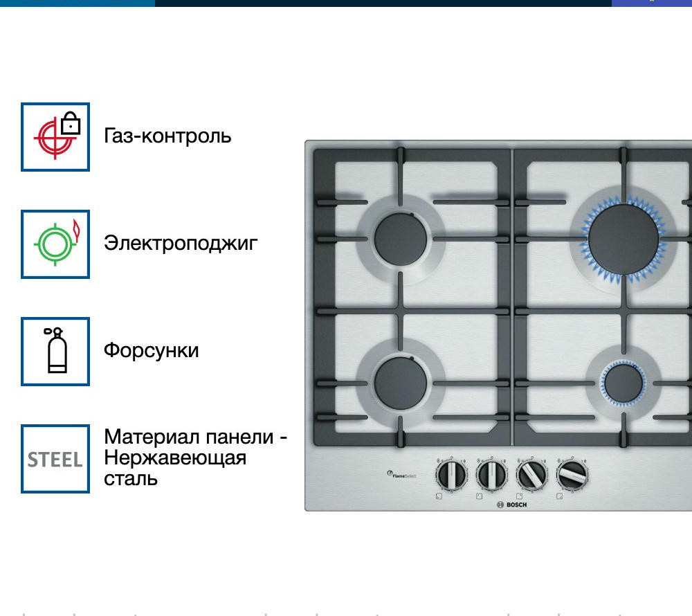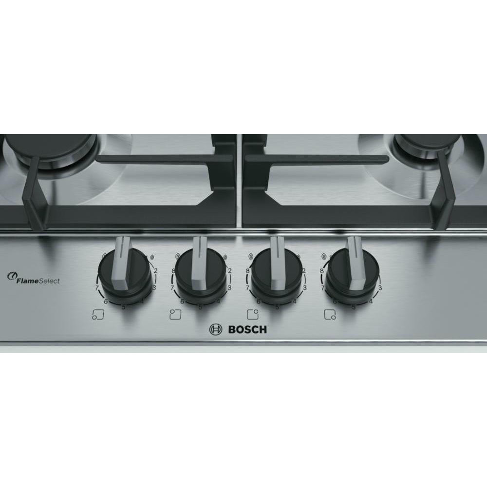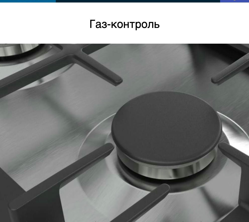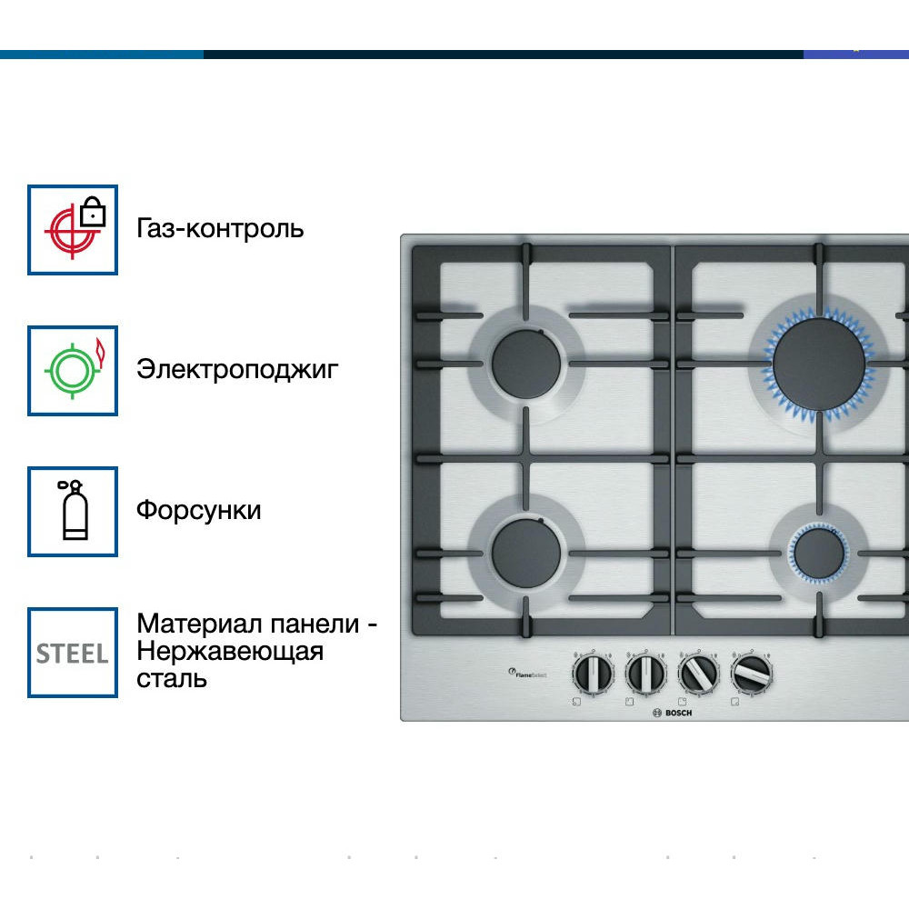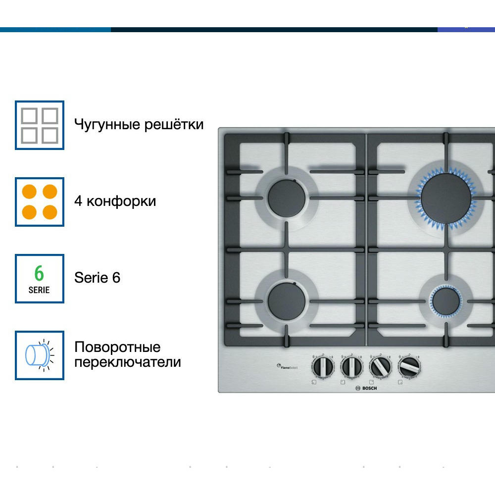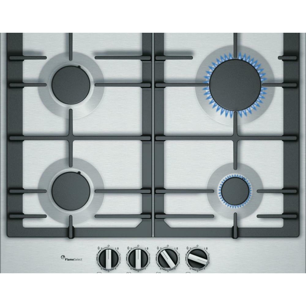 Безопасную эксплуатацию газовой варочной панели Бош PСP6А5B90R осуществляет система газ-контроль, которая подразумевает, что благодаря специальным датчику и клапану при случайном угасании огня газ мгновенно блокируется и перестает поступать — утечка предотвращена. Также важно заметить, что оборудование обладает удобными габаритами для встраивания, и оно не займет много места на вашей кухни: высота — 4,5 см, ширина — 58,2 см, глубина — 52 см.
