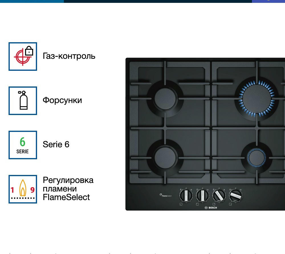 Газ-контроль подразумевает, что благодаря специальным датчику и клапану при случайном угасании огня газ мгновенно блокируется и перестает поступать — утечка предотвращена. Варочная панель Бош PСP6А6B95R имеет механический тип управления. Для переключения уровней нагрева, выбора конфорки используются поворотные переключатели. Простая система контроля за прибором делает его более универсальным, разобраться сможет абсолютно каждый человек.