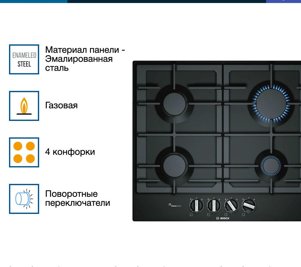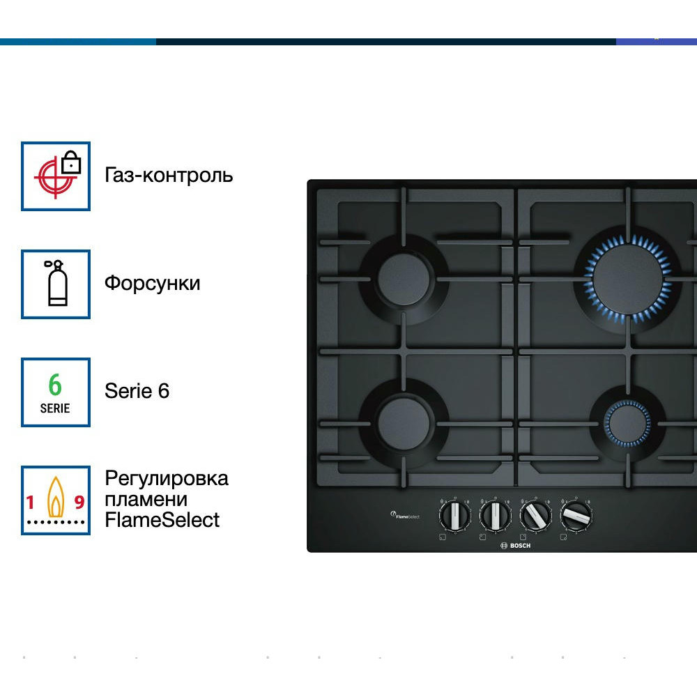 Варочная панель Bosch PСP6А6B95R имеет современный внешний вид, представленный в черном цвете. Такой дизайн модели подойдет к любой кухне. С ее помощью вы можете не тратить много сил во время приготовления пищи, ведь поверхность включает в себя большой функционал. Ее габариты встраивания достаточно удобны: высота — 4,5 см, ширина — 58,2 см, глубина — 52 см.