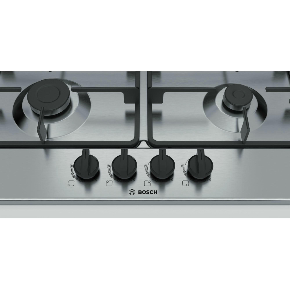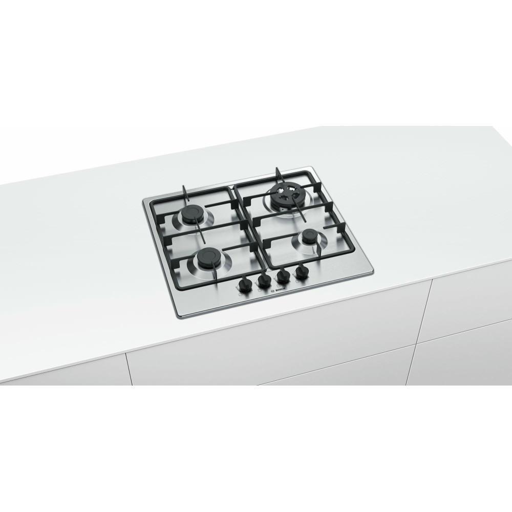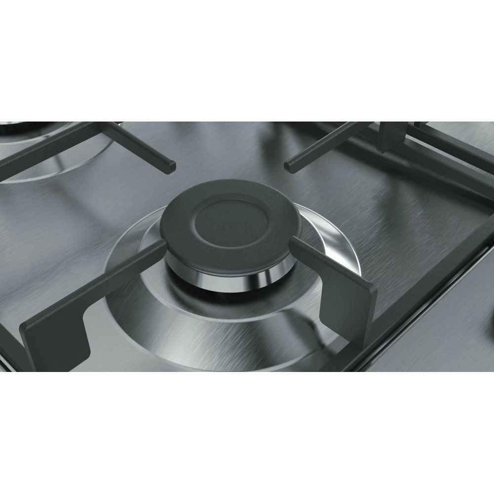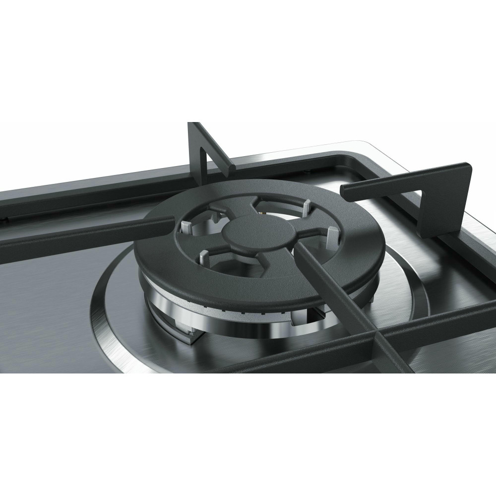 Варочная панель Bosch PGH6B5B60 — четырехконфорочная модель с зоной WOK. На поверхности из нержавеющей стали находятся две решетки с чугунным покрытием и резиновыми ножками, которые надежно удерживают посуду.