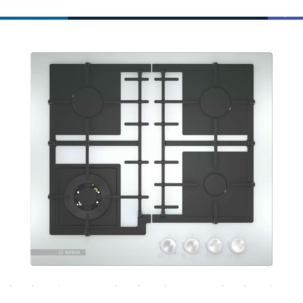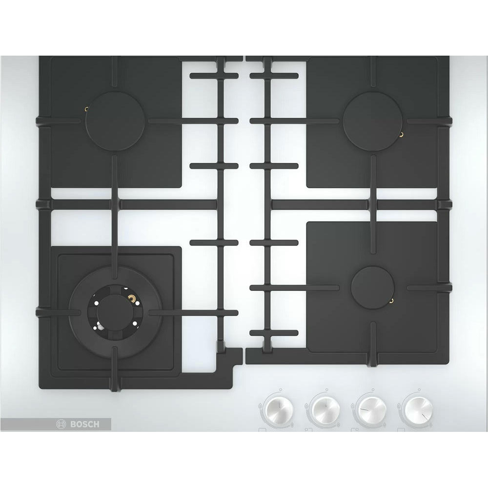 Варочная панель Bosch PNH6B2O92R выполнена в белом цвете и дополнена решетками и конфорками черного цвета. Товар представлен из устойчивой к выгоранию и царапинам закаленного стекла, а съемные подставки для посуды — из чугуна.