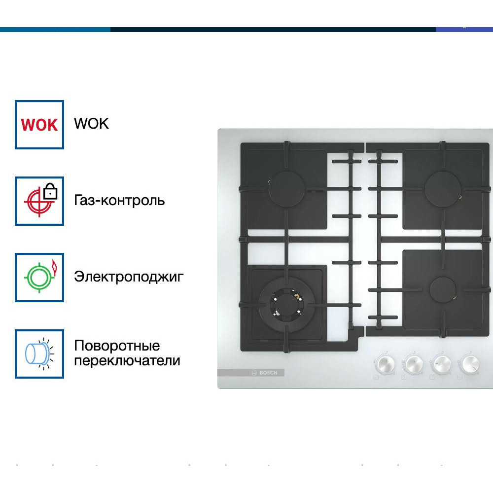 Газовая модель имеет механический тип управления. Использование поворотных переключателей для работы с товаром повышает комфорт использования. Разобраться с эксплуатацией варочной панели Бош PNH6B2O92R сможет абсолютно каждый человек.
