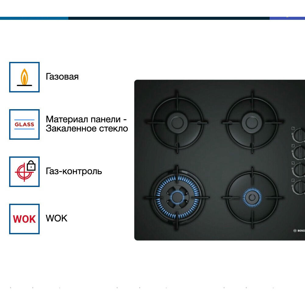Газовая варочная поверхность Бош POH6B6B10 оснащена системой газ-контроль — это технология, которая позволяет исключить утечку газа. Механизм с датчиком отключает подачу топлива всякий раз, когда огонь в горелке тухнет. Время отмены подачи топлива варьируется в зависимости от модели и производителя и обычно составляет порядка пяти секунд.