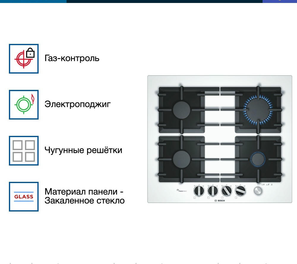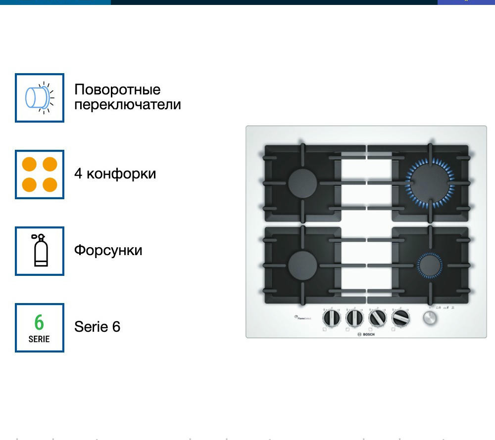 Техника укомплектована четырьмя разноразмерными горелками, активация которых осуществляется по системе автоматического электроподжига. Главный выключатель одним нажатием кнопки перекрывает подачу газа на всех конфорках. Варочную панель Бош PPP6A2M90R можно встраивать как над столешницей, так и вровень с ней. Механические фронтальные поворотные переключатели позволяют выбрать один из 9 уровней мощности пламени. Стильная раздельная чугунная решетка легко снимается, ее можно мыть под краном. В комплект входят форсунки для подключения к баллонному газу. Дополнительно можно приобрести насадку Wok и насадку для кофеварки.