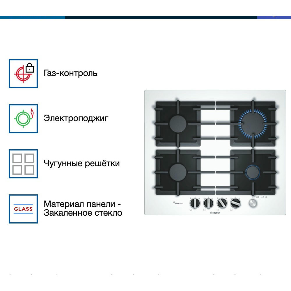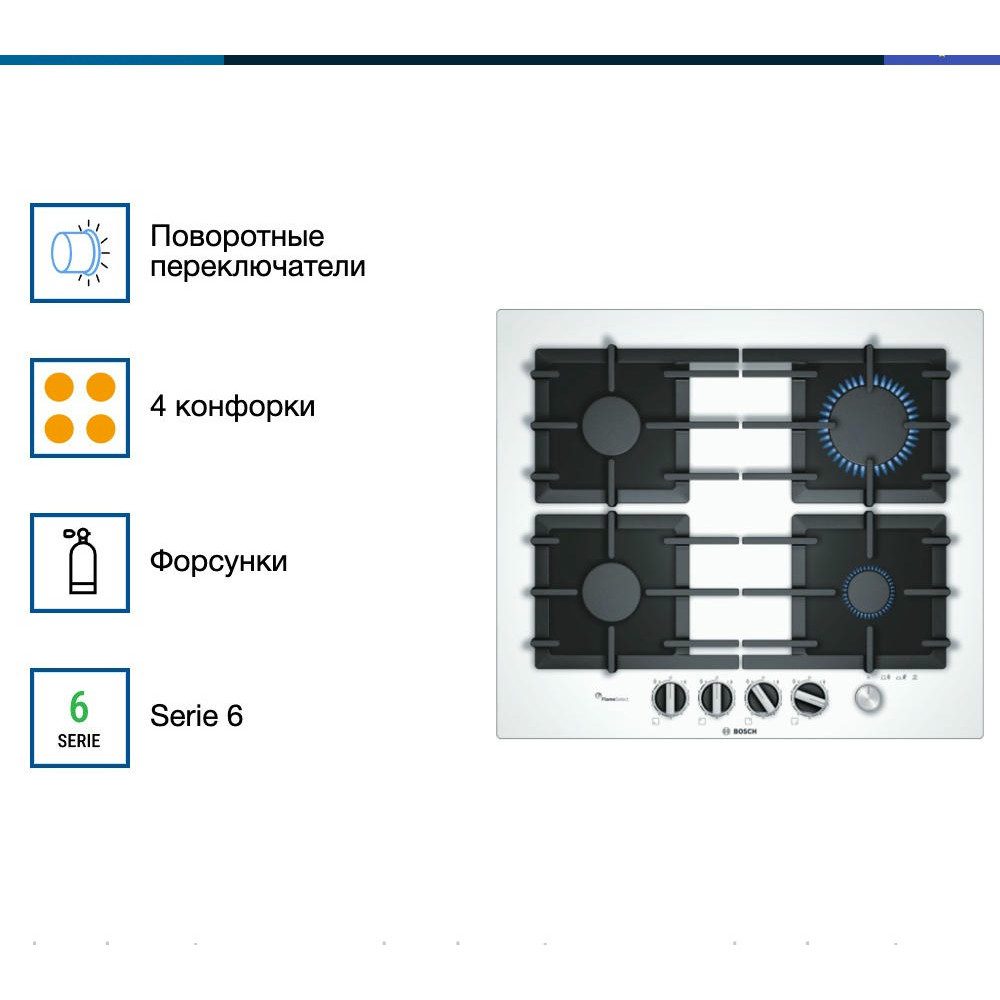 Варочная панель Bosch PPP6A2M90R независимая варочная поверхность, изготовленная из закаленного стекла HardGlass. Белое стекло удачно сочетается с черным цветом конфорок и массивной составной решеткой оригинальной формы. Устройство относится к дизайн-линии, которую отличает особая элегантность и удобство в управлении. Еще одна ее особенность — инновационные технологии. Модель оснащена функцией FlameSelect, позволяющей достигать лучших результатов приготовления. В соответствии с ней каждый из уровней мощности соответствует определенному способу приготовления, от бережного тушения до кипячения.