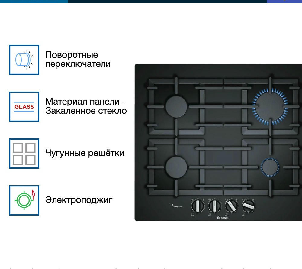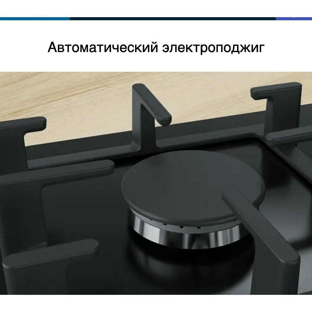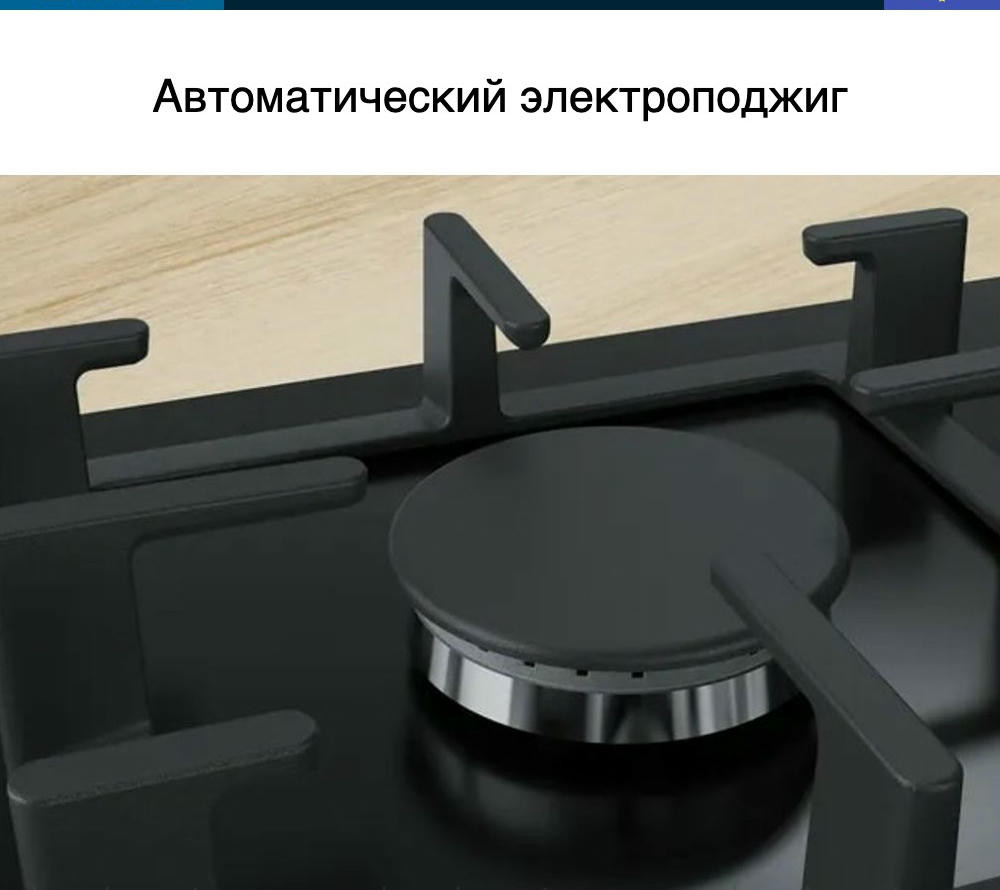 Электроподжиг существенно экономит время и нервы хозяев квартиры, не требует наличия спичек или зажигалки, безопасно и максимально удобно. Эта функция полностью исключает возможность получения ожога при зажигании. Механизм срабатывания за счёт нажатия кнопки. У газовой варочной поверхности Бош PPP6A6B90 предусмотрена система газ-контроля, обеспечивающая ее безопасную эксплуатацию. Для включения конфорок и регулировки мощности пламени в них предусмотрены поворотные переключатели со встроенным электроподжигом. Причем у каждой конфорки имеется 9 степеней мощности, что позволит выбирать наиболее подходящую под каждое конкретное блюдо. Благодаря этому еда будет получаться вкусной и полезной.