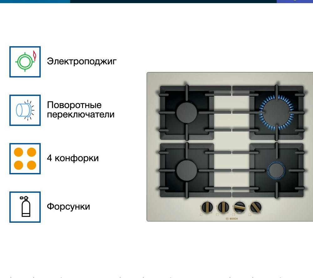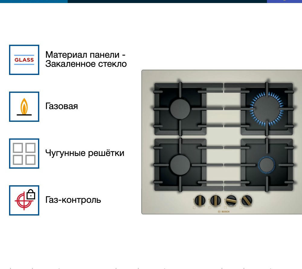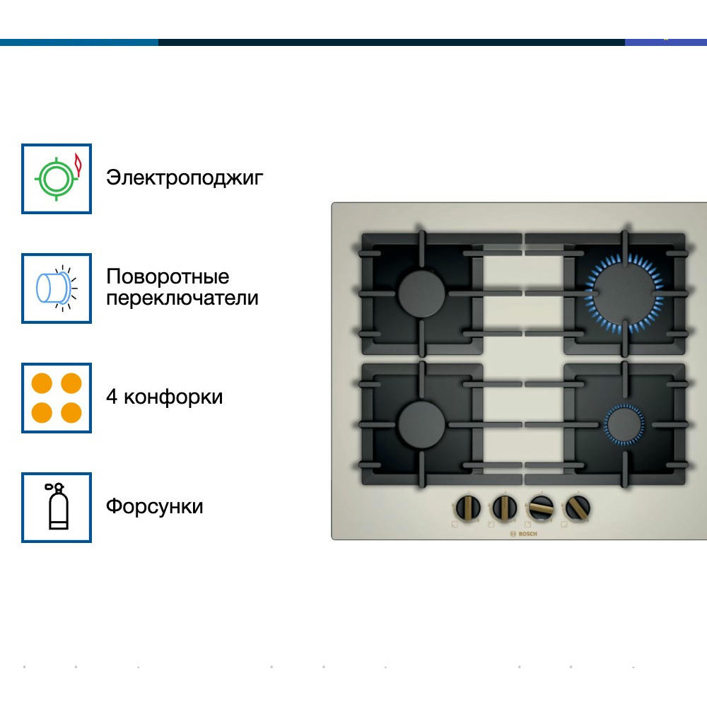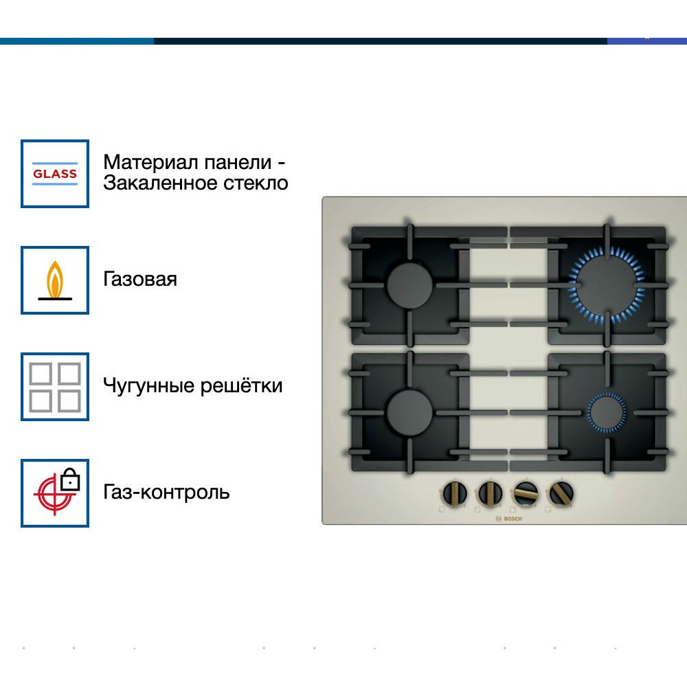 Варочная панель Bosch PPP6В190R гармонично впишется в интерьер кухни, оформленной в классическом стиле или в духе прованс. Она изготовлена из закаленного стекла, а решетки — из чугуна. Это прочные материалы, за которыми просто ухаживать.