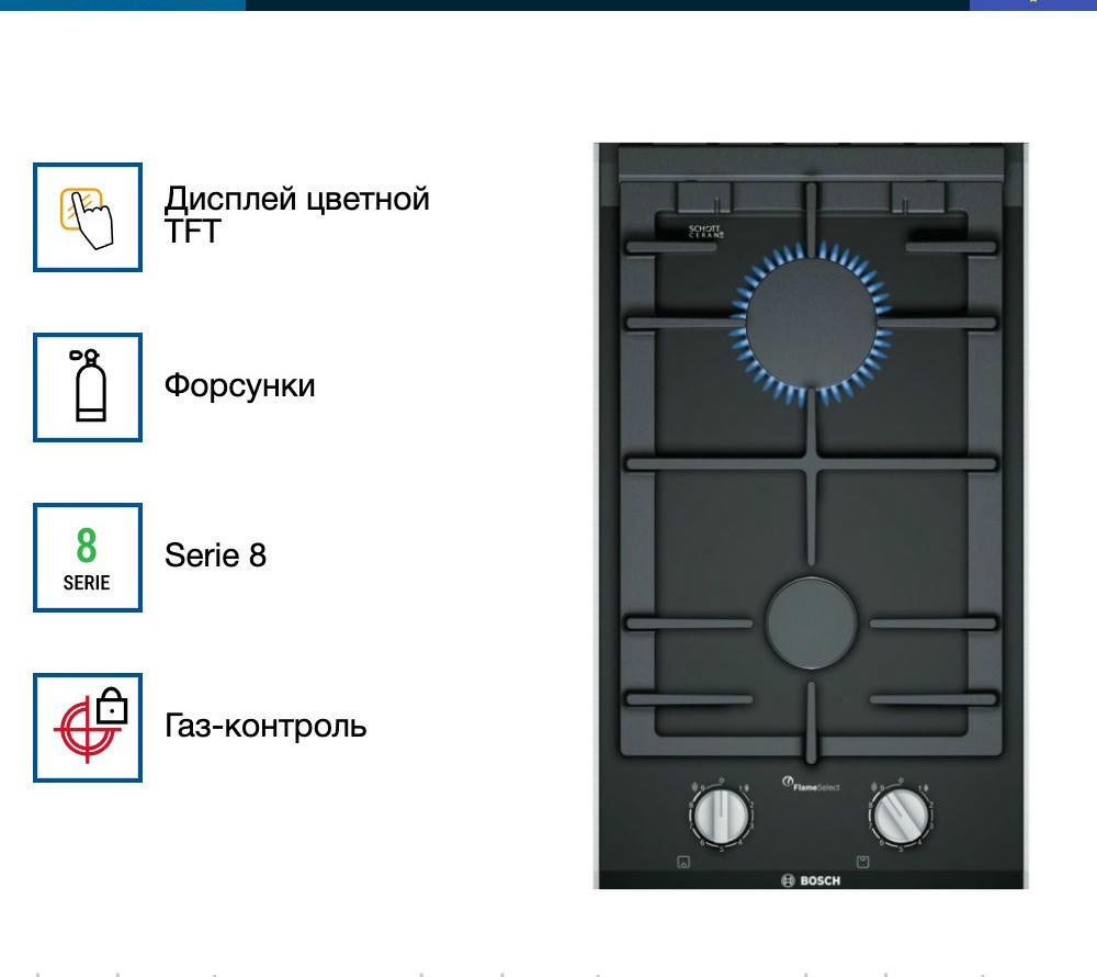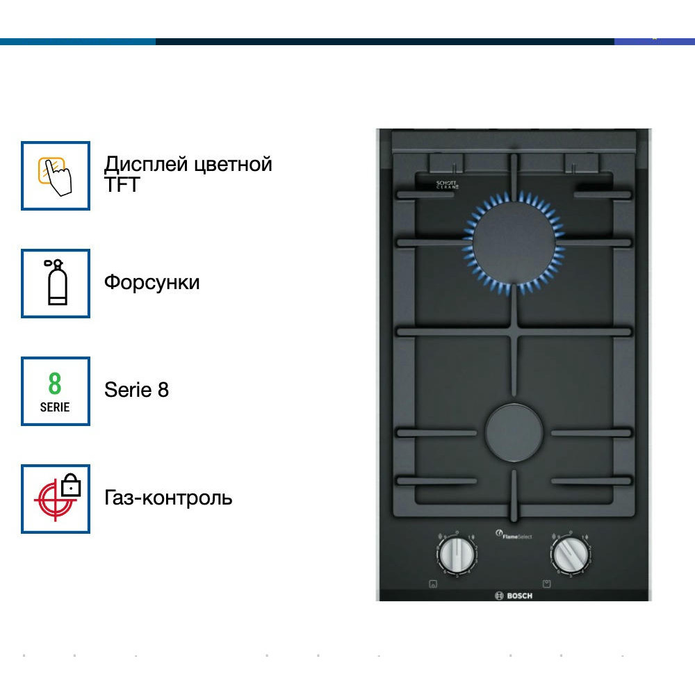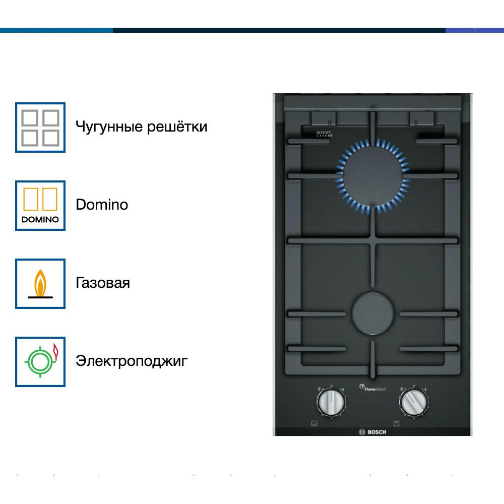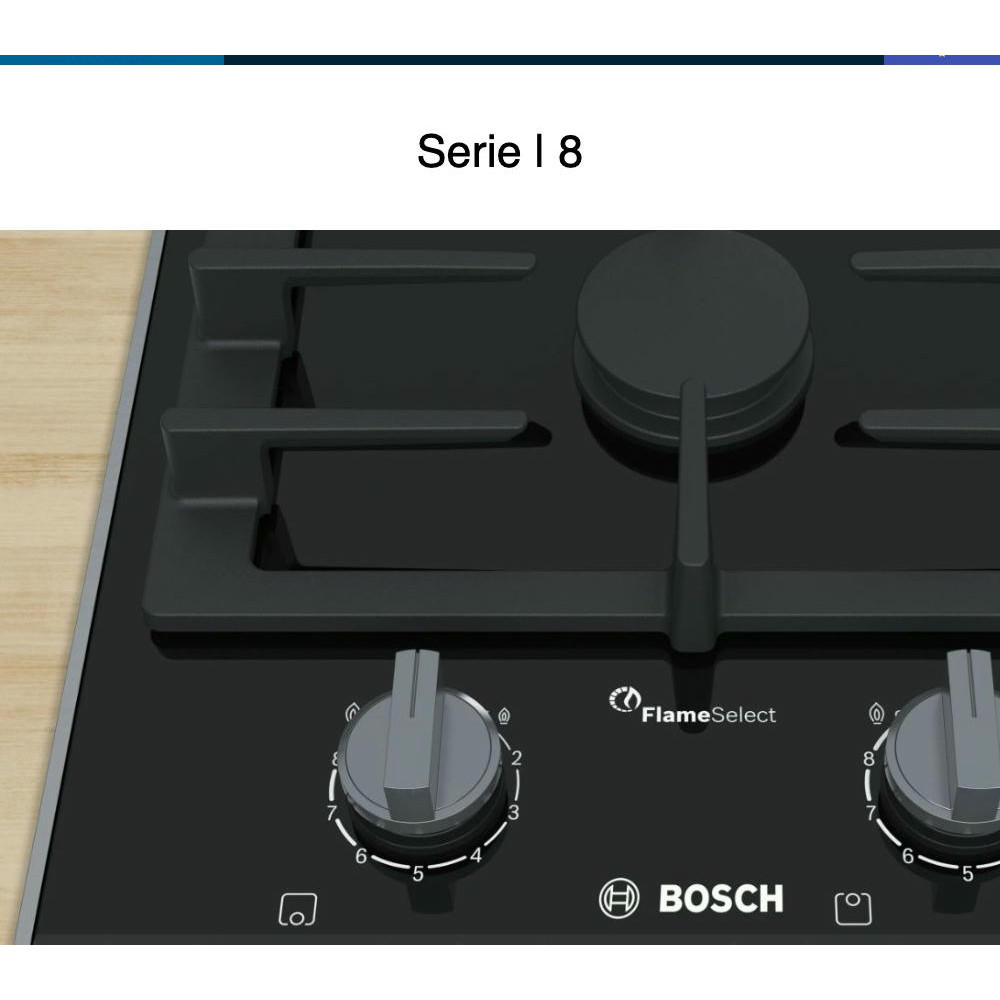 Варочная панель Bosch PRB3A6B70 представлена в черном цвете материал поверхности стеклокерамика. Имеется автоматический электроподжиг, он включается при повороте регулятора мощности. Есть защита при затухании пламя подача газа прекратится.