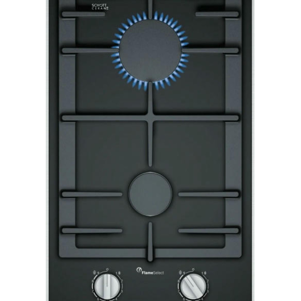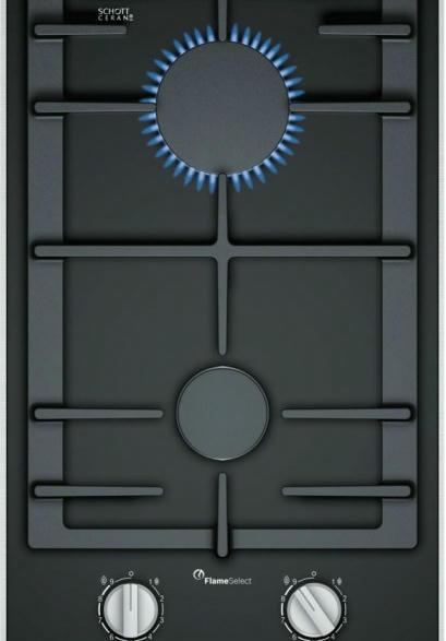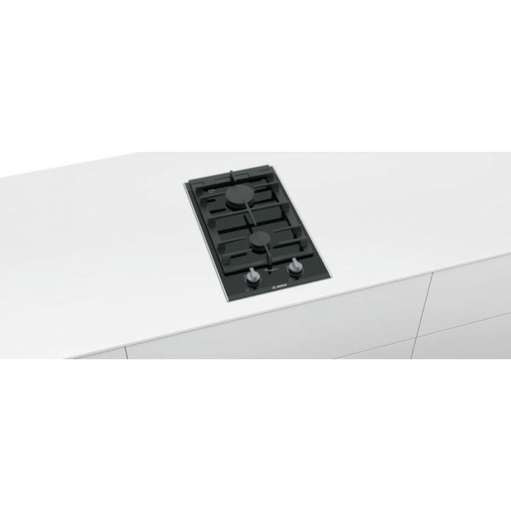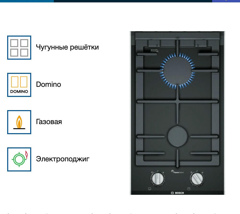 Варочная панель Bosch PRB3A6B70 представлена в черном цвете материал поверхности стеклокерамика. Имеется автоматический электроподжиг, он включается при повороте регулятора мощности. Есть защита при затухании пламя подача газа прекратится.