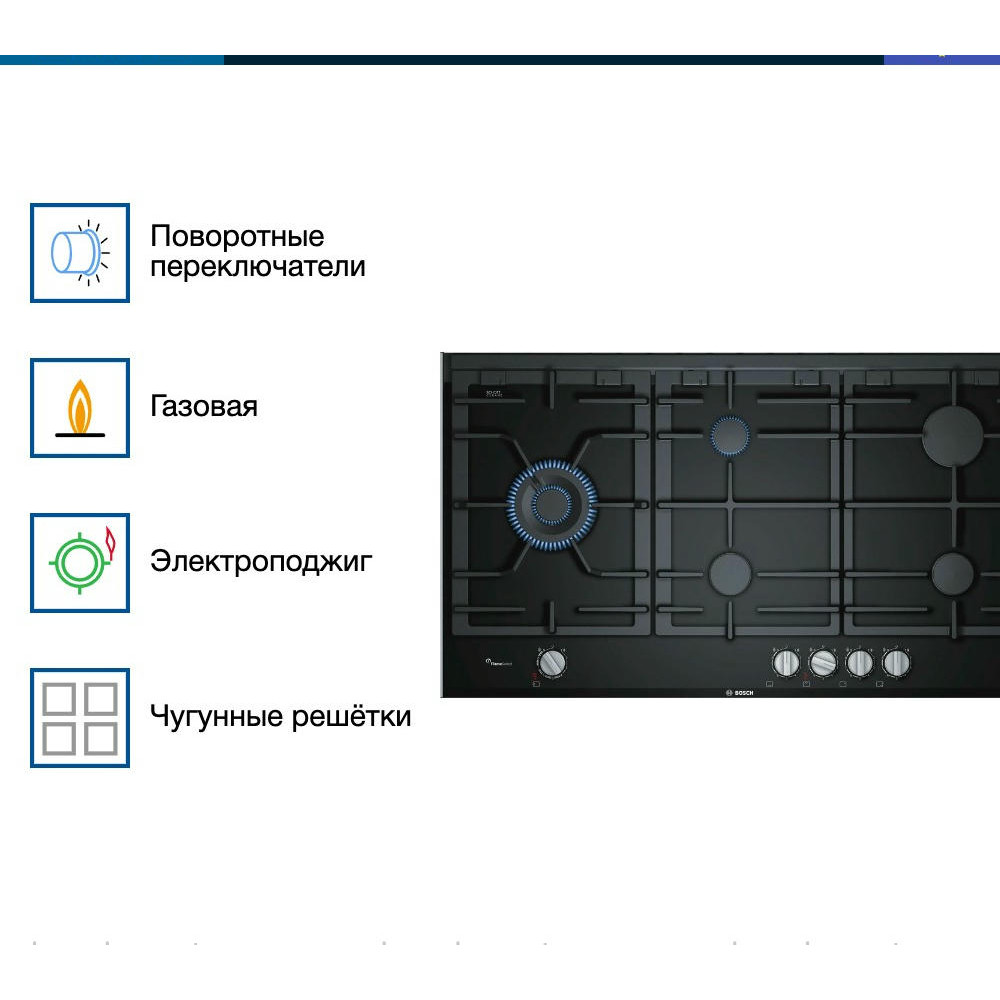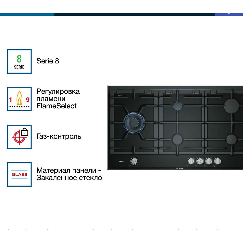 Встраиваемая газовая панель Bosch PRS9A6D70M из серии Serie | 8 - это сочетание элегантного дизайна и высокой функциональности. Она выполнена в строгом черном цвете, что делает ее универсальным элементом для любого интерьера кухни. Поверхность панели изготовлена из закаленного стекла, что обеспечивает ее долговечность и легкость в уходе. Чугунные решетки добавляют устройству прочности и надежности.