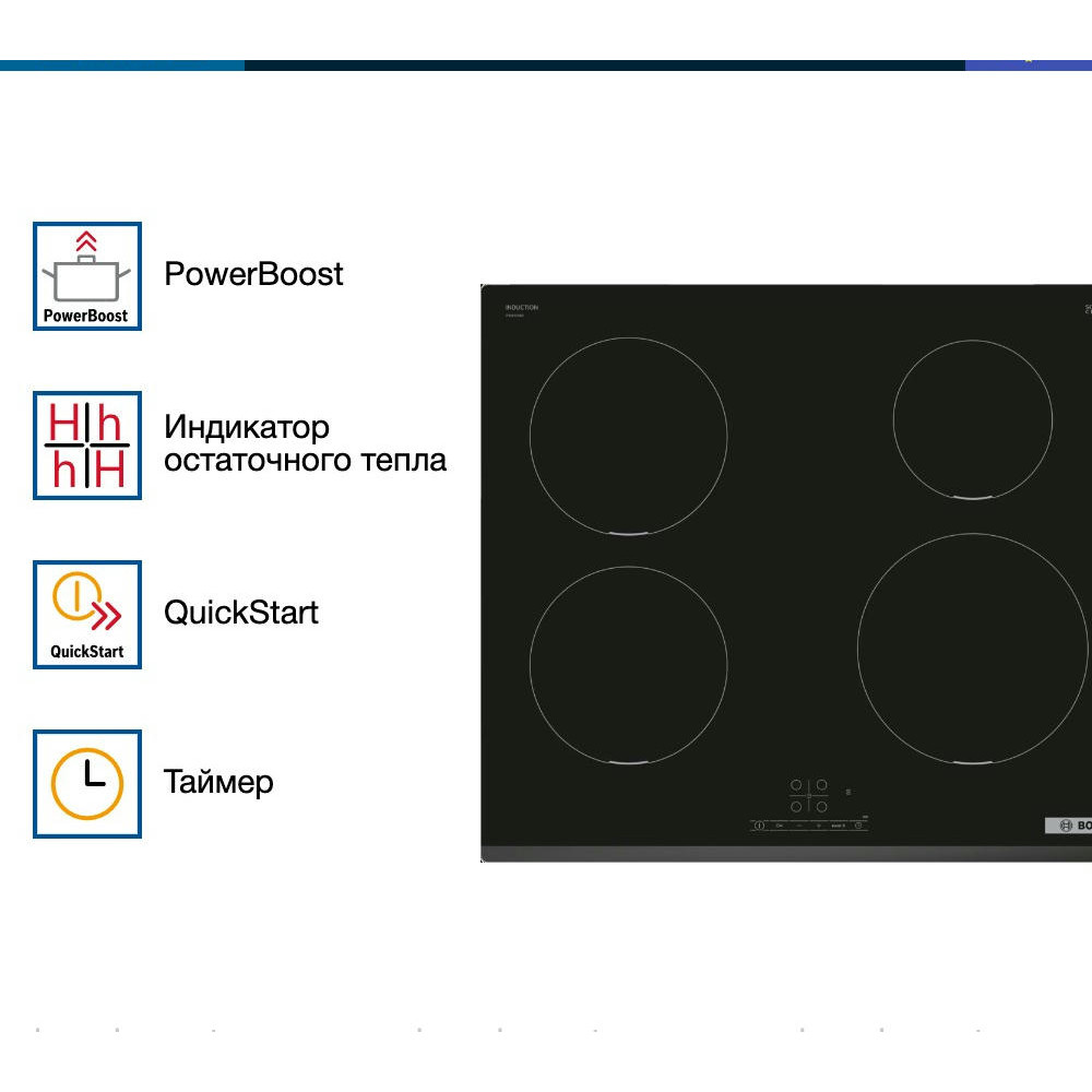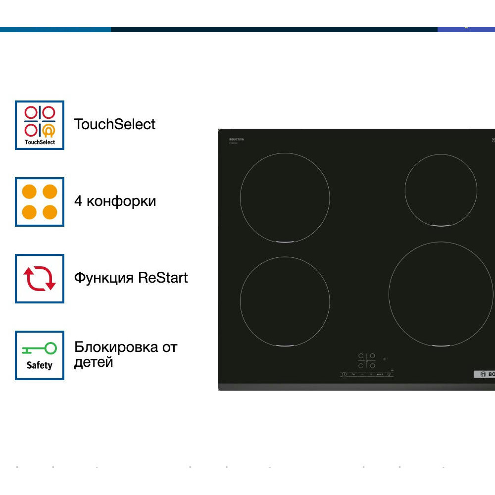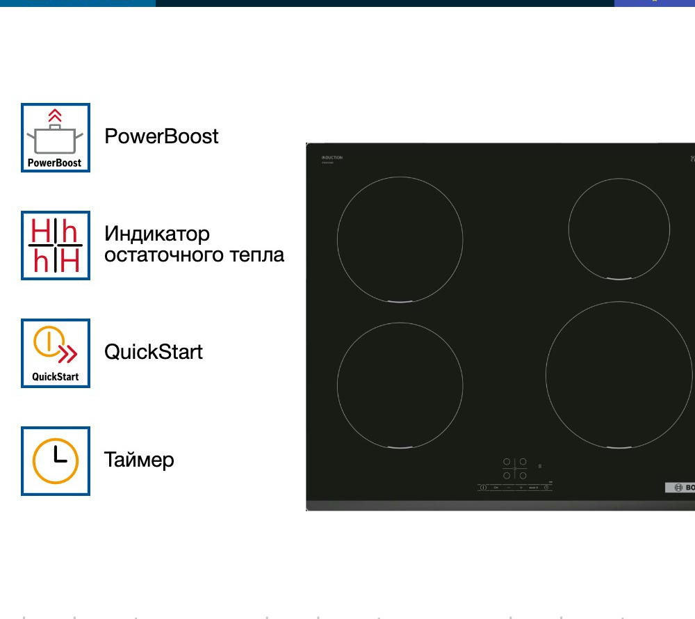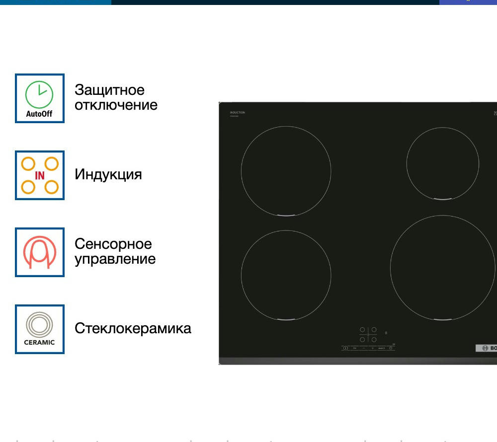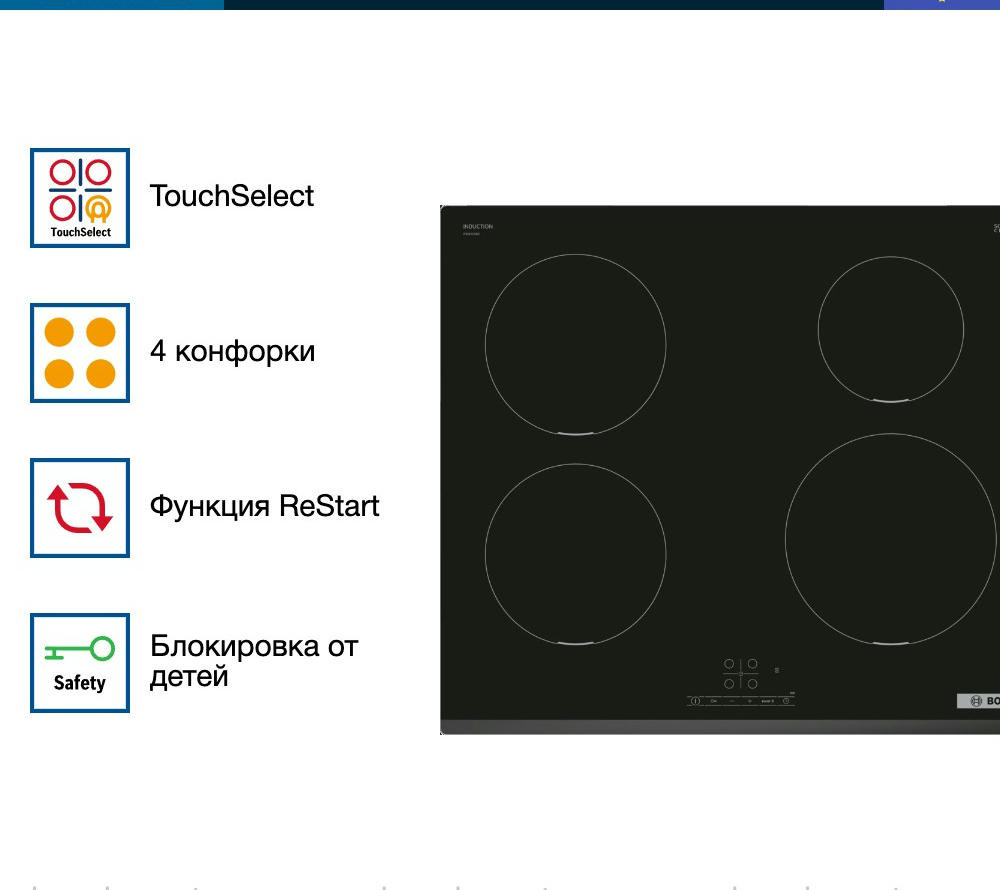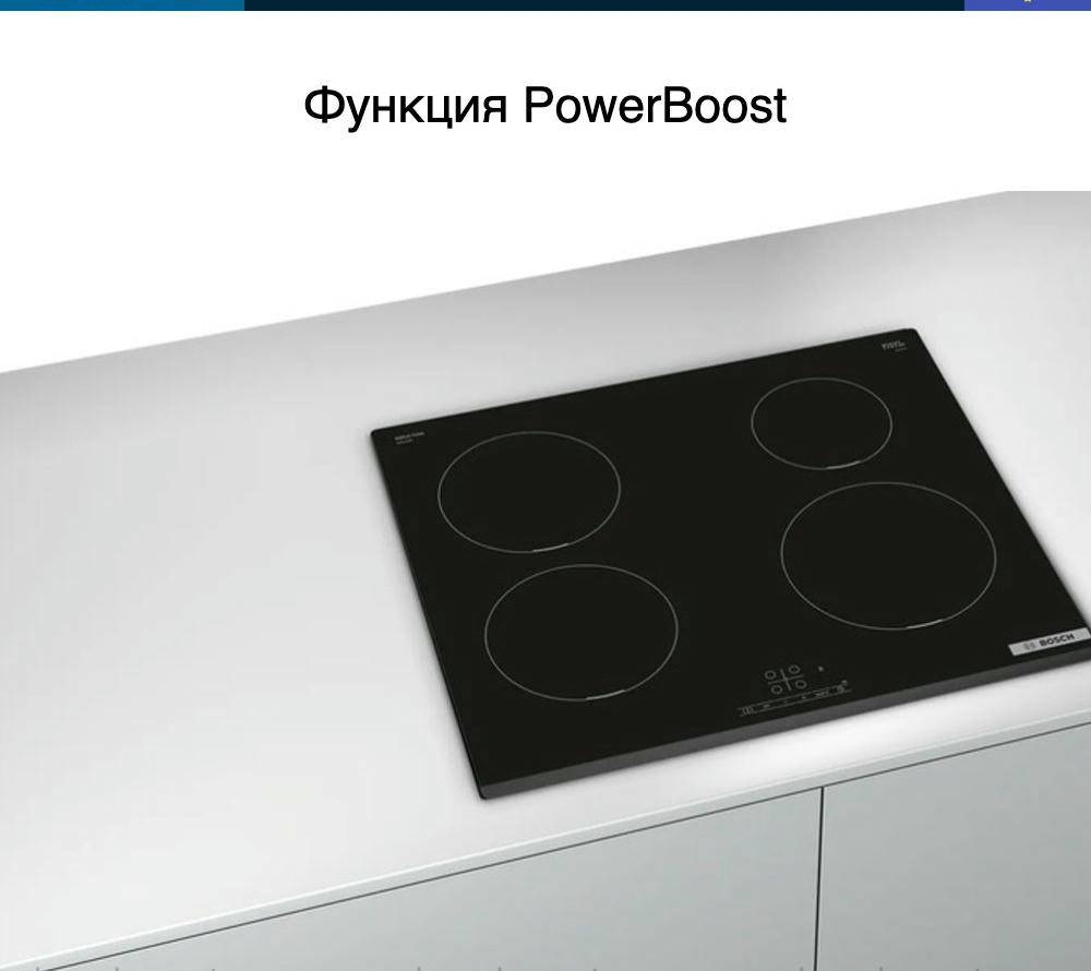 Варочная панель Bosch PIE 631BB5E оснащена таймером, который отключает выбранную конфорку по истечение времени. «Блокировка от детей» поможет от случайного нажатия. При внезапном отключении поможет функция памяти заданных настроек, при повторном включении все заданные параметры восстановятся.